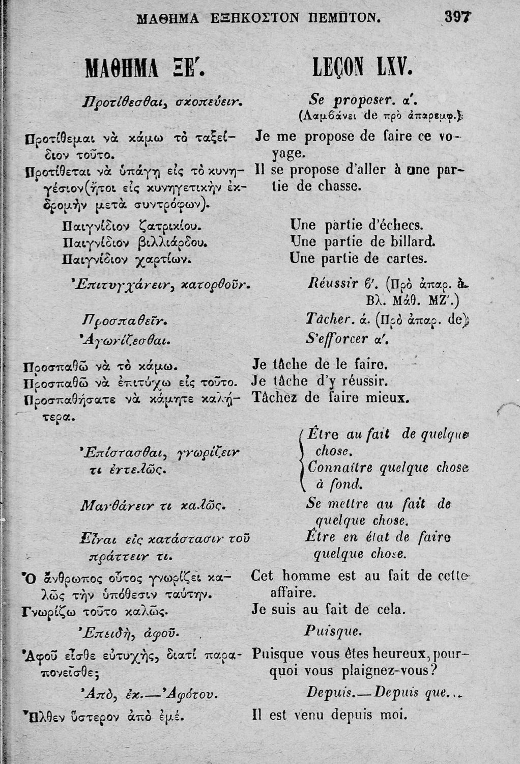 Σχολικό εγχειρίδιο Γαλλικών που περιλαμβάνει κείμενα, λεξιλόγιο και ασκήσεις. Ο συγγραφέας ήταν καθηγητής της Δημόσιας Εμπορικής Σχολής Αθηνών και του Αρσακείου.