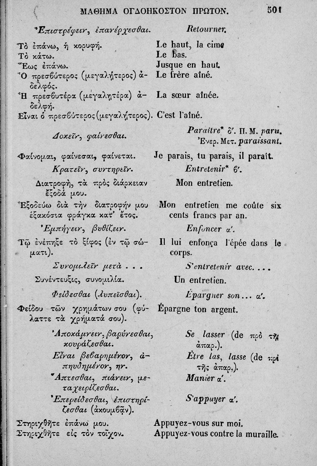 Σχολικό εγχειρίδιο Γαλλικών που περιλαμβάνει κείμενα, λεξιλόγιο και ασκήσεις. Ο συγγραφέας ήταν καθηγητής της Δημόσιας Εμπορικής Σχολής Αθηνών και του Αρσακείου.