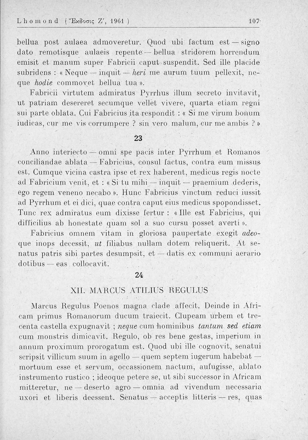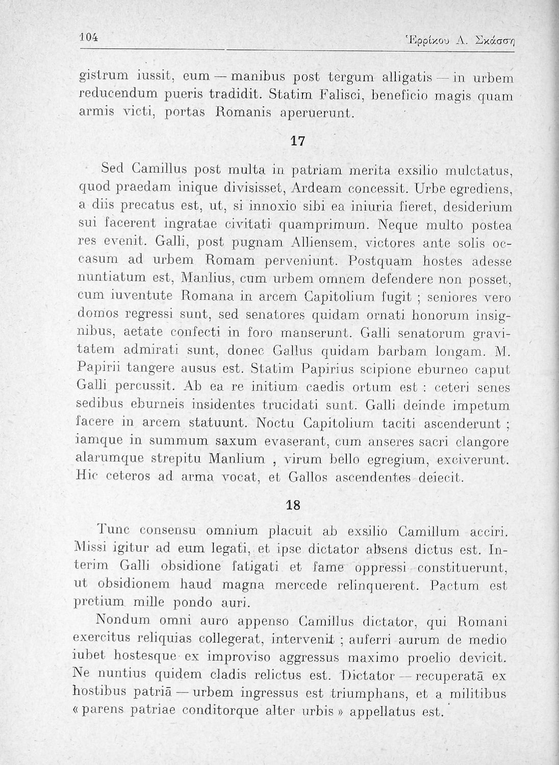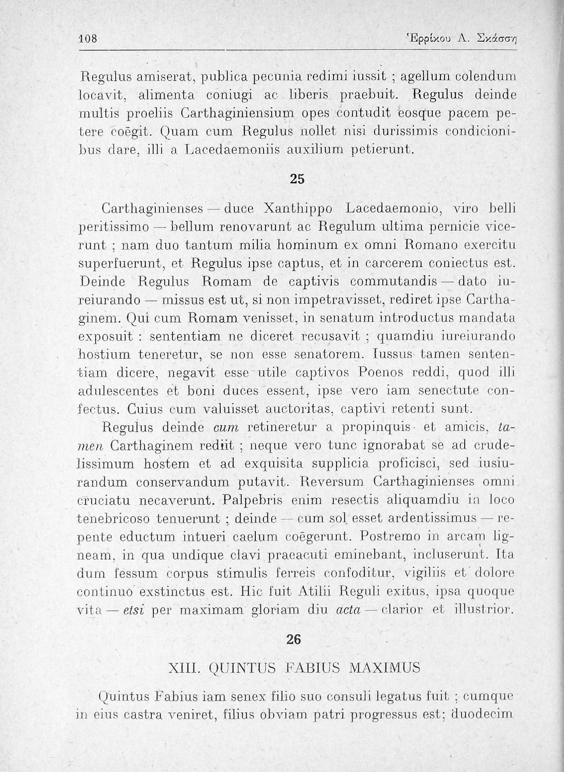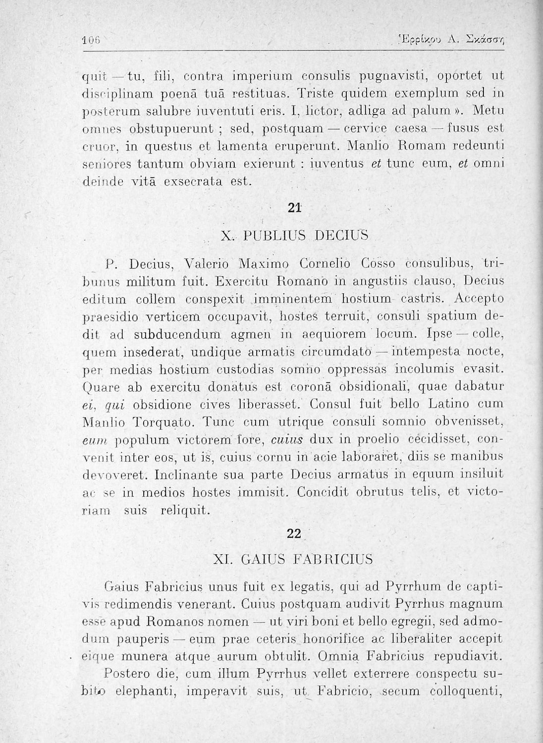 Αναγνωστικό Λατινικών για τη Γ΄ Γυμνασίου που περιέχει 54 κείμενα/περικοπές στα λατινικά, ερμηνευτικά υπομνήματα, λεξιλόγιο και κατάλογο με τα συντακτικά φαινόμενα (αφαιρετική, προθέσεις, σύνδεσμοι) που διδάσκονται με βάση τις περικοπές. Αναγνωστικό Λατινικών που περιέχει σύντομο βιογραφικό σημείωμα του Lhomond, 64 αποσπάσματα από το Σχολικό εγχειρίδιο του, ερμηνευτικές σημειώσεις και λεξιλόγιο. Παρουσιάζει βίους επιφανών Ρωμαίων από το 753 π.Χ μέχρι το 14 μ.Χ. Ο επιμελητής ήταν καθηγητής της Λατινικής Φιλολογίας στο Πανεπιστήμιο Αθηνών.