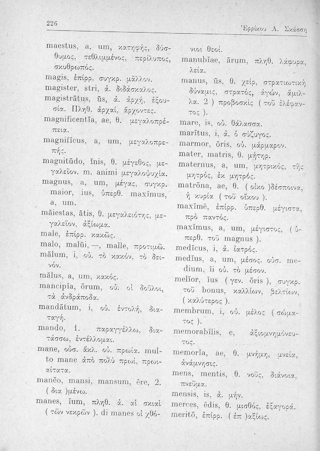 Αναγνωστικό Λατινικών για τη Γ΄ Γυμνασίου που περιέχει 54 κείμενα/περικοπές στα λατινικά, ερμηνευτικά υπομνήματα, λεξιλόγιο και κατάλογο με τα συντακτικά φαινόμενα (αφαιρετική, προθέσεις, σύνδεσμοι) που διδάσκονται με βάση τις περικοπές. Αναγνωστικό Λατινικών που περιέχει σύντομο βιογραφικό σημείωμα του Lhomond, 64 αποσπάσματα από το Σχολικό εγχειρίδιο του, ερμηνευτικές σημειώσεις και λεξιλόγιο. Παρουσιάζει βίους επιφανών Ρωμαίων από το 753 π.Χ μέχρι το 14 μ.Χ. Ο επιμελητής ήταν καθηγητής της Λατινικής Φιλολογίας στο Πανεπιστήμιο Αθηνών.