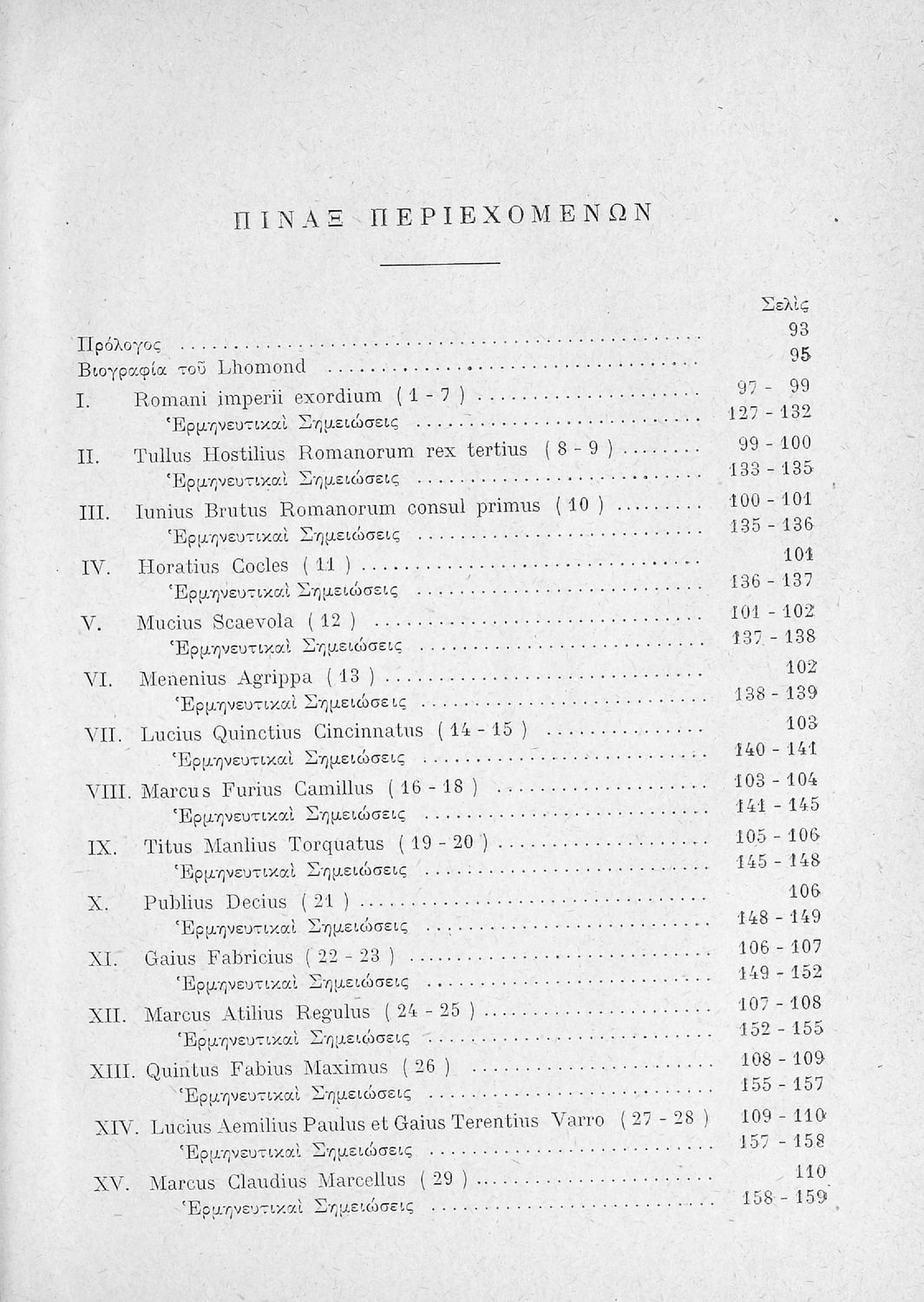 Αναγνωστικό Λατινικών για τη Γ΄ Γυμνασίου που περιέχει 54 κείμενα/περικοπές στα λατινικά, ερμηνευτικά υπομνήματα, λεξιλόγιο και κατάλογο με τα συντακτικά φαινόμενα (αφαιρετική, προθέσεις, σύνδεσμοι) που διδάσκονται με βάση τις περικοπές. Αναγνωστικό Λατινικών που περιέχει σύντομο βιογραφικό σημείωμα του Lhomond, 64 αποσπάσματα από το Σχολικό εγχειρίδιο του, ερμηνευτικές σημειώσεις και λεξιλόγιο. Παρουσιάζει βίους επιφανών Ρωμαίων από το 753 π.Χ μέχρι το 14 μ.Χ. Ο επιμελητής ήταν καθηγητής της Λατινικής Φιλολογίας στο Πανεπιστήμιο Αθηνών.