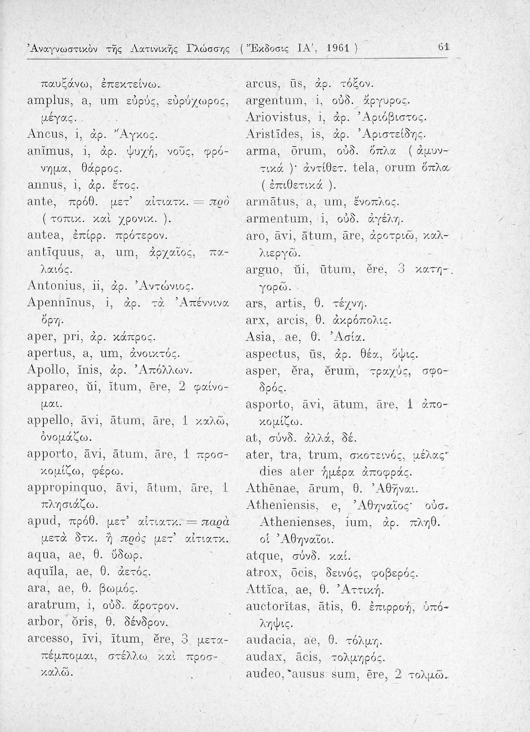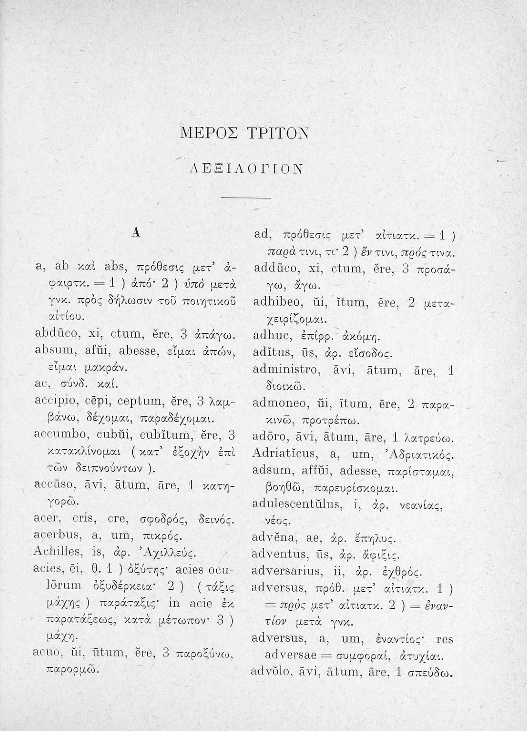 Σχολικό εγχειρίδιο Λατινικών για τη Γ΄ Γυμνασίου που περιέχει 54 κείμενα/περικοπές στα λατινικά, ερμηνευτικά υπομνήματα, λεξιλόγιο και κατάλογο με τα συντακτικά φαινόμενα (αφαιρετική, προθέσεις, σύνδεσμοι) που