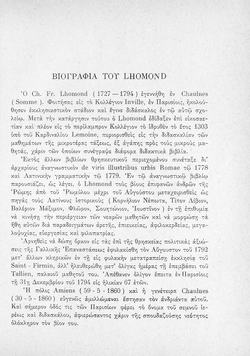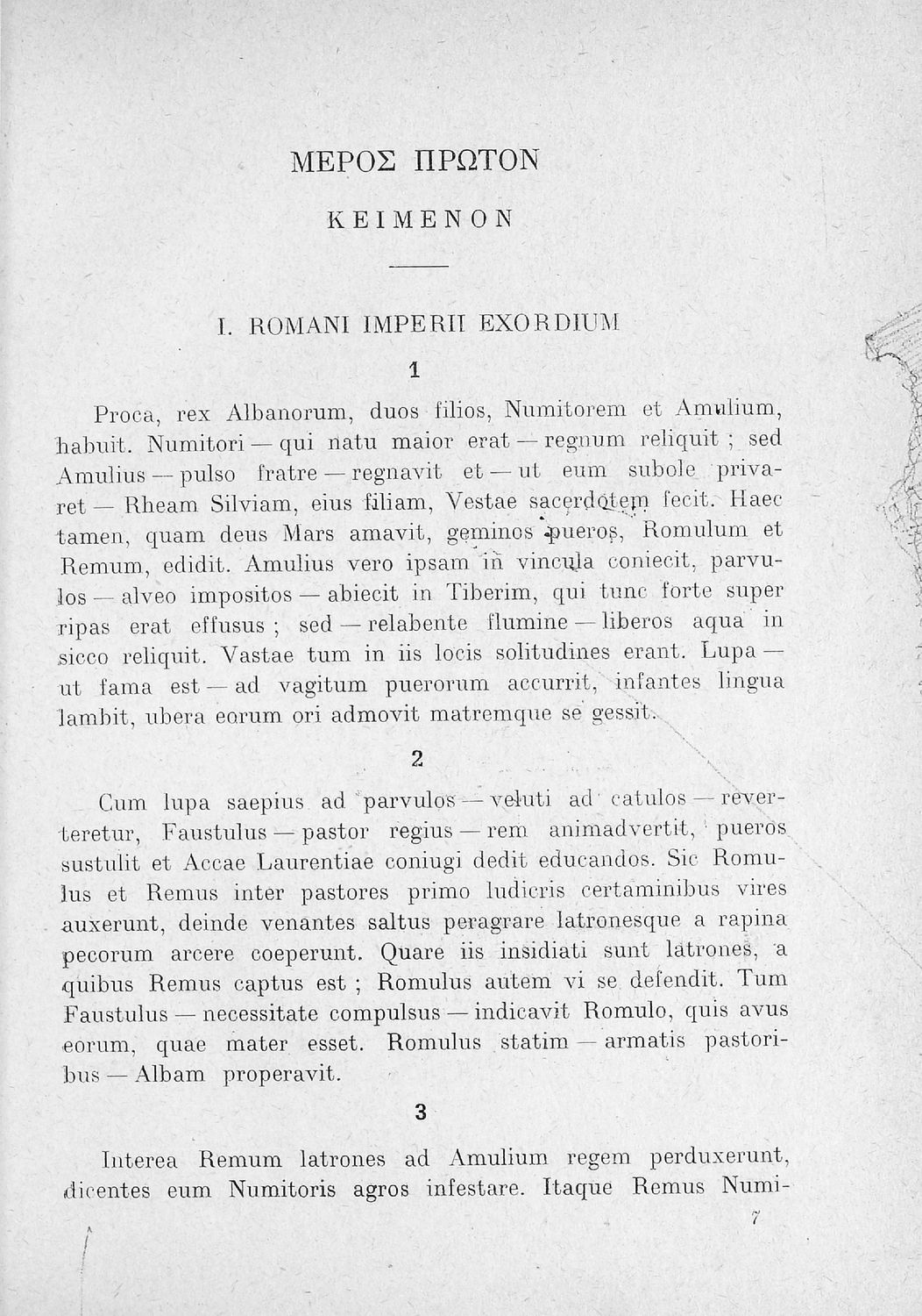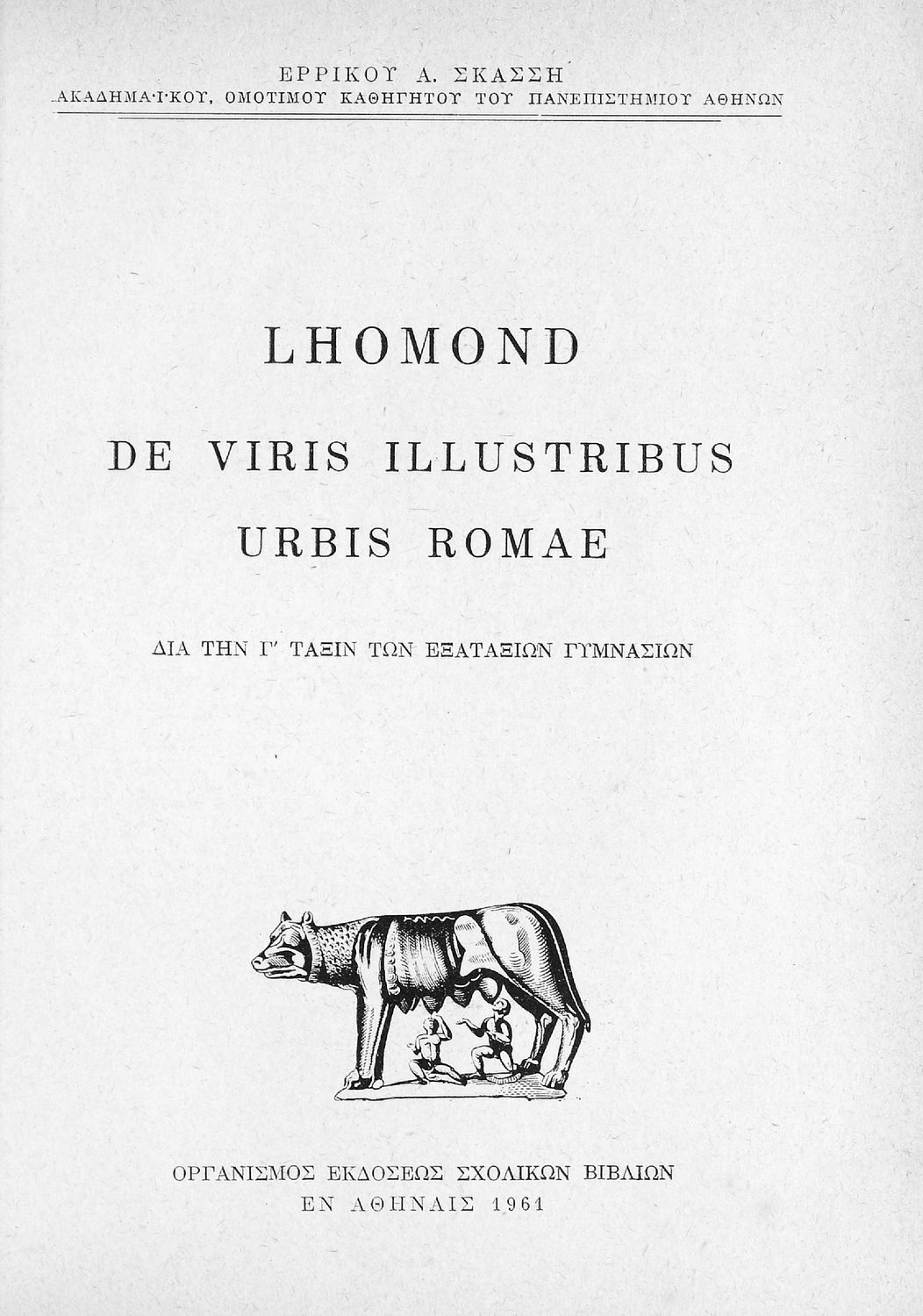 Αναγνωστικό Λατινικών για τη Γ΄ Γυμνασίου που περιέχει 54 κείμενα/περικοπές στα λατινικά, ερμηνευτικά υπομνήματα, λεξιλόγιο και κατάλογο με τα συντακτικά φαινόμενα (αφαιρετική, προθέσεις, σύνδεσμοι) που διδάσκονται με βάση τις περικοπές. Αναγνωστικό Λατινικών που περιέχει σύντομο βιογραφικό σημείωμα του Lhomond, 64 αποσπάσματα από το Σχολικό εγχειρίδιο του, ερμηνευτικές σημειώσεις και λεξιλόγιο. Παρουσιάζει βίους επιφανών Ρωμαίων από το 753 π.Χ μέχρι το 14 μ.Χ. Ο επιμελητής ήταν καθηγητής της Λατινικής Φιλολογίας στο Πανεπιστήμιο Αθηνών.