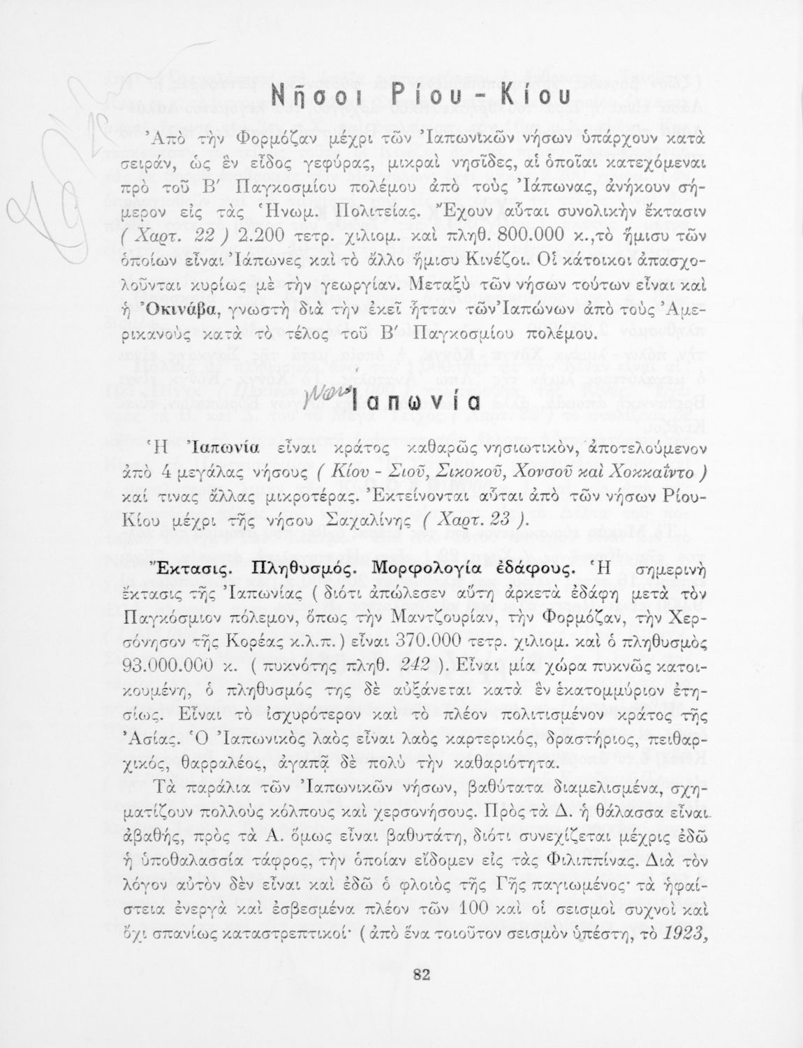 Βαθμίδα εκπαίδευσης: Δευτεροβάθμια Τάξη: Γ' Γυμνασίου Μάθημα: Γεωγραφία Γλώσσα: Απλή καθαρεύουσα Παρουσίαση περιεχομένου: Σχολικό εγχειρίδιο Γεωγραφίας Γ΄ Γυμνασίου που παρουσιάζει τα γενικά πολιτικά, οικονομικά και γεωφυσικά χαρακτηριστικά των ηπείρων πλην της Ευρώπης και εξετάζει ενδεικτικές χώρες και περιοχές |