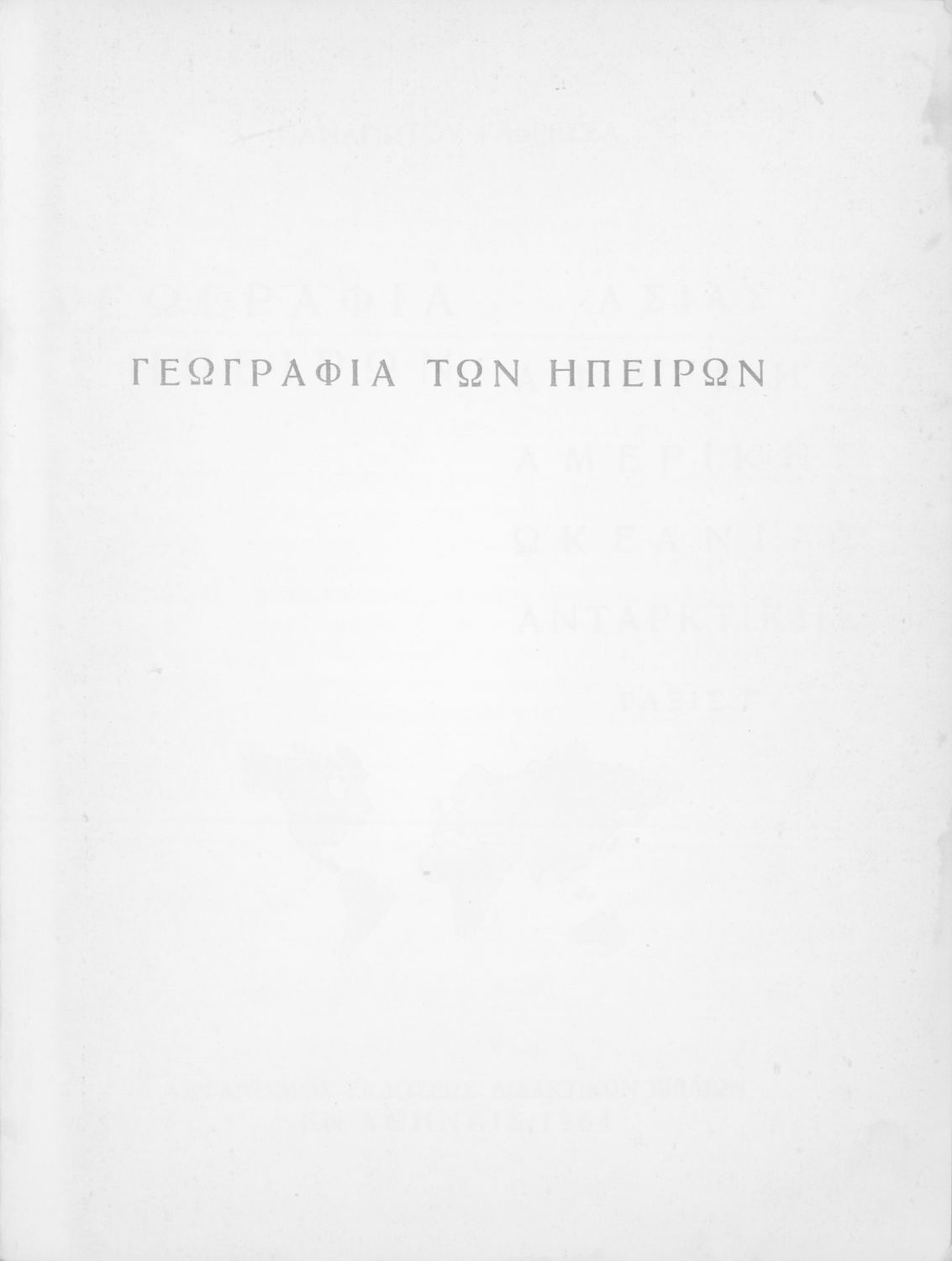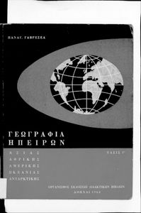 Σχολικό εγχειρίδιο Γεωγραφίας που εξετάζει ενδεικτικές χώρες και περιοχές από τις πέντε ηπείρους εκτός της Ευρώπης από γεωφυσική και οικονομική πλευρά. Φέρει το σύμβολο της δικτατορίας.