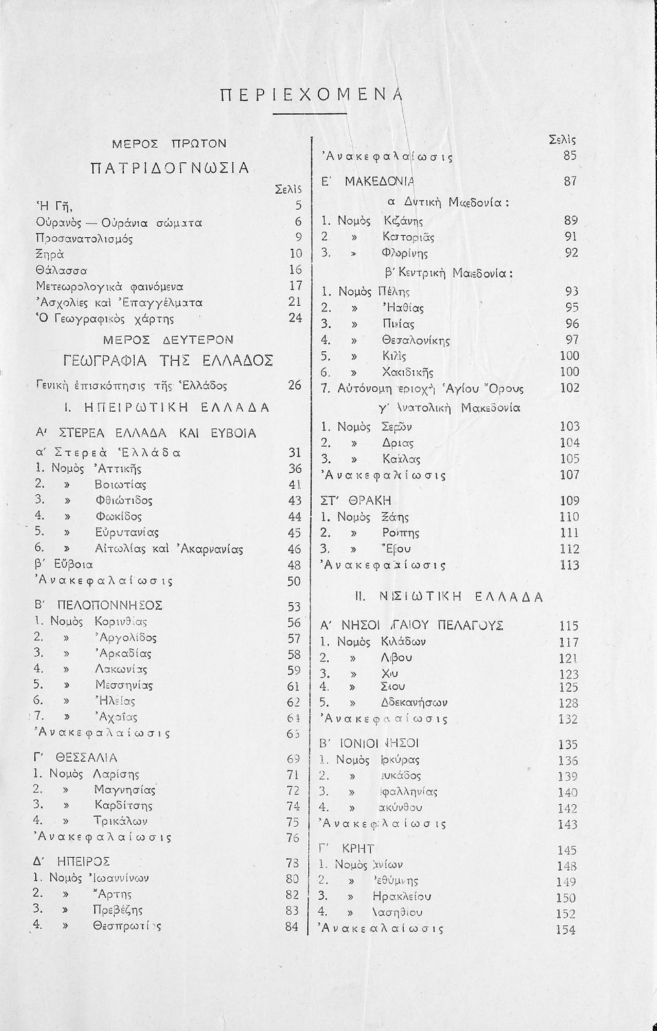 Σχολικό εγχειρίδιο Γεωγραφίας για τις Γ΄, Δ΄, Ε΄, ΣΤ΄ Δημοτικού που περιλαμβάνει εισαγωγή στην πατριδογνωσία και παρουσιάζει την φυσική και πολιτική γεωγραφία της Παλαιάς και Νέας Ελλάδας.