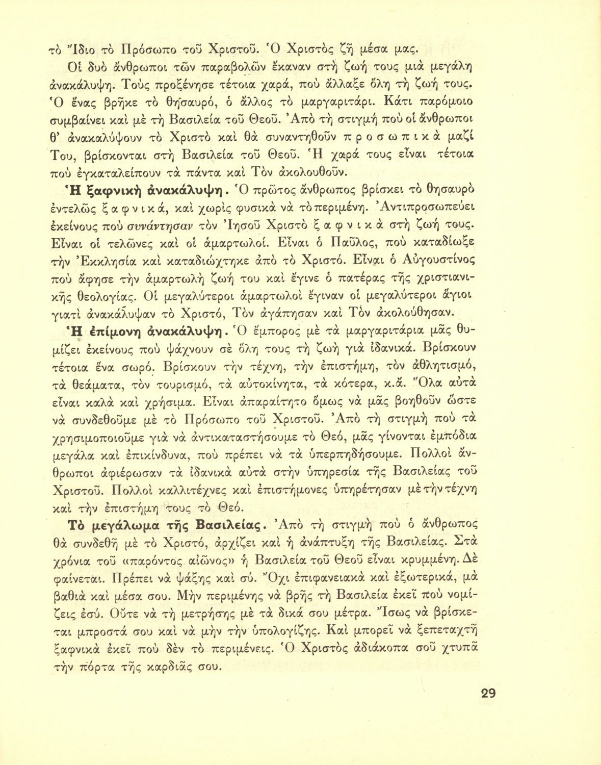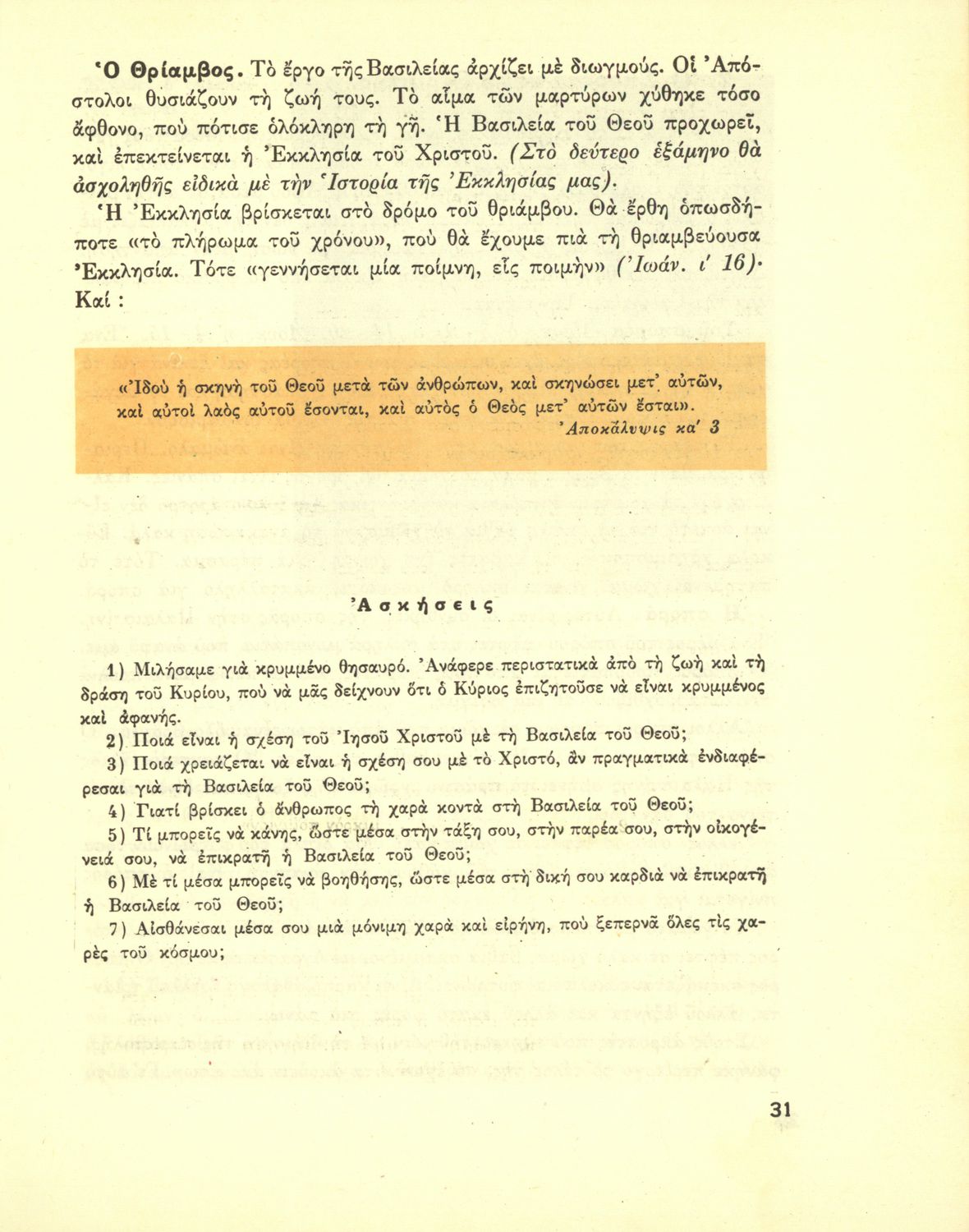 Σχολικό εγχειρίδιο Θρησκευτικών Β' Γυμνασίου που περιλαμβάνει τη διδασκαλία του Ιησού Χριστού και την ιστορία της δημιουργίας, της εδραίωσης και της εξάπλωσης της χριστιανικής εκκλησίας από την εποχή των Αποστόλων μέχρι τη συγκρότηση του Παγκόσμιου Συμβουλίου Εκκλησιών.