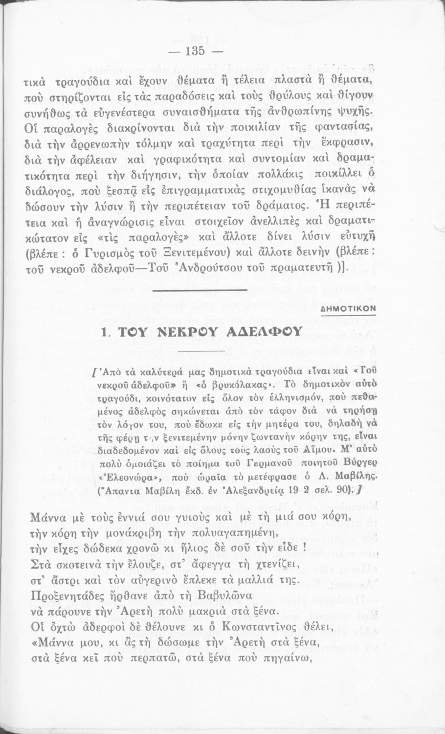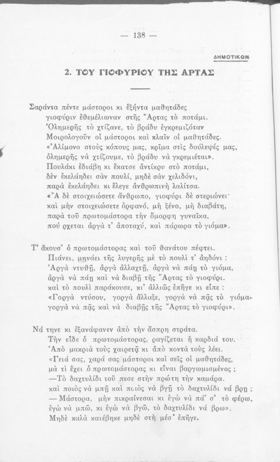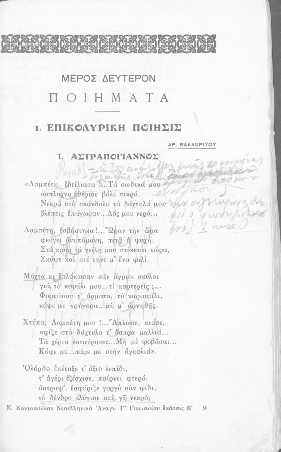 Σχολικό εγχειρίδιο για την Β΄ Γυμνασίου και την Γ΄ Αστικού Θηλέων για το μάθημα των Νέων Ελληνικών. Το εγχειρίδιο αποτελείται από κείμενα πεζού λόγου, επικολυρικά ποιήματα, ωδές, ηθογραφικά διηγήματα, ρητορικά