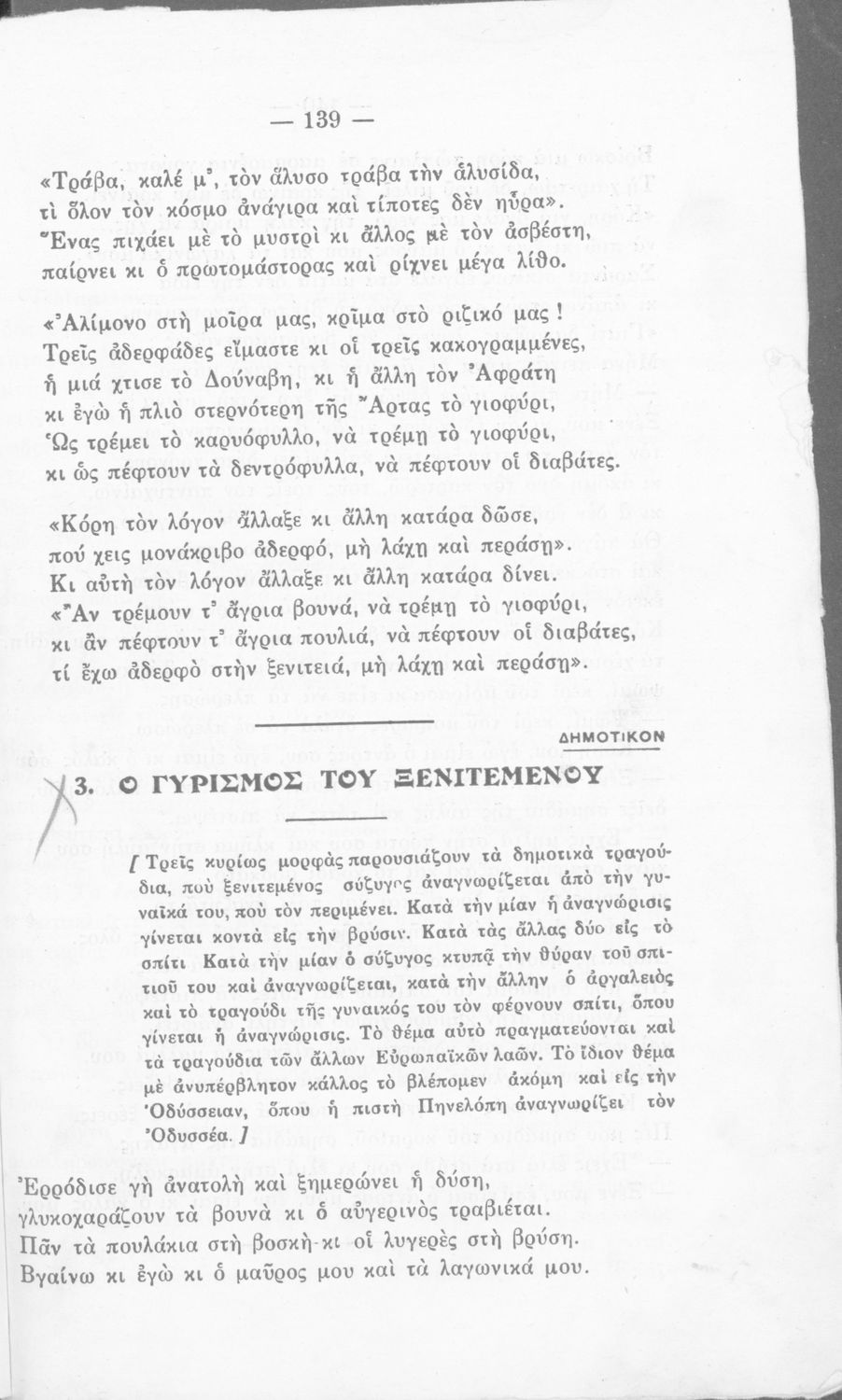 Σχολικό εγχειρίδιο Νέων Ελληνικών Γ' Ελληνικού Σχολείου που περιλαμβάνει κείμενα Ελλήνων συγγραφέων και δημοτικά τραγούδια εμπνευσμένα από την σύγχρονη ελληνική ιστορία, την ελληνική φύση και τη ζωή στην ...