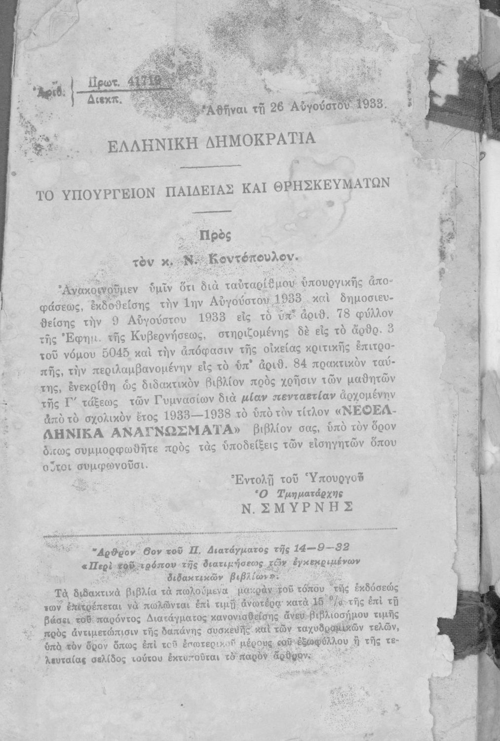 Υπουργική απόφαση / Σύμβαση: 41719/26-8-1933
