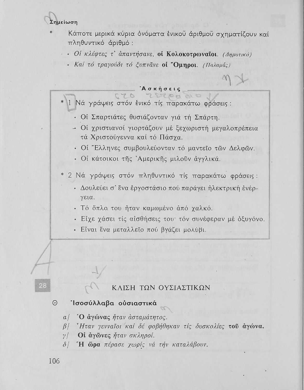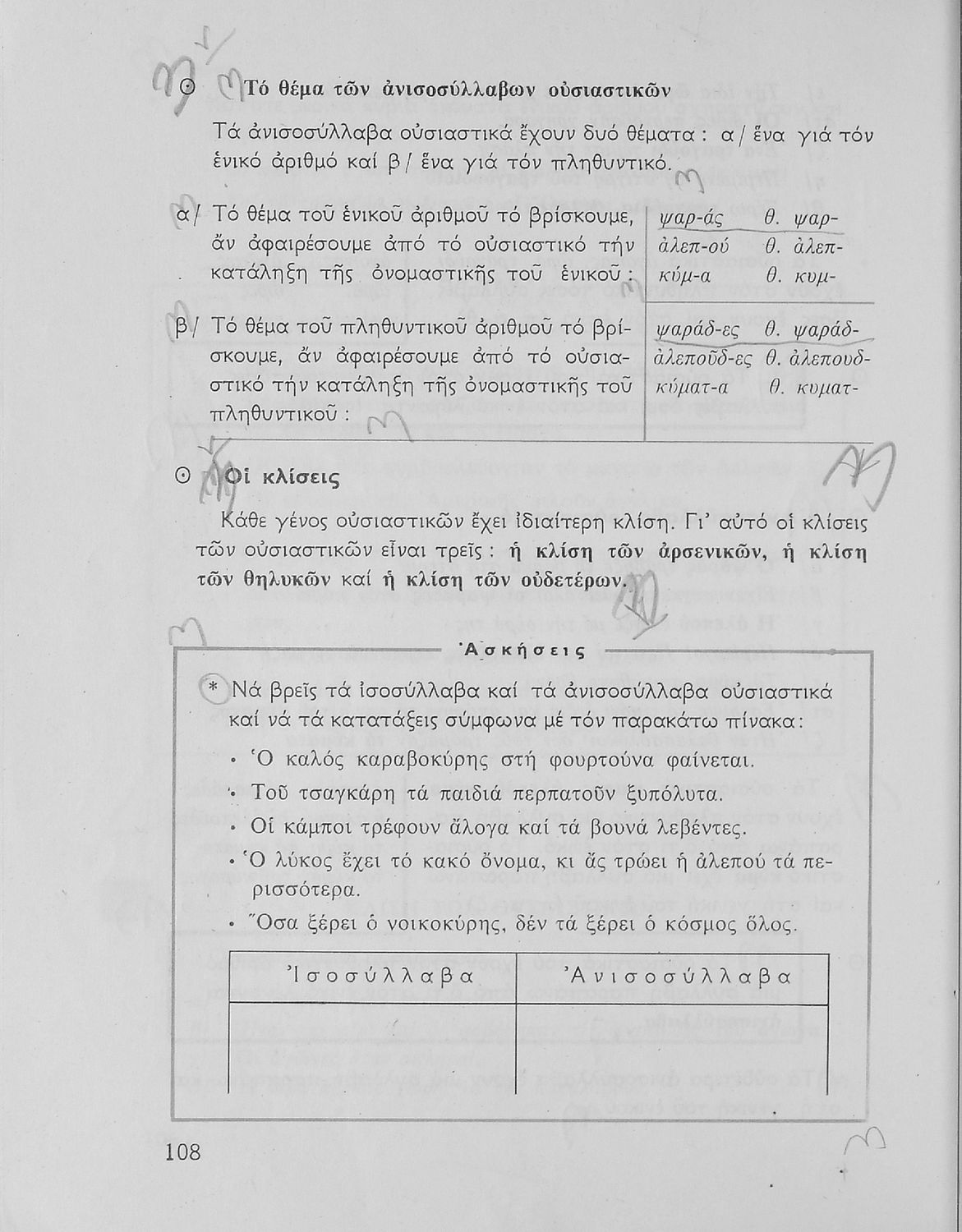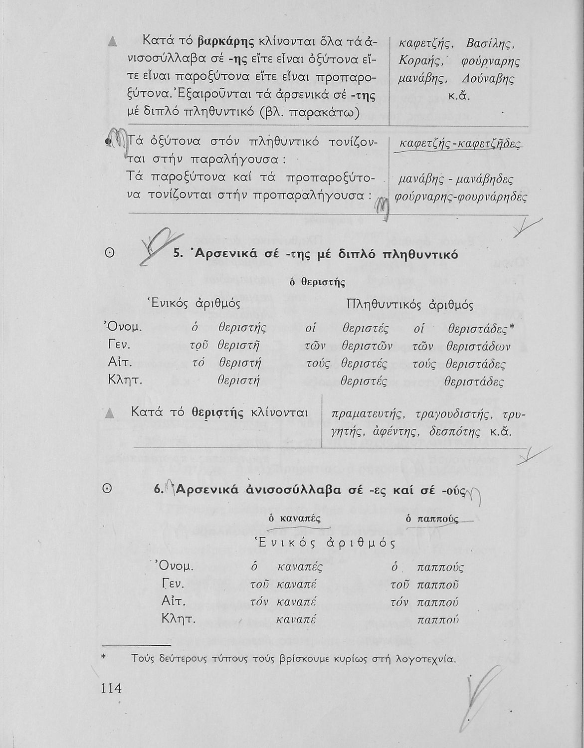 Σχολικό εγχειρίδιο της Ε΄ και ΣΤ΄ τάξης Δημοτικού για την γραμματική της ελληνικής γλώσσας με κανόνες και παραδείγματα. Στο επίμετρο υπάρχουν πίνακες με ανώμαλους σχηματισμούς ρημάτων.