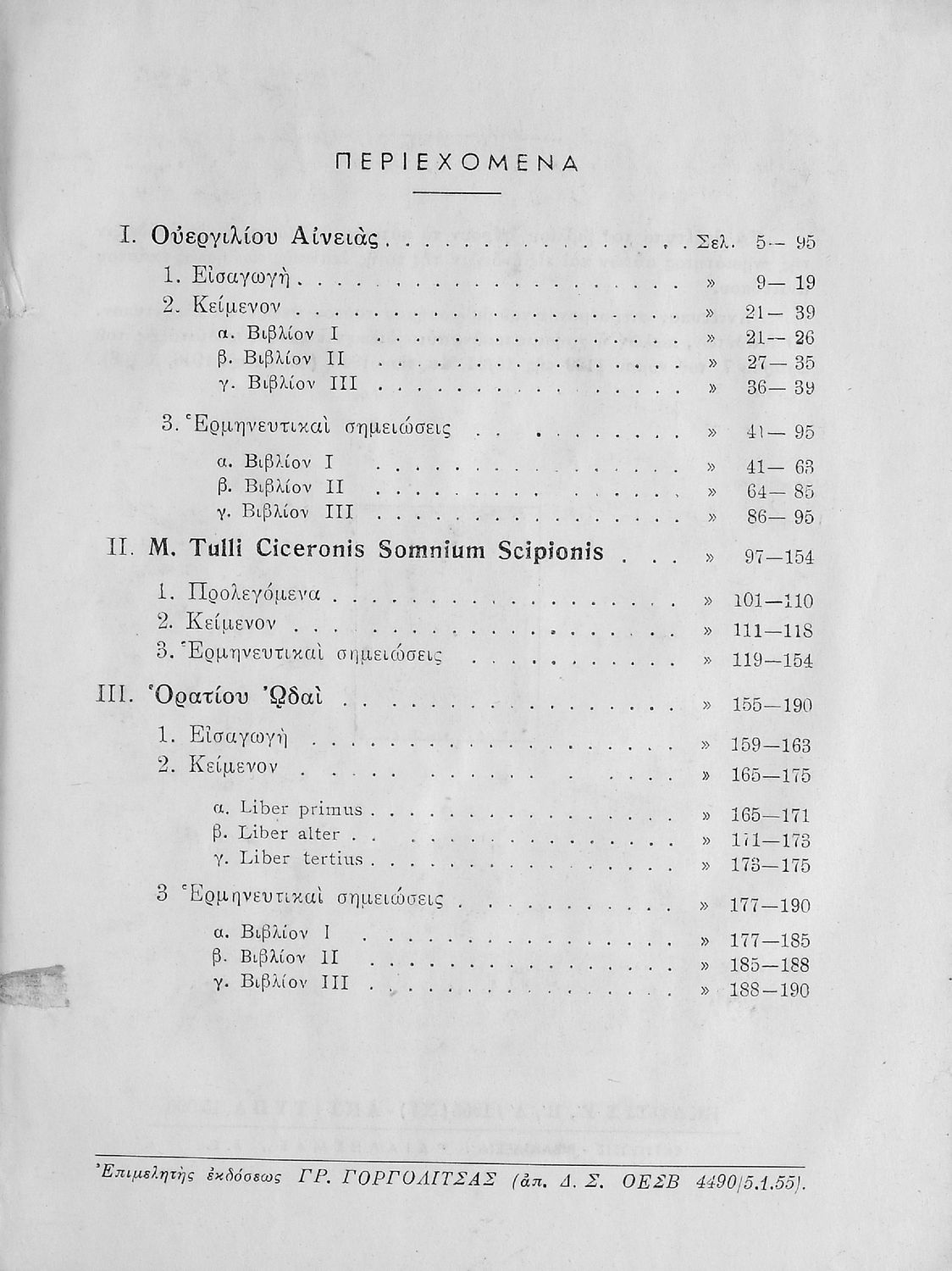 Συγγραφέας: Πόπλιος Βιργίλιος Μάρων (P. Vergilius Maro), Μάρκος Τύλλιος Κικέρωνας (Marcus Tullius Ciceco), Κουίντος Οράτιος Φλάκκος (Q. Horati Flacci), Φωκίωνας Β. Βουσβούνης, Ερρίκος Σκάσσης, Ζαφείριος Ν. Φραγκίσκος (εισαγωγή/σχόλια)