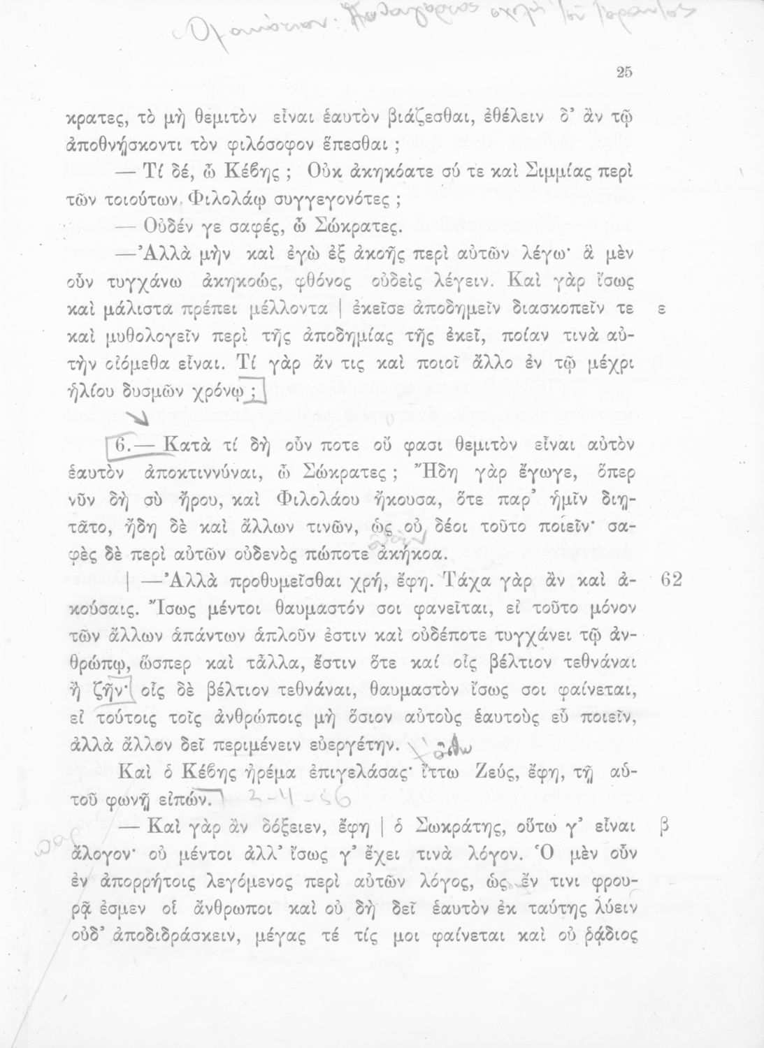 Σχολικό εγχειρίδιο Αρχαίων Ελληνικών ΣΤ΄ Γυμνασίου που περιέχει αποσπάσματα από το έργο του Πλάτωνα Φαίδων, λεξιλογικές παρατηρήσεις, και ερμηνευτικά, πραγματολογικά σχόλια και γραμματικές παρατηρήσεις.