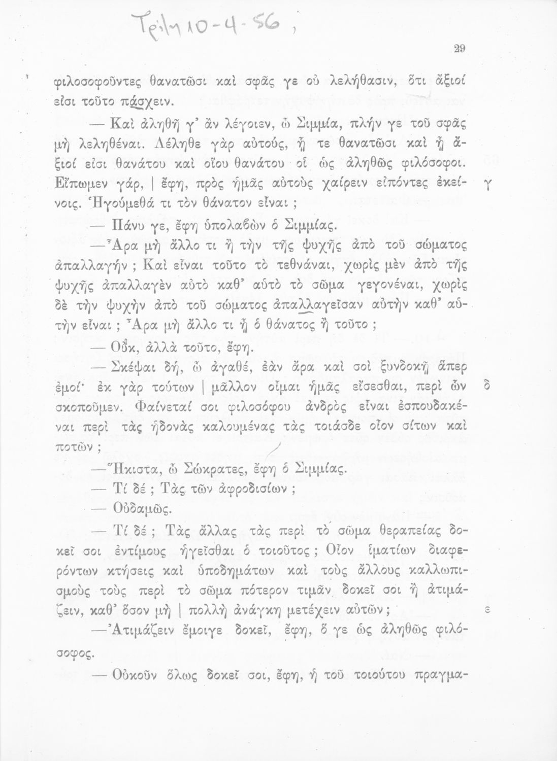 Σχολικό εγχειρίδιο Αρχαίων Ελληνικών. Το βιβλίο περιλαμβάνει εισαγωγή σχετικά με τη ζωή και το έργο του Πλάτωνα και αναφέρεται σε φιλοσόφους της εποχής. Παραθέτεται το κείμενο "Φαίδων : Η περί ψυχής ηθικός" το