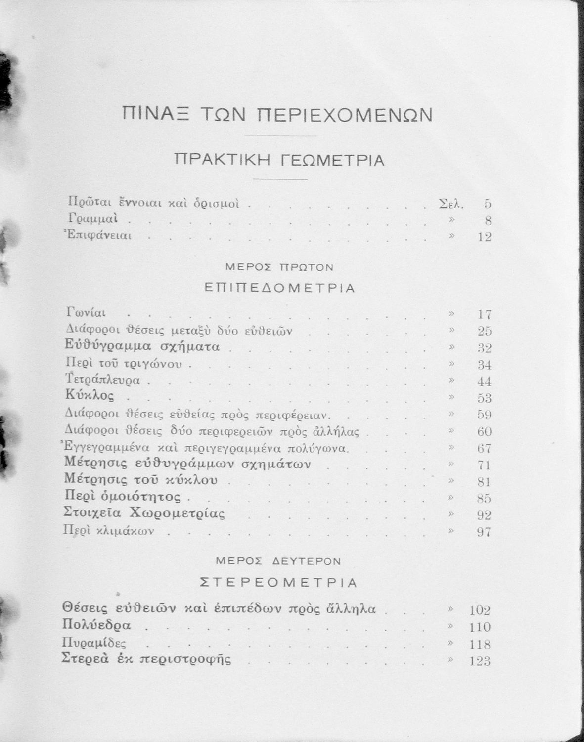 Σχολικό εγχειρίδιο Γεωμετρίας Γυμνασίων και Αστικών Σχολείων χωρισμένο σε Επιπεδομετρία και Στερεομετρία. Περιλαμβάνει και στοιχεία Χωρομετρίας.