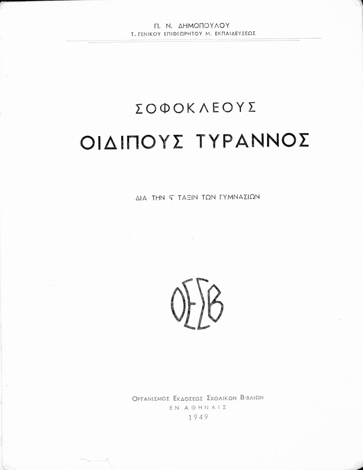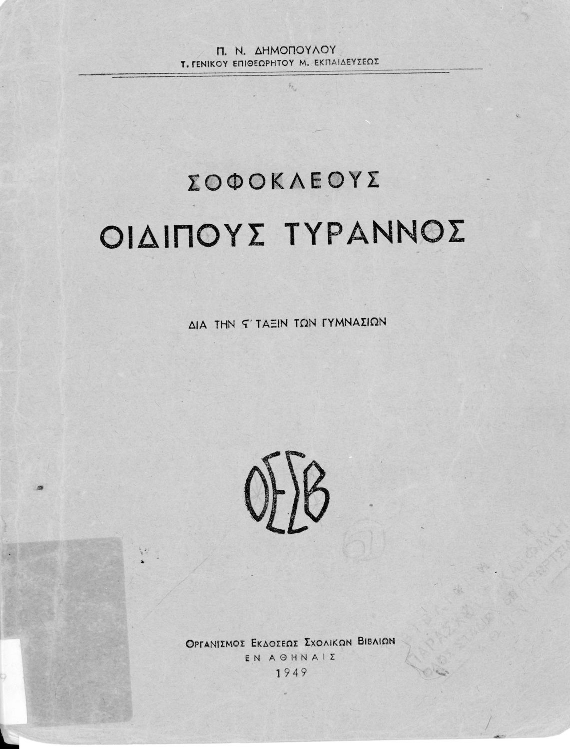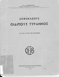 Κωδικός αναγνώρισης: 01-17329 Τίτλος: Σοφοκλέους Οιδίπους Τύραννος. Δια την ΣΤ΄ Τάξιν των Γυμνασίων Συγγραφέας: Σοφοκλής, Π.Ν Δημόπουλος (σχόλια) Μέγεθος και υπόστρωμα: Σχολικό εγχειρίδιο, μαλακό εξώφυλλο, 128 σελίδες. |