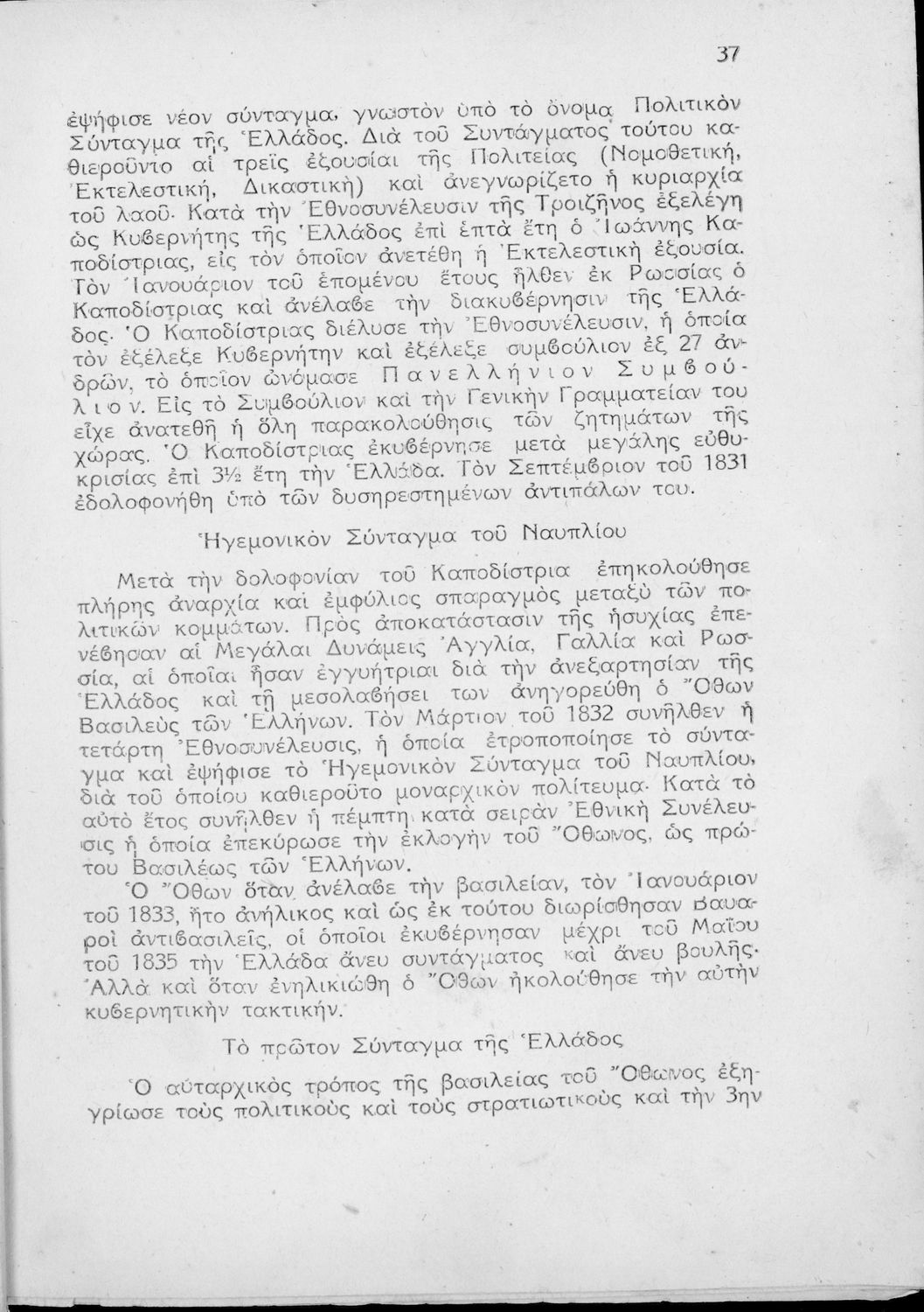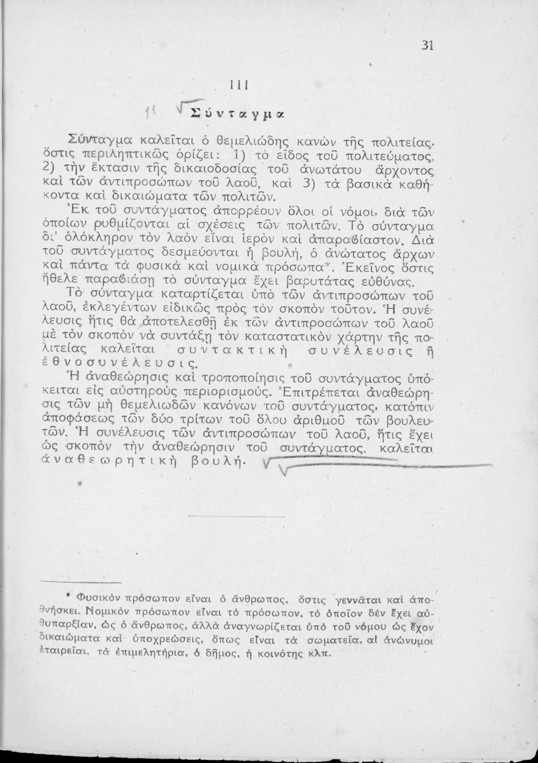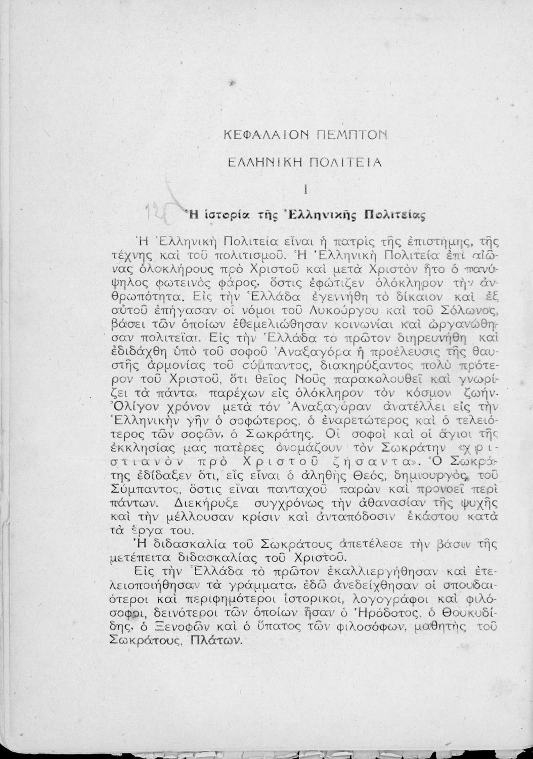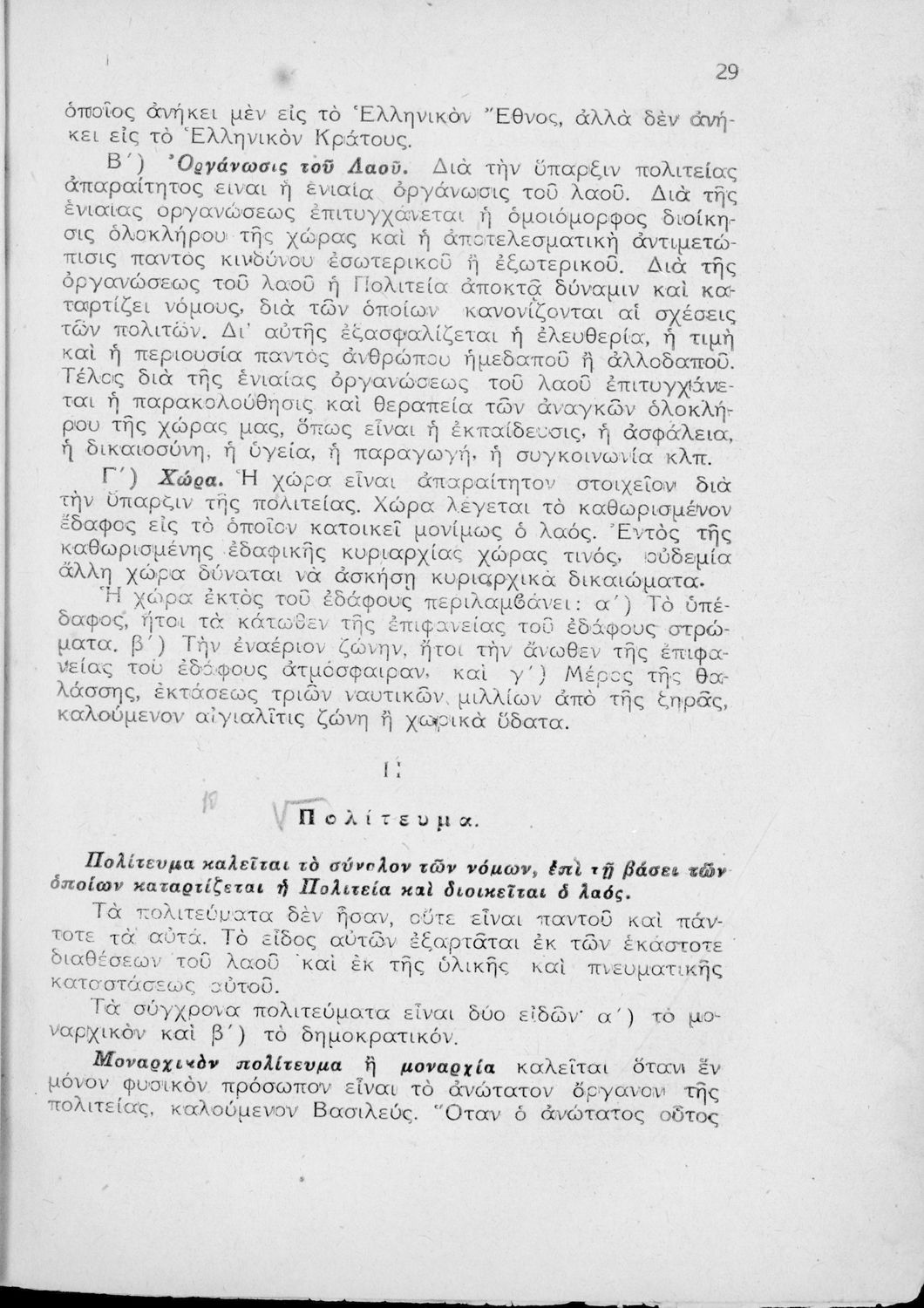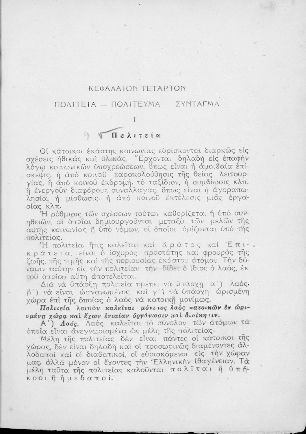 Παιδαγωγικό βοήθημα Αγωγής του Πολίτη που περιέχει στοιχεία Κοινωνιολογίας, Κοινωνικής Οικονομίας και Δικαίου και πραγματεύεται ζητήματα του συντάγματος της Ελλάδος, των τριών εξουσιών, των εθνικών συμβόλων και των καθηκόντων και δικαιωμάτων του πολίτη. Περιέχει και το Σύνταγμα του 1911 που επανήρθε σε ισχύ το 1946.