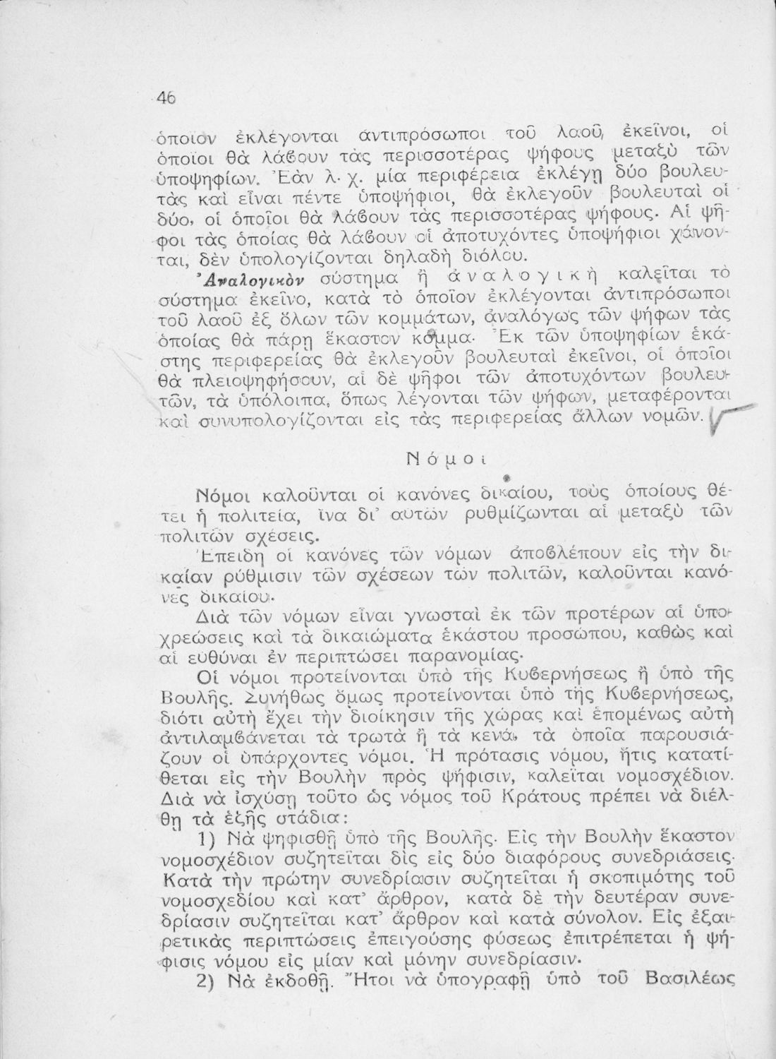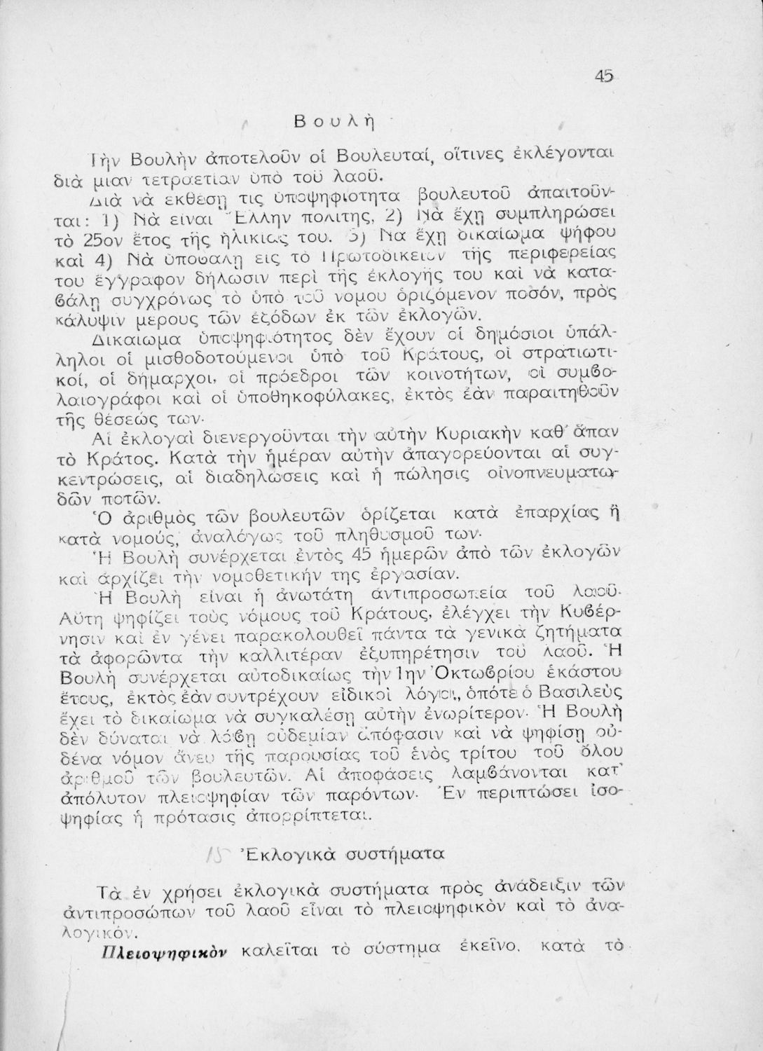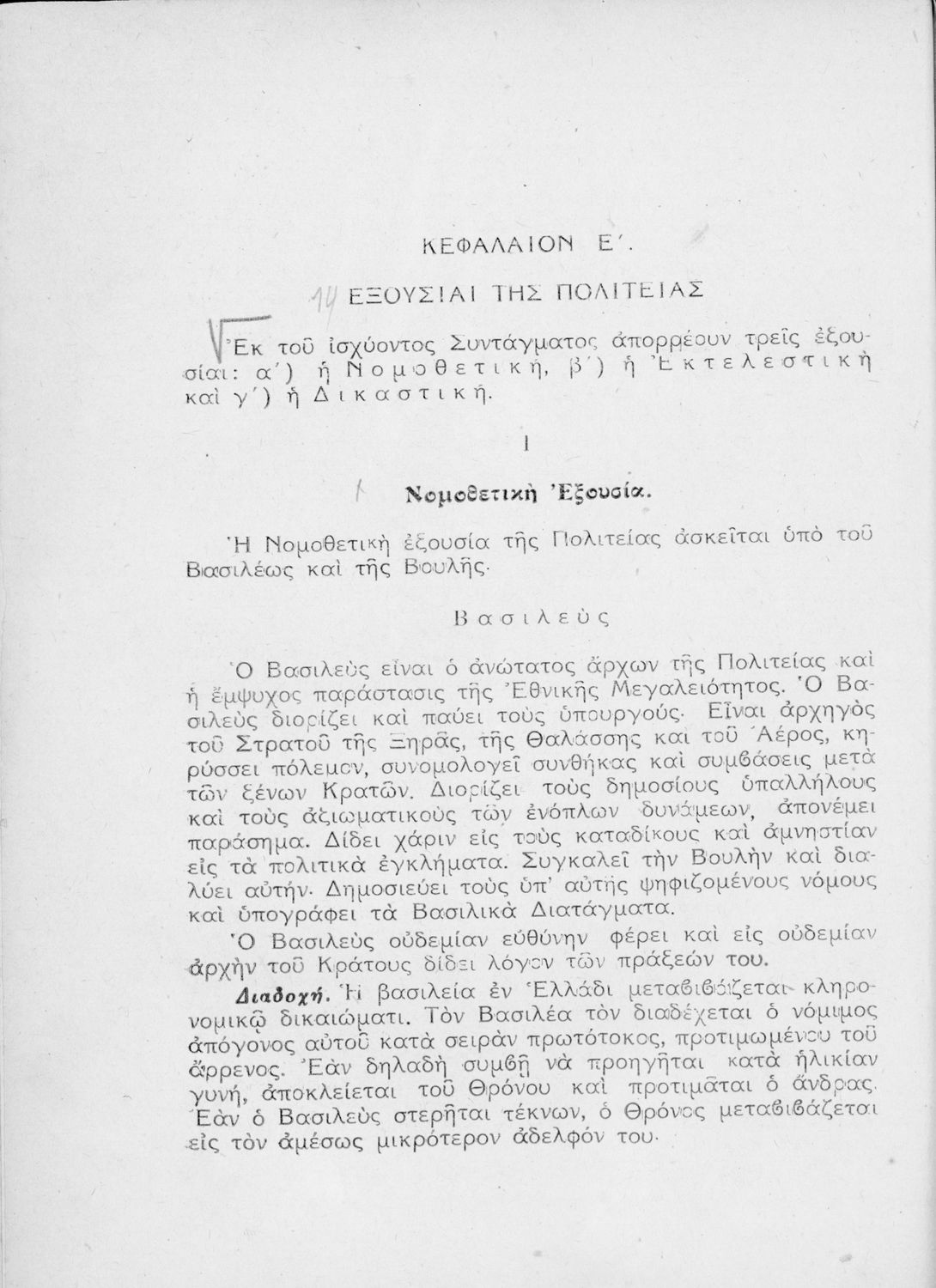 Παιδαγωγικό βοήθημα Αγωγής του Πολίτη που περιέχει στοιχεία Κοινωνιολογίας, Κοινωνικής Οικονομίας και Δικαίου και πραγματεύεται ζητήματα του συντάγματος της Ελλάδος, των τριών εξουσιών, των εθνικών συμβόλων και των καθηκόντων και δικαιωμάτων του πολίτη. Περιέχει και το Σύνταγμα του 1911 που επανήρθε σε ισχύ το 1946.