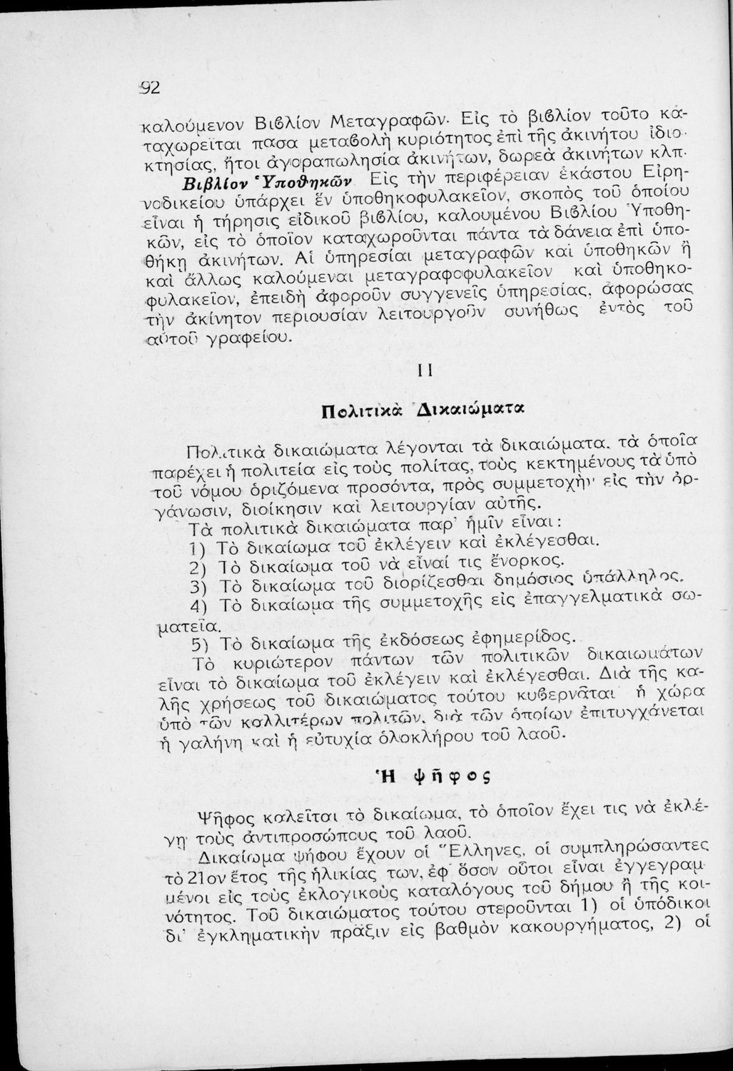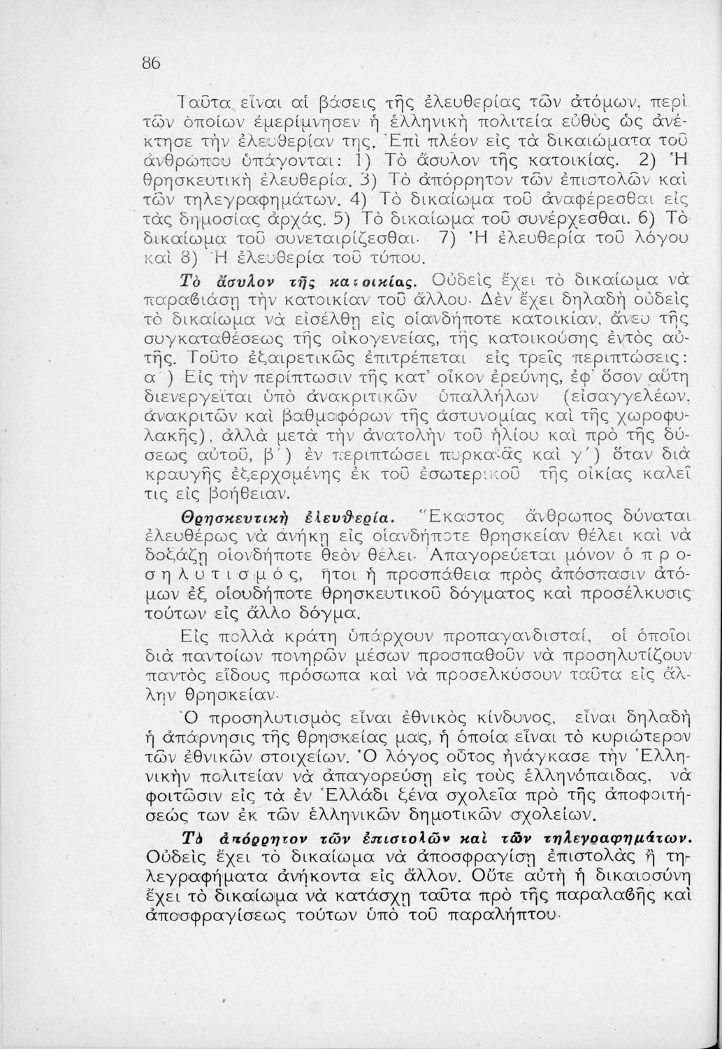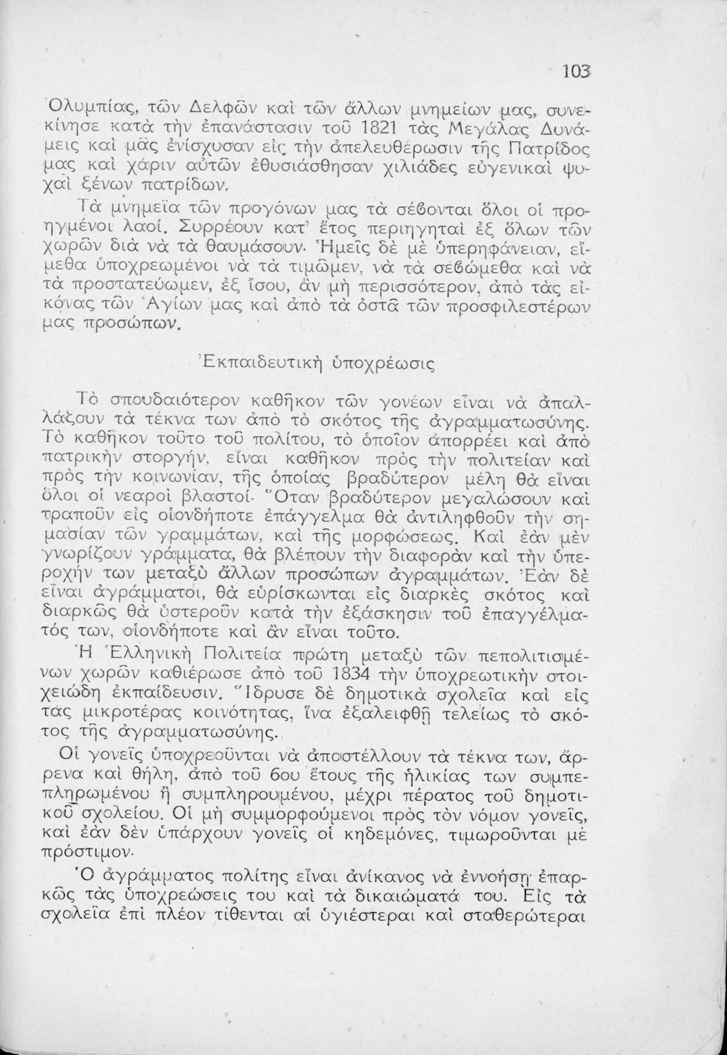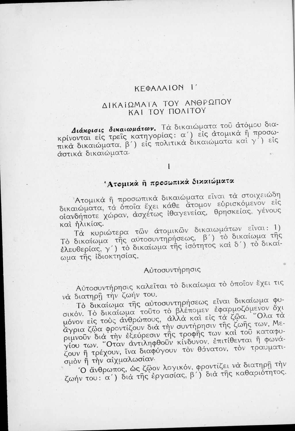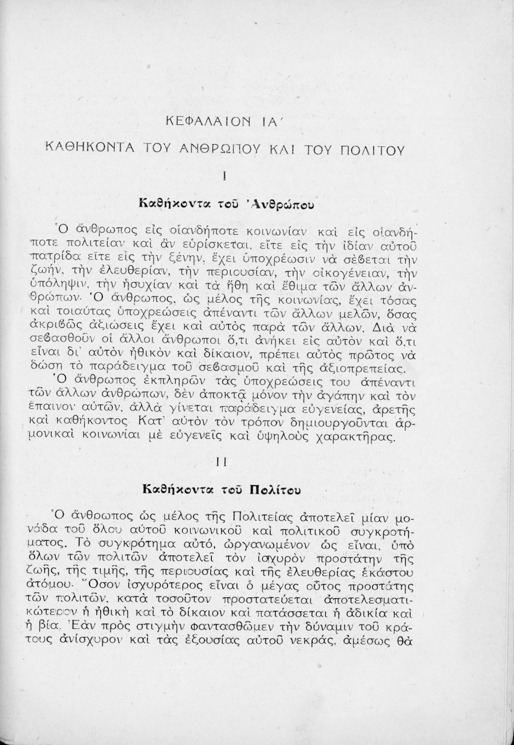 Παιδαγωγικό βοήθημα Αγωγής του Πολίτη που περιέχει στοιχεία Κοινωνιολογίας, Κοινωνικής Οικονομίας και Δικαίου και πραγματεύεται ζητήματα του συντάγματος της Ελλάδος, των τριών εξουσιών, των εθνικών συμβόλων και των καθηκόντων και δικαιωμάτων του πολίτη. Περιέχει και το Σύνταγμα του 1911 που επανήρθε σε ισχύ το 1946.