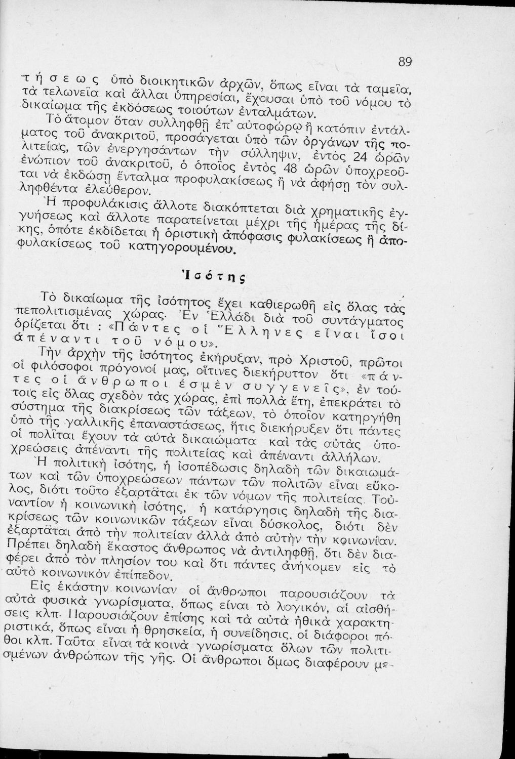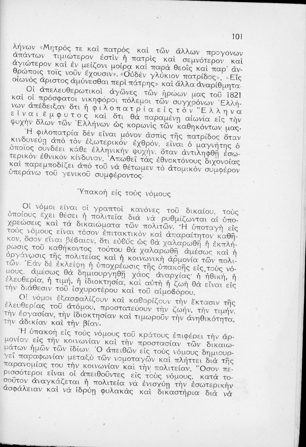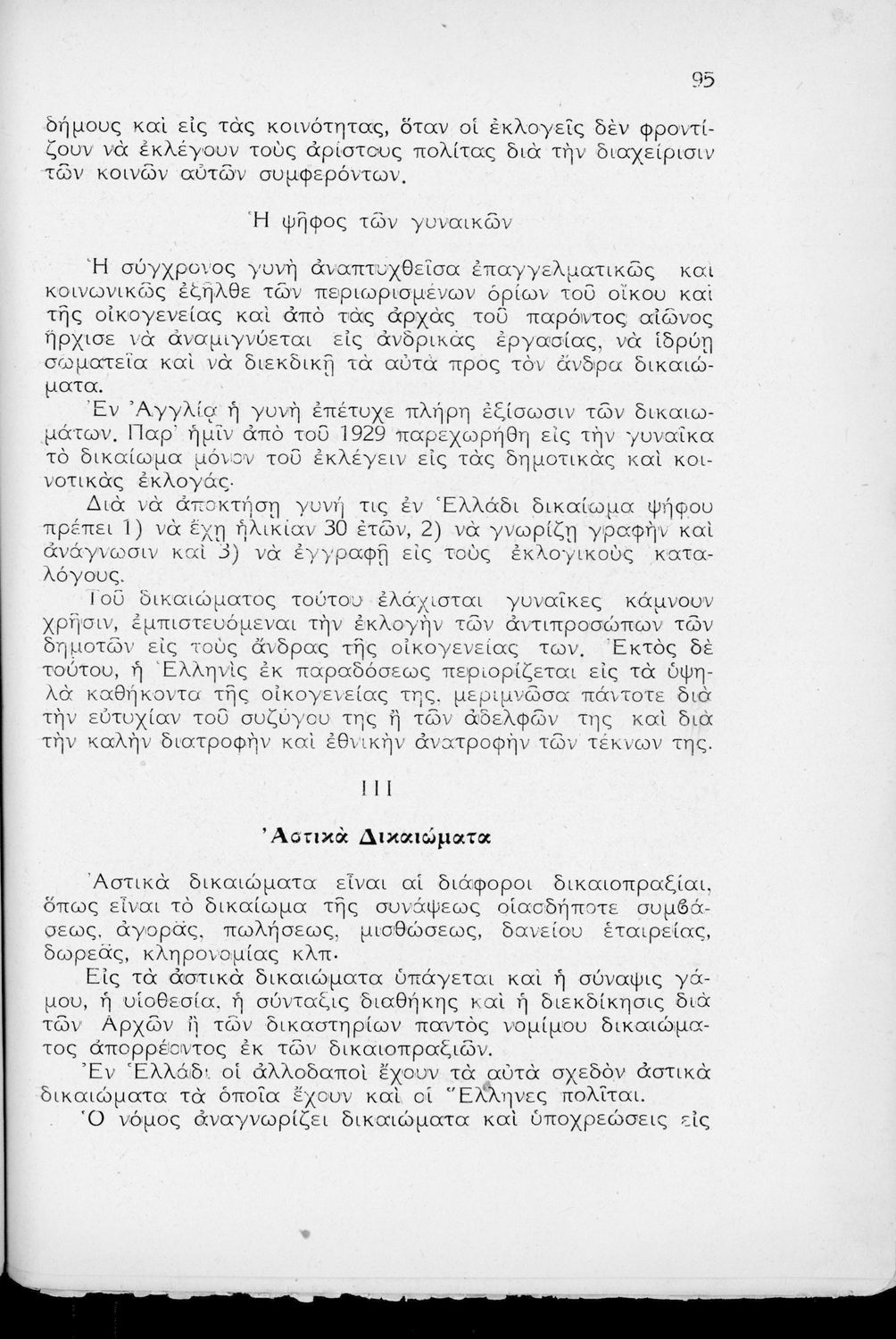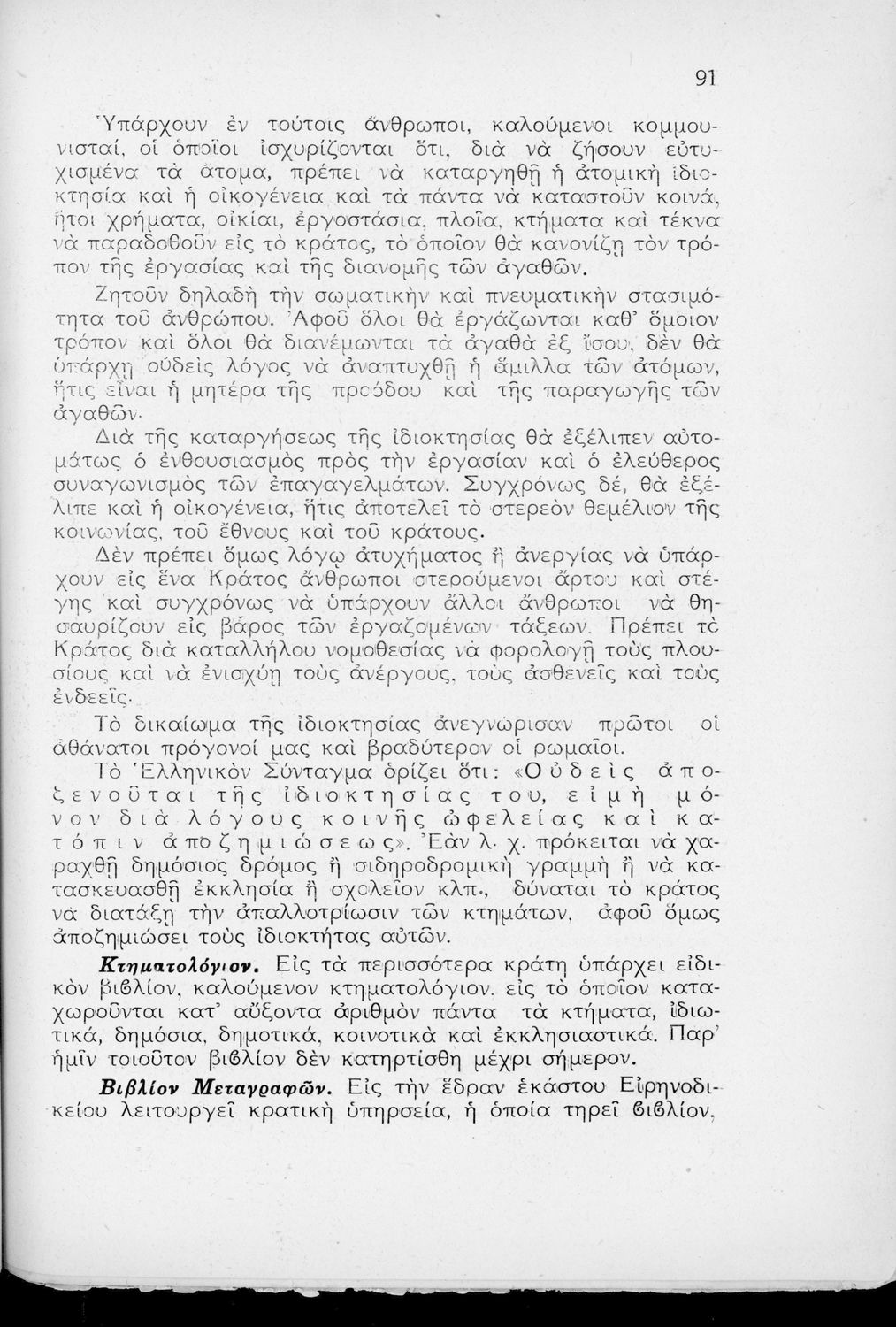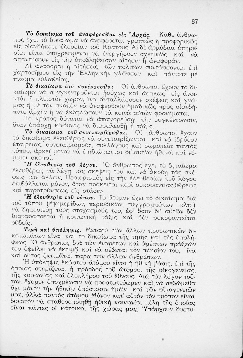 Παιδαγωγικό βοήθημα Αγωγής του Πολίτη που περιέχει στοιχεία Κοινωνιολογίας, Κοινωνικής Οικονομίας και Δικαίου και πραγματεύεται ζητήματα του συντάγματος της Ελλάδος, των τριών εξουσιών, των εθνικών συμβόλων και των καθηκόντων και δικαιωμάτων του πολίτη. Περιέχει και το Σύνταγμα του 1911 που επανήρθε σε ισχύ το 1946.
