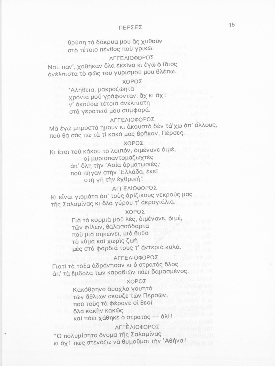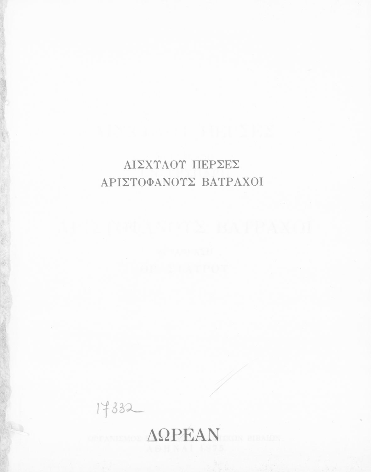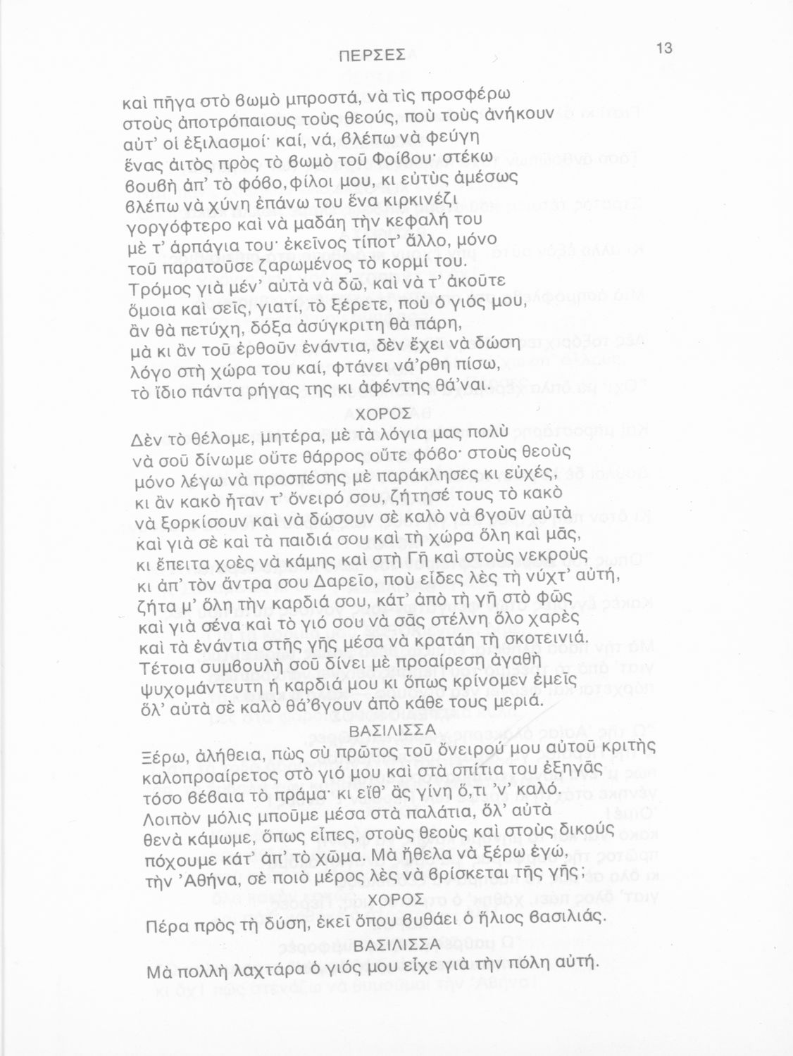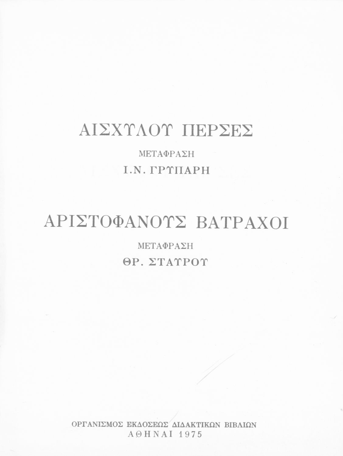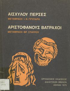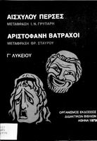 Σχολικό εγχειρίδιο Αρχαίων Ελληνικών Γ΄ Λυκείου που περιλαμβάνει αποσπάσματα από την Τραγωδία του Αισχύλου Πέρσες σε μετάφραση Ι. Ν. Γρυπάρη, εισαγωγικό σημείωμα σχετικά με την αρχαία ελληνική κωμωδία του Ι. Κ. Κακριδή και αποσπάσματα από την κωμωδία του Αριστοφάνη Βάτραχοι σε μετάφραση και ερμηνευτικά σχόλια του Θρ. Σταύρου.