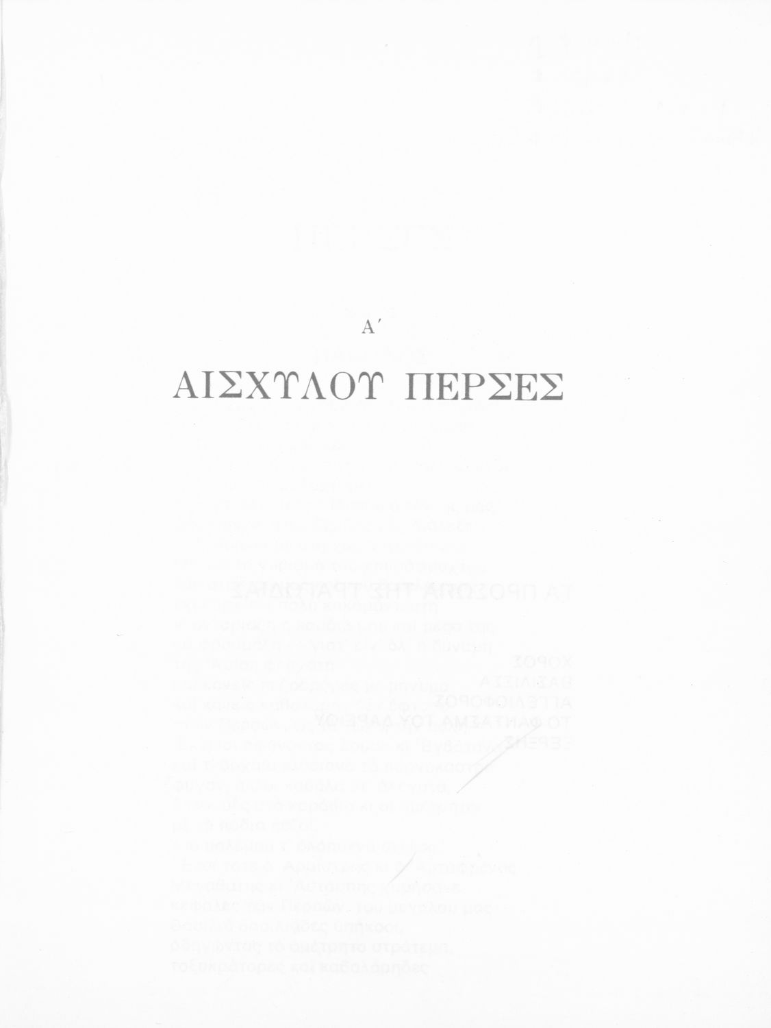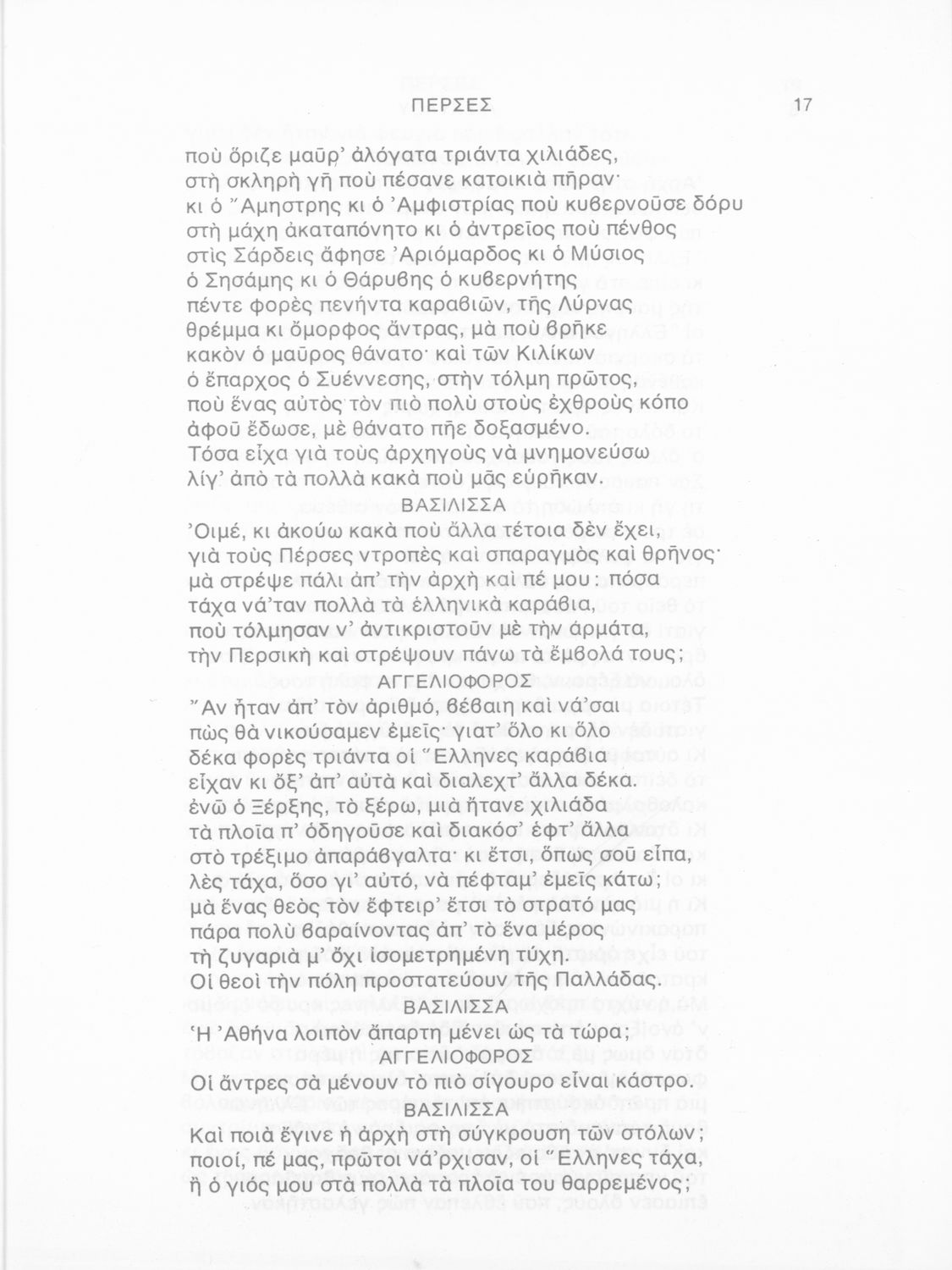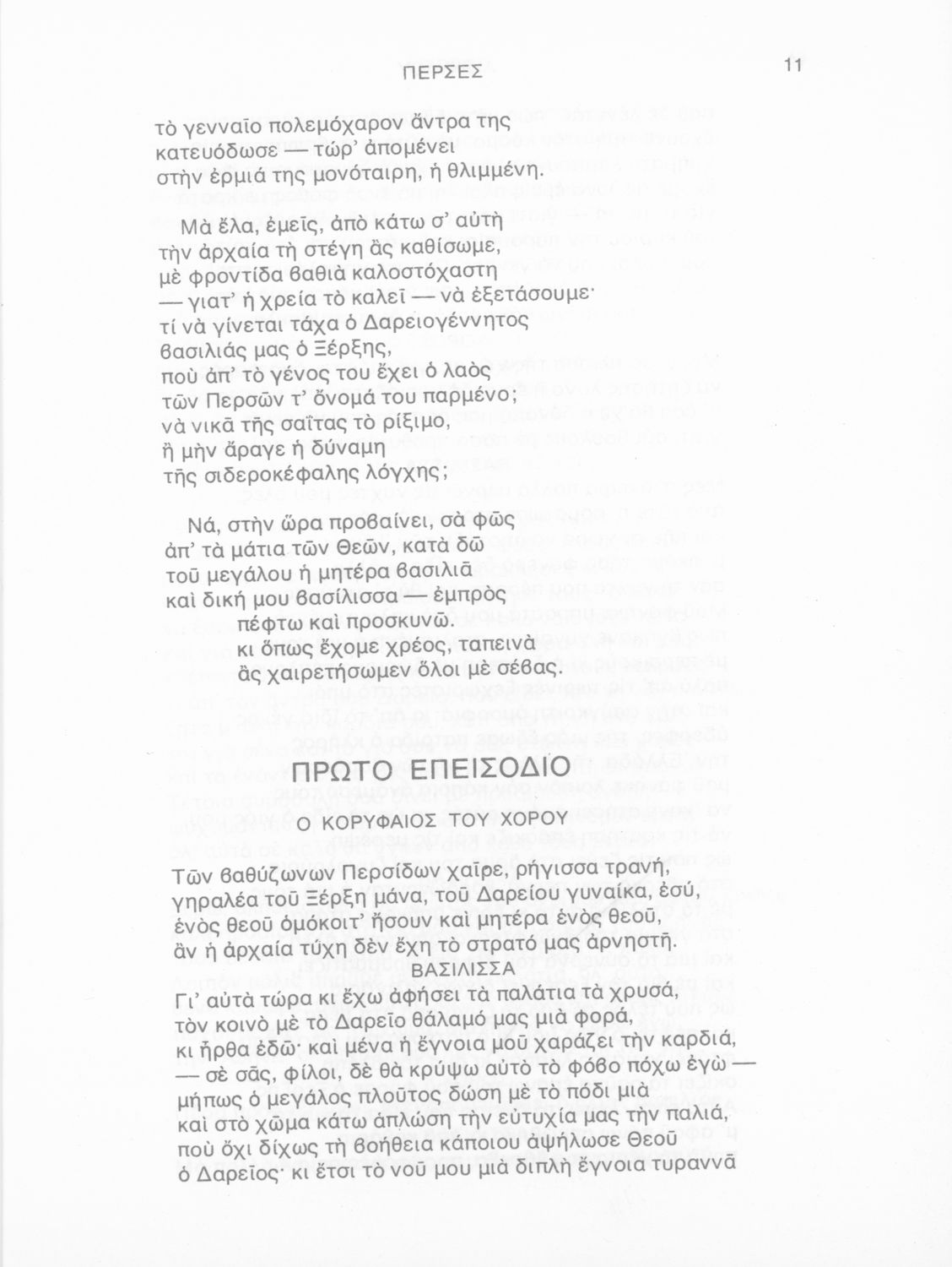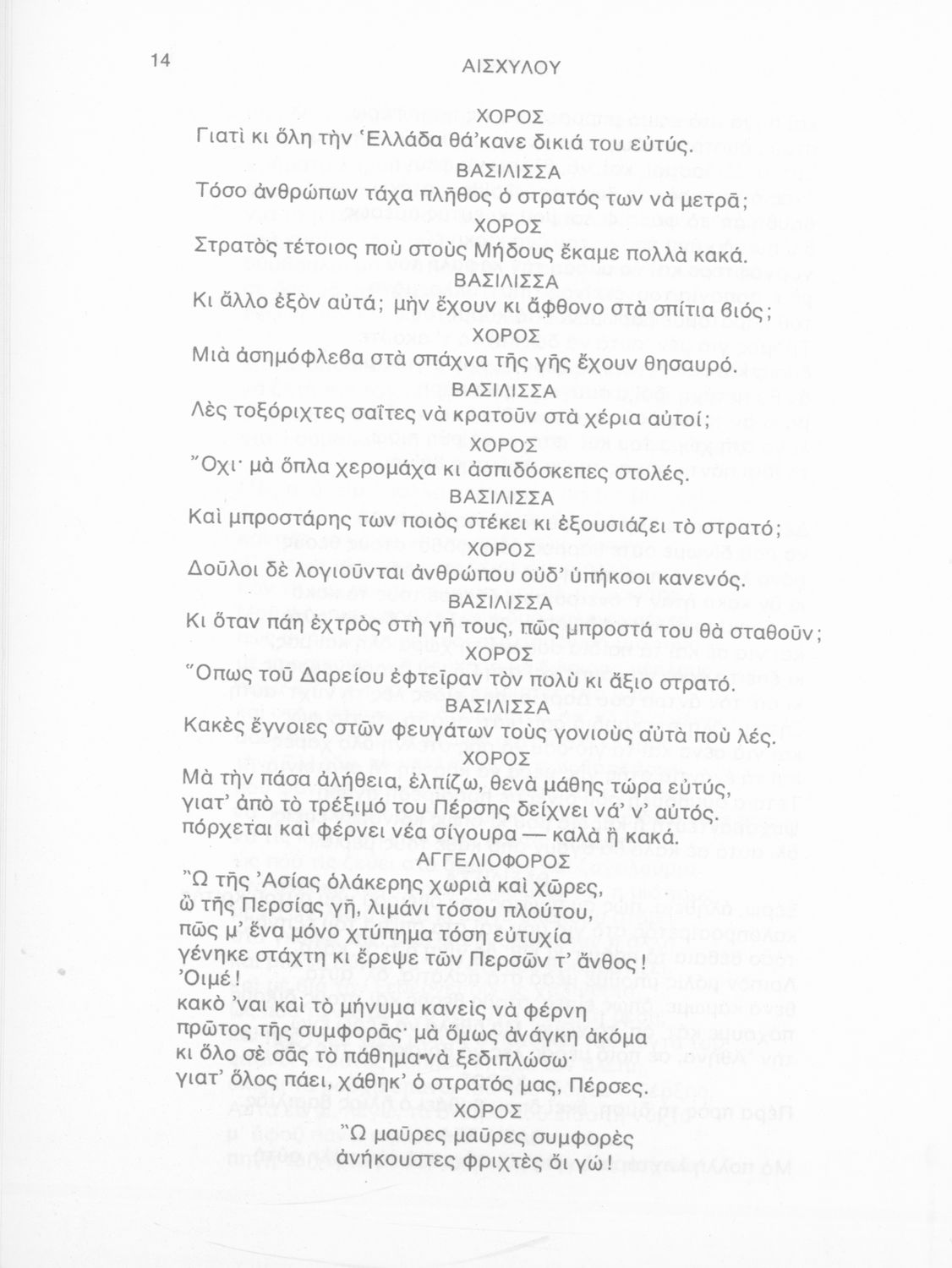 Σχολικό εγχειρίδιο Αρχαίων Ελληνικών Γ΄ Λυκείου που περιλαμβάνει αποσπάσματα από την Τραγωδία του Αισχύλου Πέρσες σε μετάφραση Ι. Ν. Γρυπάρη, εισαγωγικό σημείωμα σχετικά με την αρχαία ελληνική κωμωδία του Ι. Κ. Κακριδή και αποσπάσματα από την κωμωδία του Αριστοφάνη Βάτραχοι σε μετάφραση και ερμηνευτικά σχόλια του Θρ. Σταύρου.