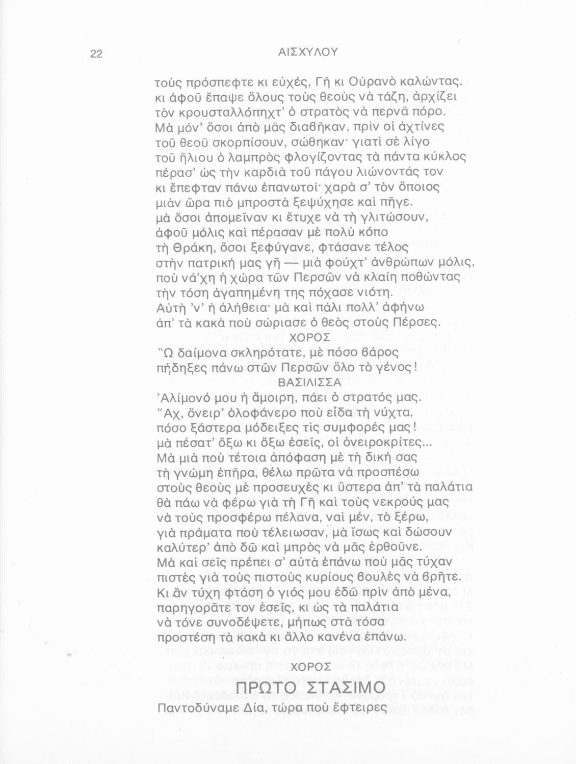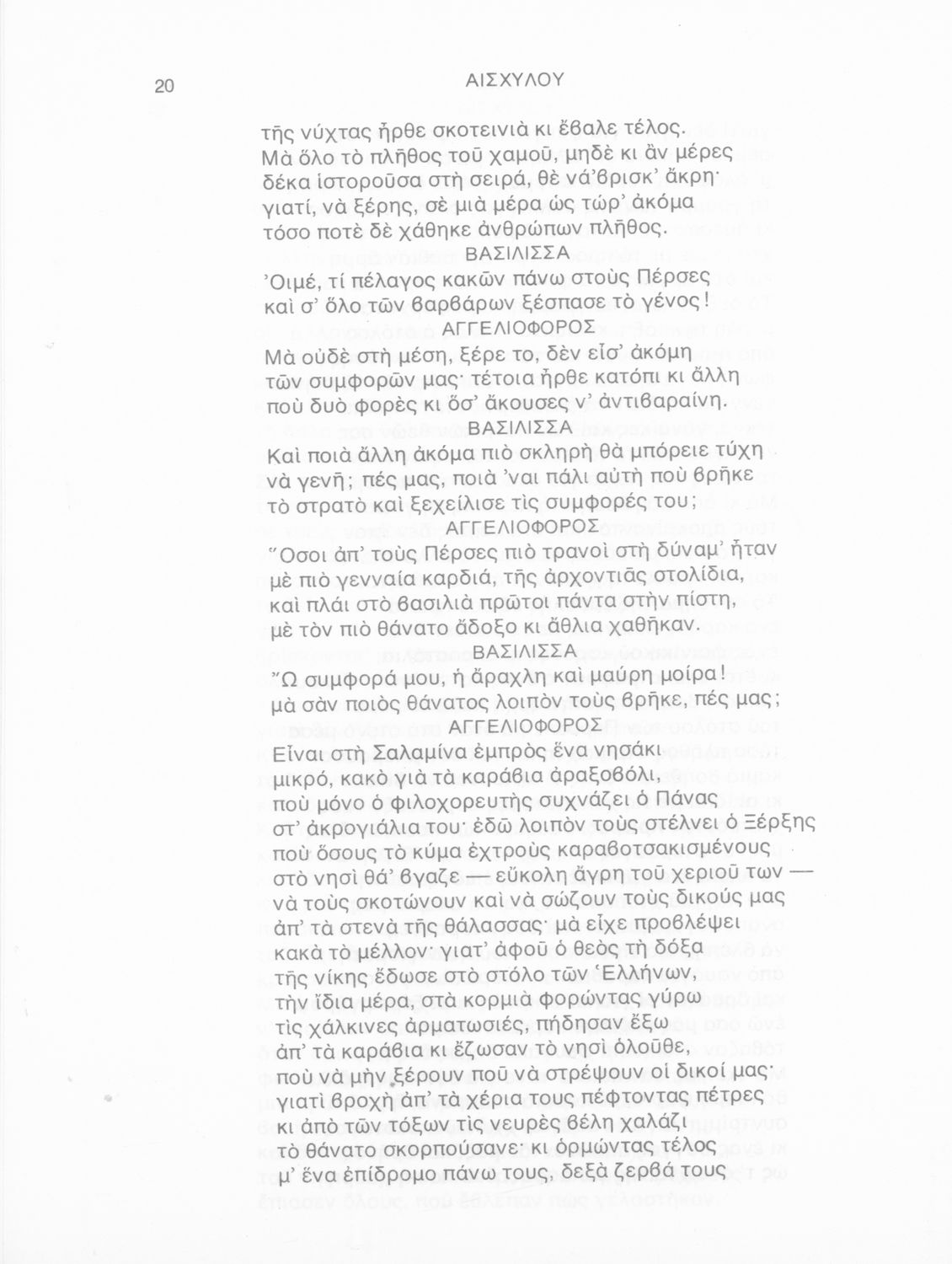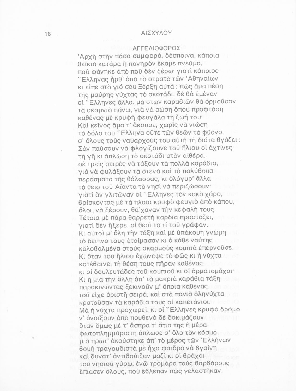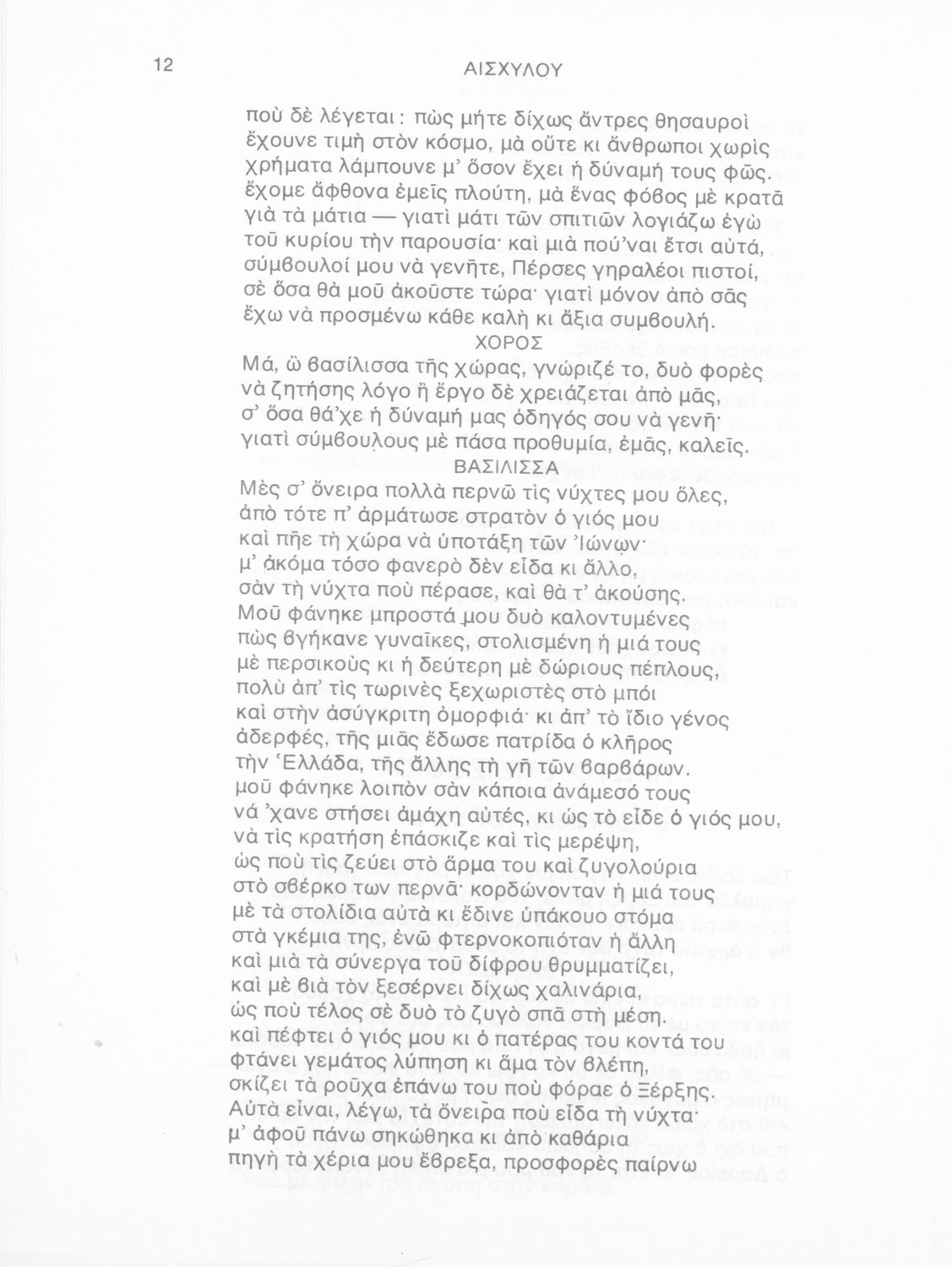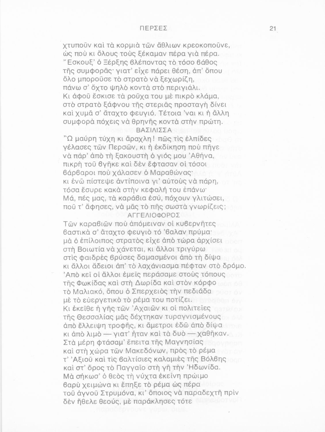 Σχολικό εγχειρίδιο Αρχαίων Ελληνικών Γ΄ Λυκείου που περιλαμβάνει αποσπάσματα από την Τραγωδία του Αισχύλου Πέρσες σε μετάφραση Ι. Ν. Γρυπάρη, εισαγωγικό σημείωμα σχετικά με την αρχαία ελληνική κωμωδία του Ι. Κ. Κακριδή και αποσπάσματα από την κωμωδία του Αριστοφάνη Βάτραχοι σε μετάφραση και ερμηνευτικά σχόλια του Θρ. Σταύρου.