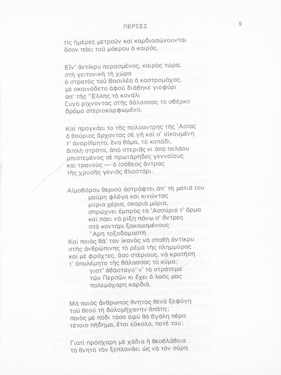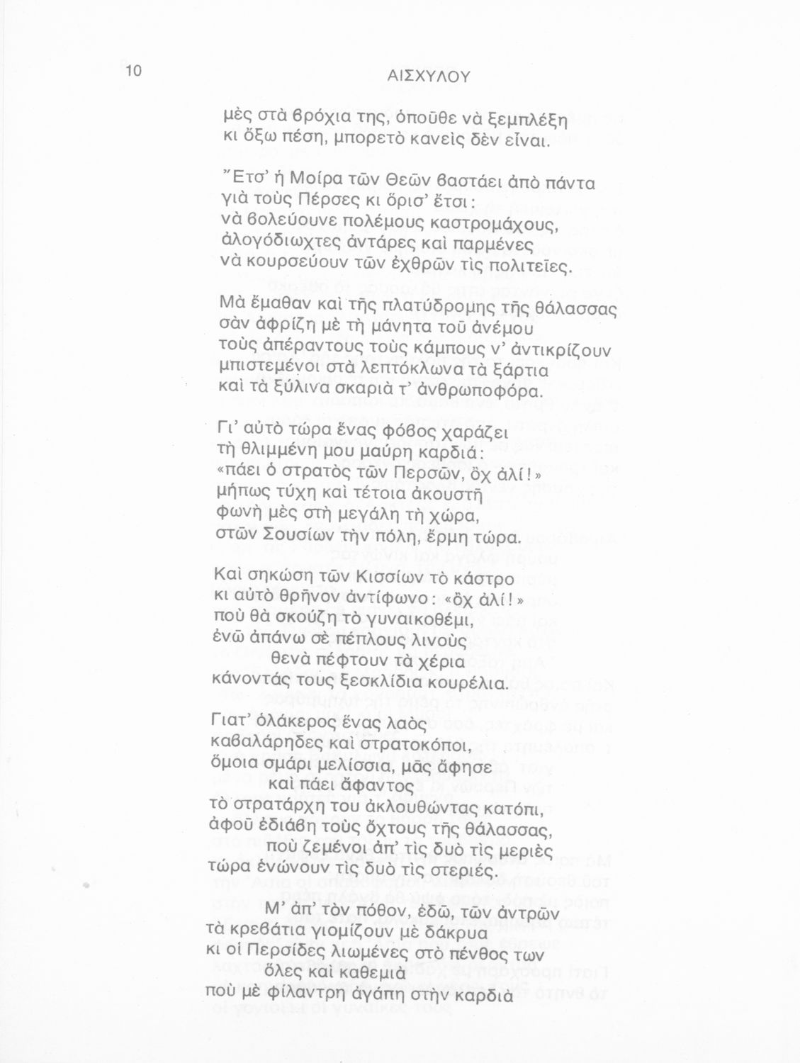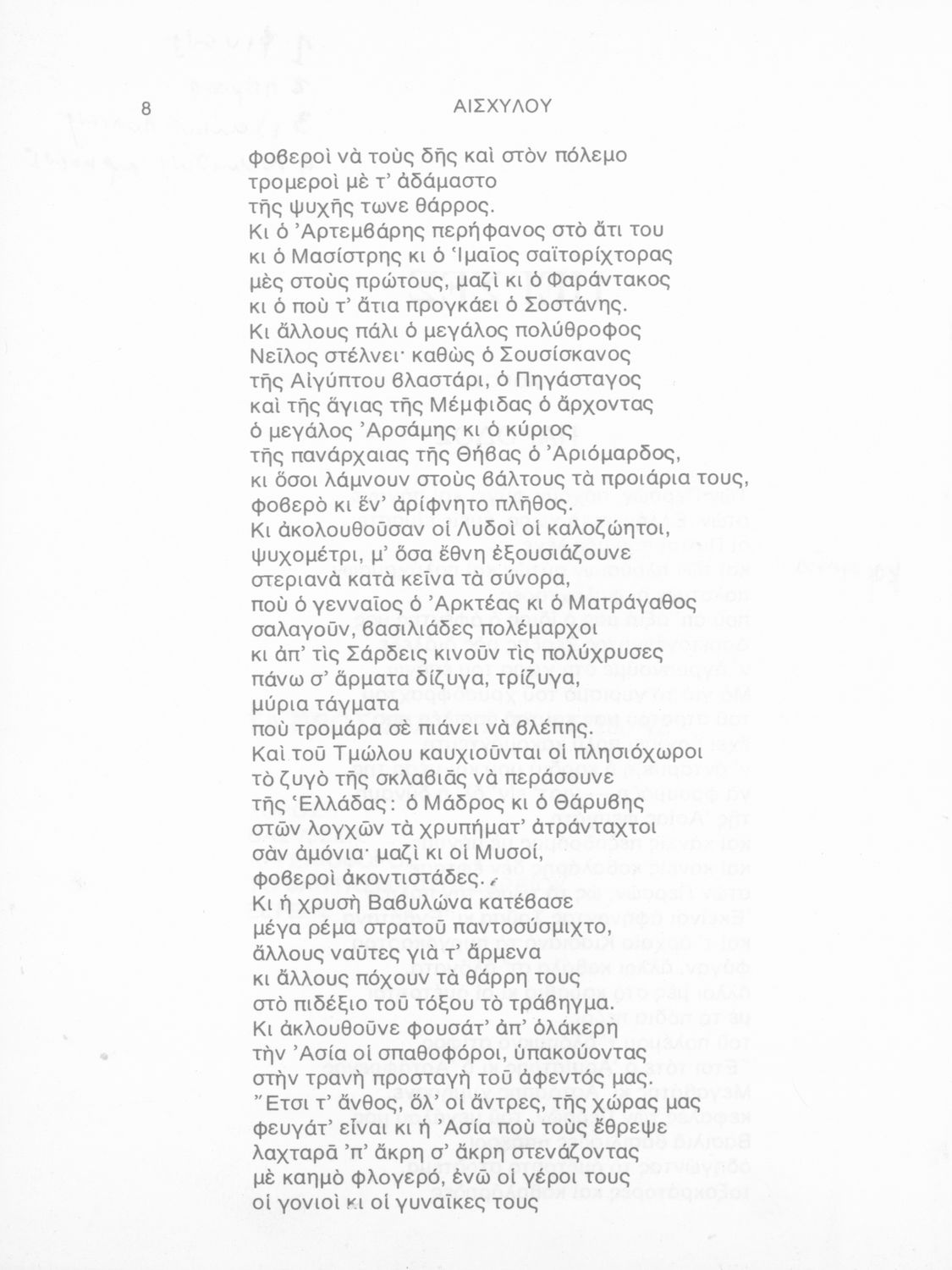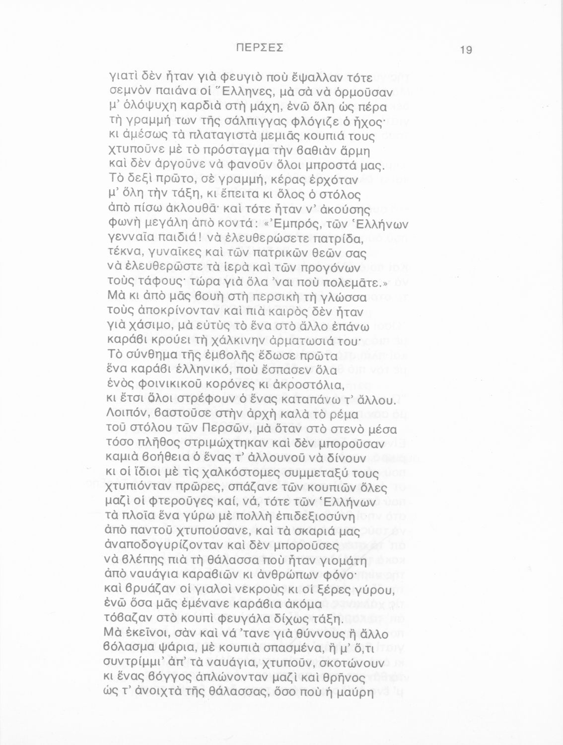 Σχολικό εγχειρίδιο Αρχαίων Ελληνικών Γ΄ Λυκείου που περιλαμβάνει αποσπάσματα από την Τραγωδία του Αισχύλου Πέρσες σε μετάφραση Ι. Ν. Γρυπάρη, εισαγωγικό σημείωμα σχετικά με την αρχαία ελληνική κωμωδία του Ι. Κ. Κακριδή και αποσπάσματα από την κωμωδία του Αριστοφάνη Βάτραχοι σε μετάφραση και ερμηνευτικά σχόλια του Θρ. Σταύρου.