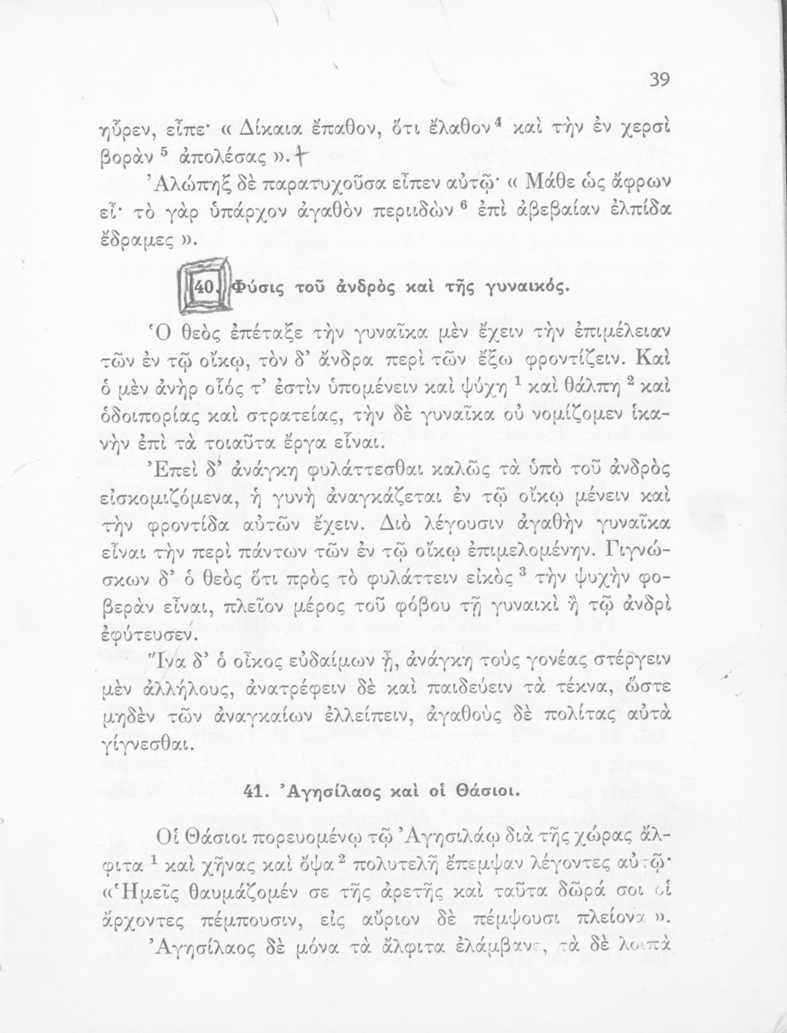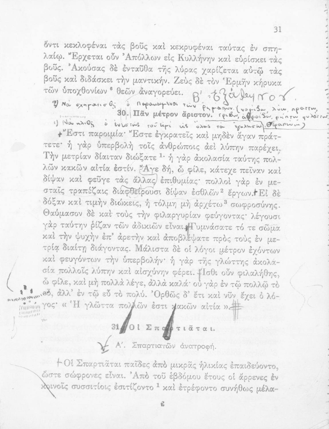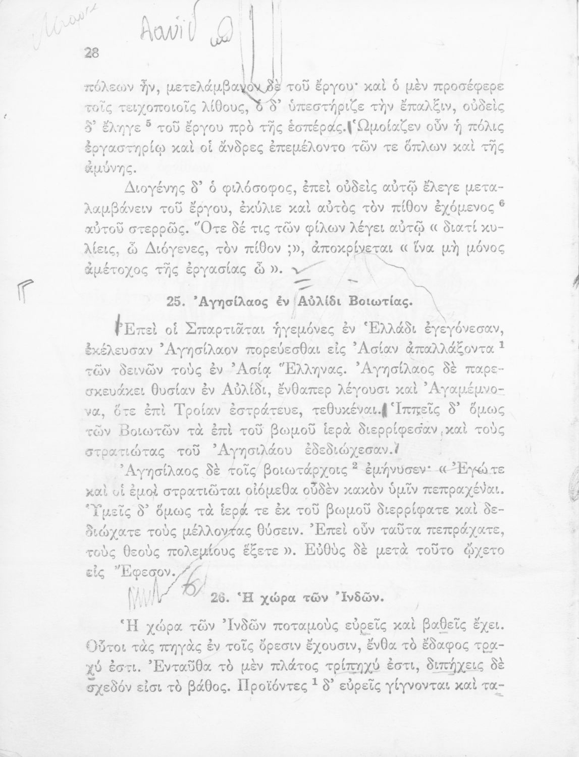 Σχολικό Εγχειρίδιο Αρχαίων Ελληνικών που περιλαμβάνει κείμενα προσαρμοσμένα στη διδασκαλία των γραμματικών και συντακτικών φαινομένων, και ερμηνευτικές και λεξιλογικές σημειώσεις.