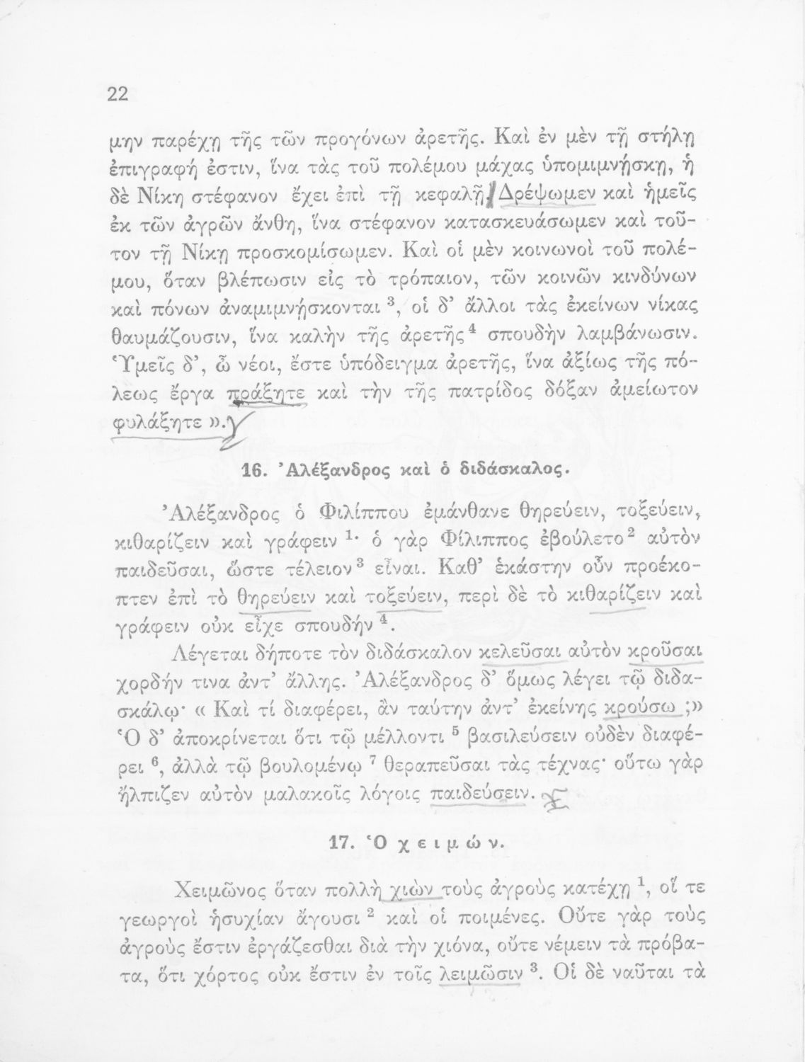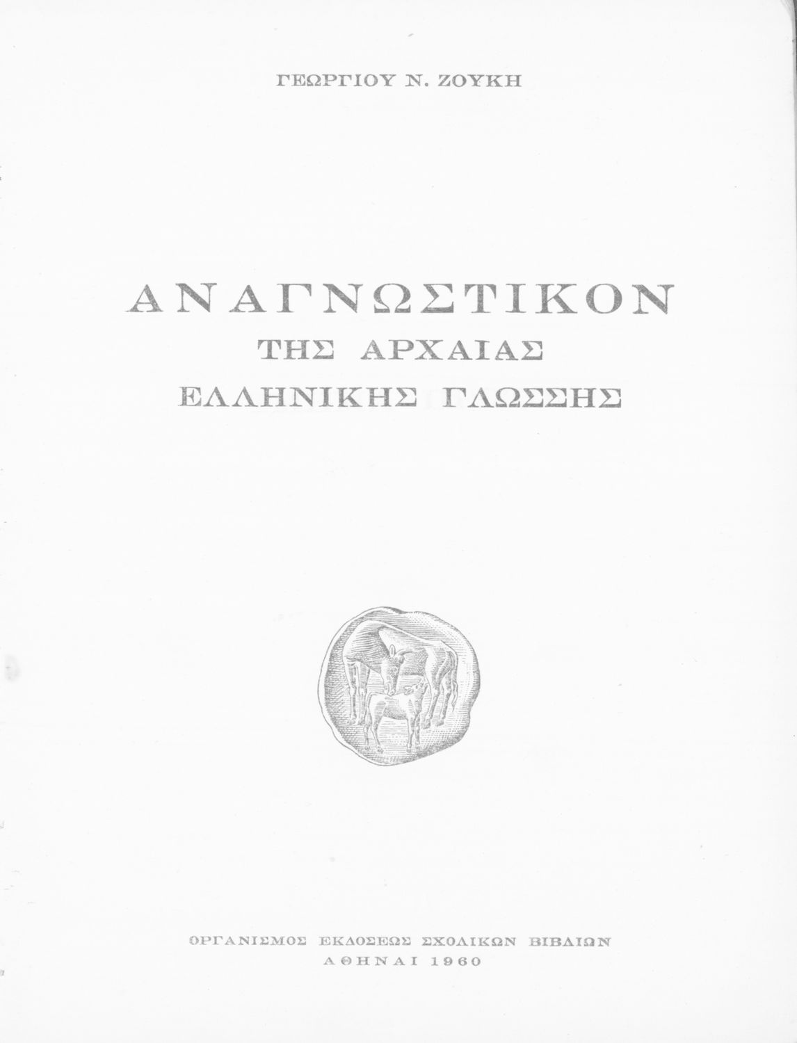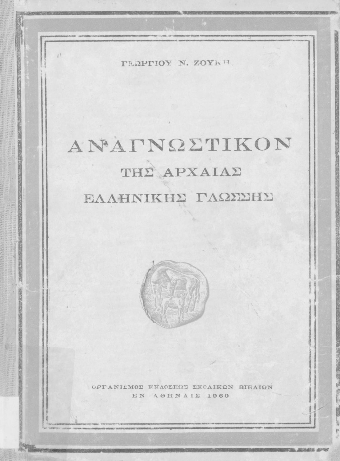 Σχολικό Εγχειρίδιο Αρχαίων Ελληνικών που περιλαμβάνει κείμενα προσαρμοσμένα στη διδασκαλία των γραμματικών και συντακτικών φαινομένων, και ερμηνευτικές και λεξιλογικές σημειώσεις.