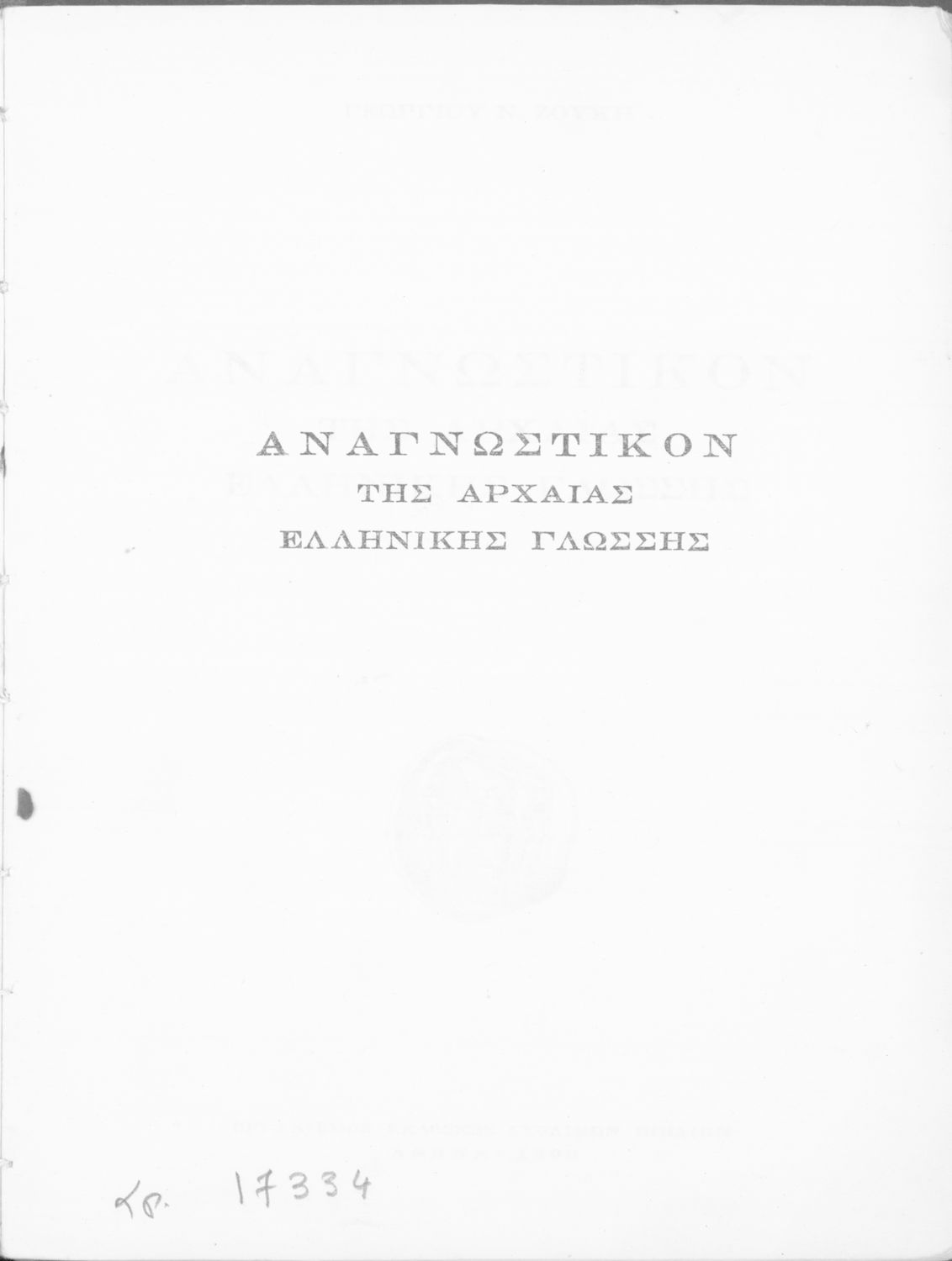 Κωδικός αναγνώρισης: 01-17334 Τίτλος: Αναγνωστικόν της αρχαίας ελληνικής γλώσσης Συγγραφέας: Γεώργιος Ν. Ζούκης (σχόλια), Γ. Ανδρουτσόπουλος (επιμ.) Μέγεθος και υπόστρωμα: Σχολικό εγχειρίδιο, σκληρό εξώφυλλο, 163 σελίδες. Σκίτσα, σχεδιαγράμματα και χάρτης (ασπρόμαυρα). |