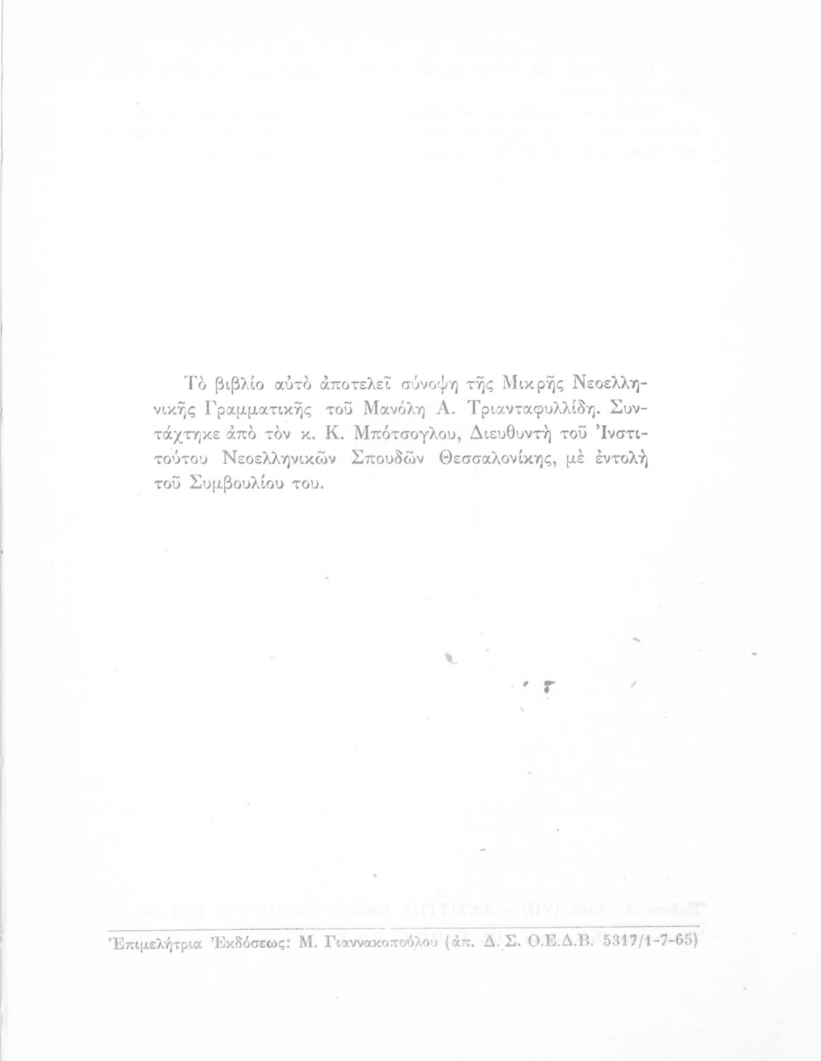 Κωδικός αναγνώρισης: 01-17336 Τίτλος: Μικρή Νεοελληνική Γραμματική Δημοτικού Σχολείου Συγγραφέας: Μανόλης Τριανταφυλλίδης Μέγεθος και υπόστρωμα: Σχολικό εγχειρίδιο, 20εκ., μαλακό εξώφυλλο, 159 σελίδες. |
