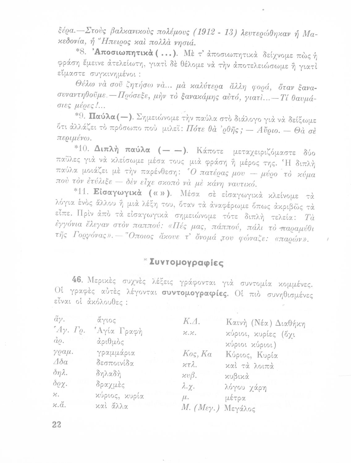 Σχολικό εγχειρίδιο γραμματικής για τους μαθητές της Ε΄ και ΣΤ΄ τάξης του Δημοτικού. Περιέχει τη διδασκαλία της γραμματικής της καθαρεύουσας με κανόνες και παραδείγματα.