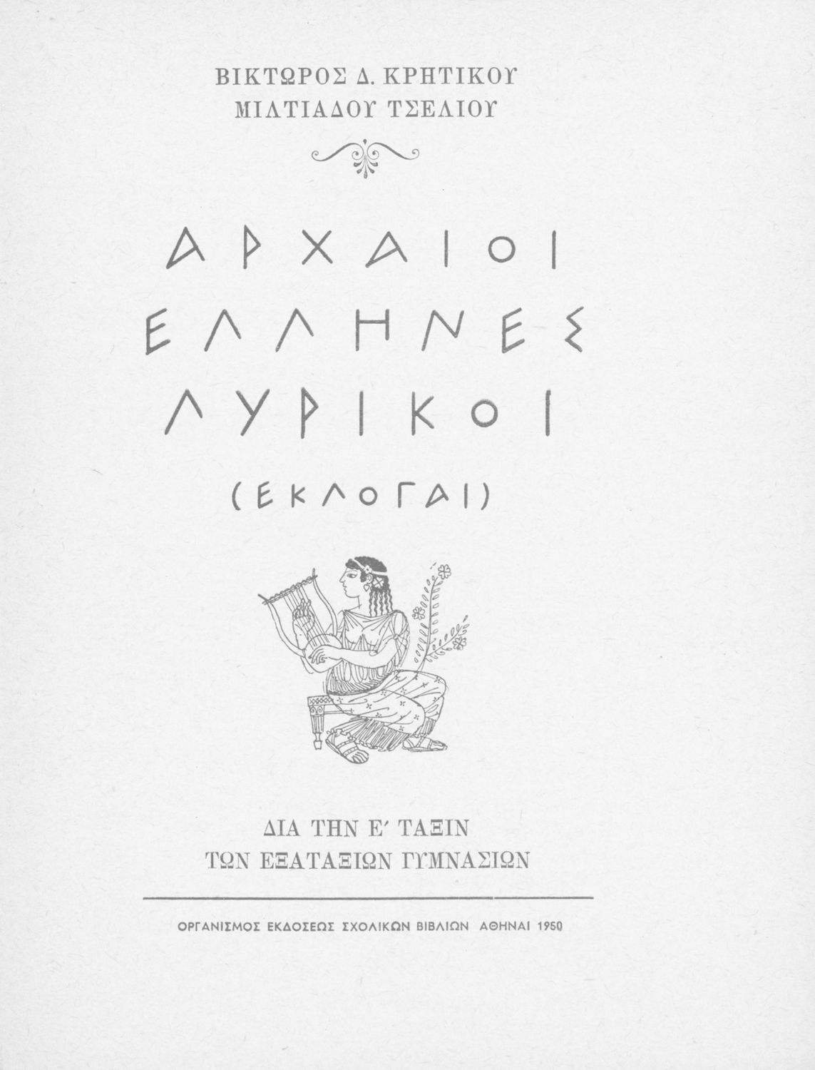 Τίτλος: Αρχαίοι Έλληνες Λυρικοί (Εκλογαί) δια την Ε΄ τάξιν των Εξαταξίων Γυμνασίων