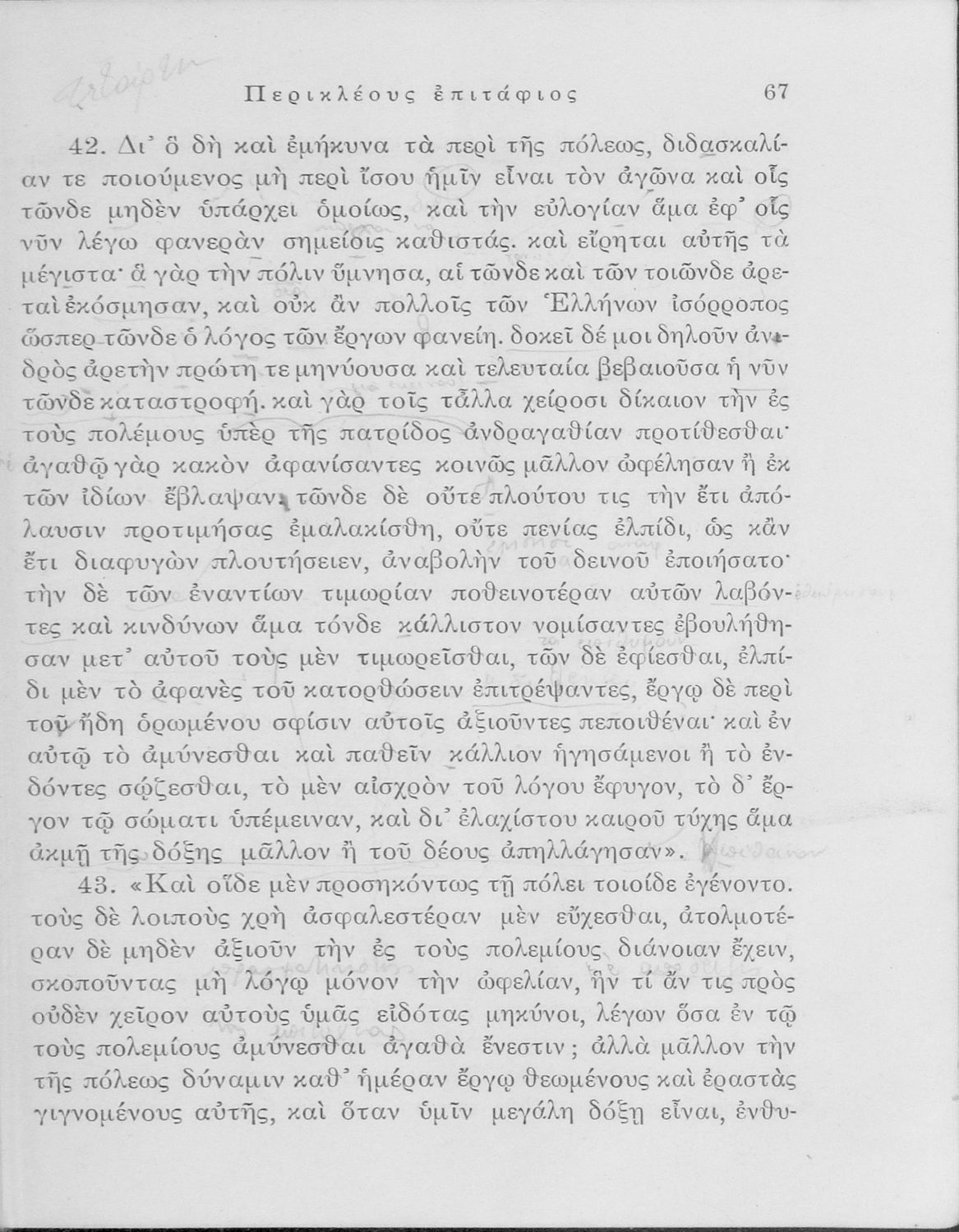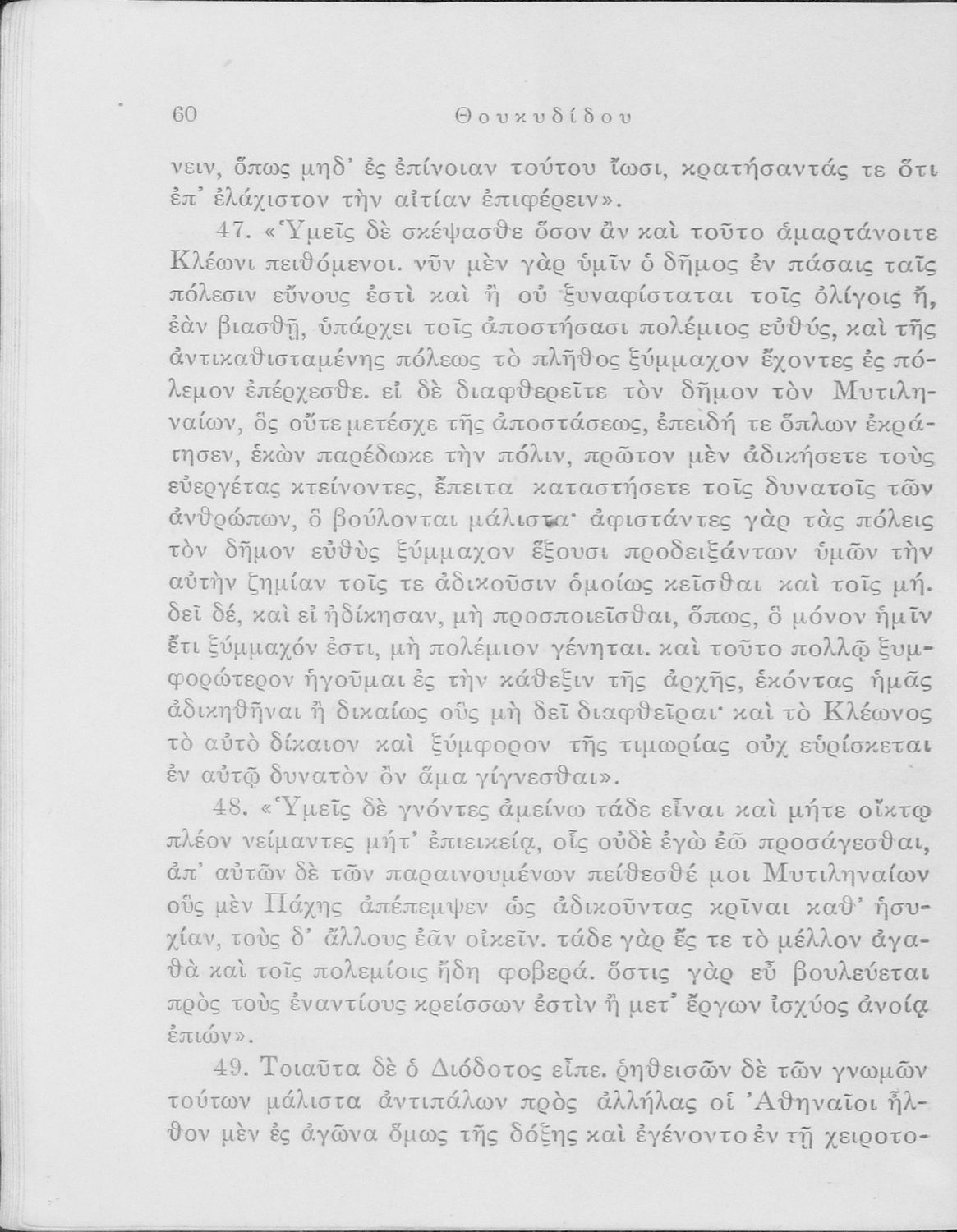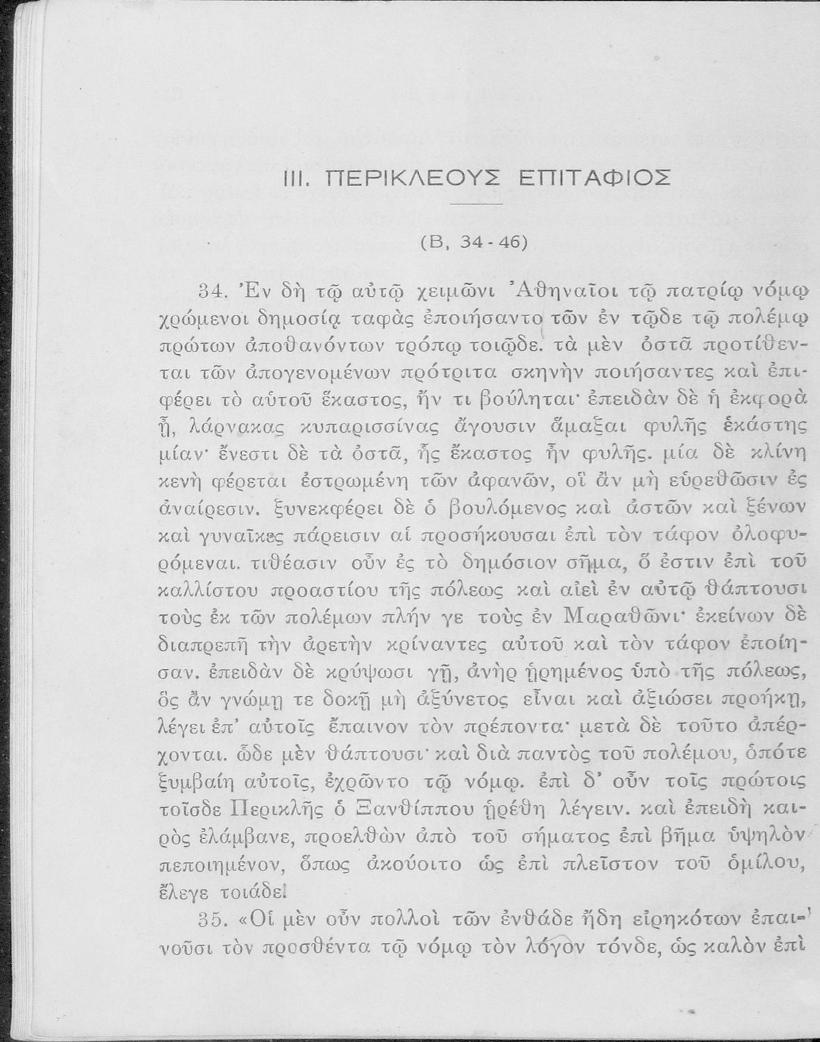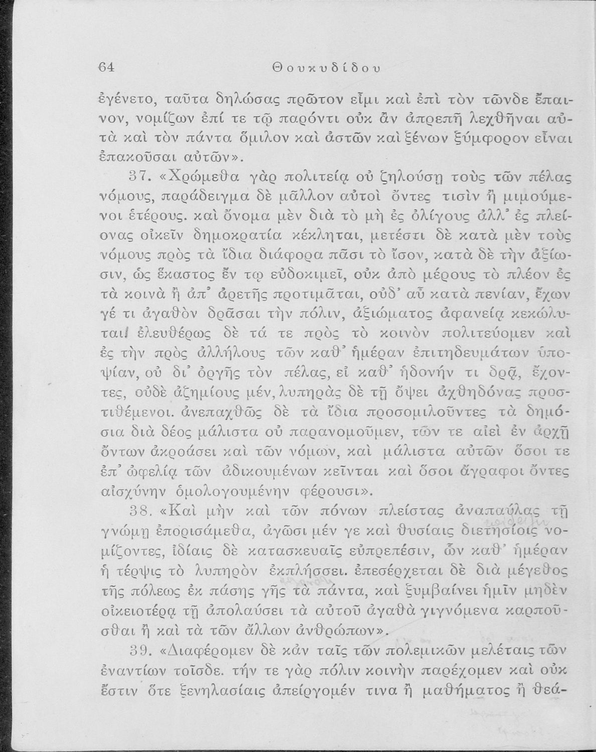 Σχολικό εγχειρίδιο Αρχαίων Ελληνικών για τις Δ΄, Ε΄ και ΣΤ΄ Γυμνασίου παλαιού τύπου που περιλαμβάνει σύντομο βιογραφικό σημείωμα του Θουκυδίδη, περιγραφή του ιστορικού πλαισίου, αποσπάσματα από τα Πλαταϊκά, τα Λεσβιακά και τον Επιτάφιο του Περικλή και ερμηνευτικές σημειώσεις.