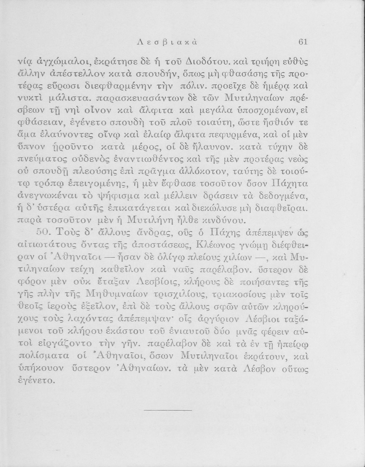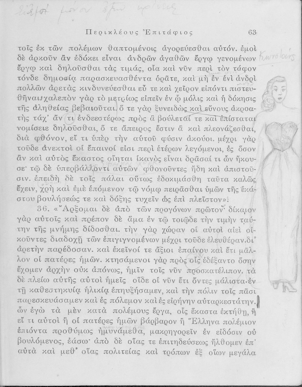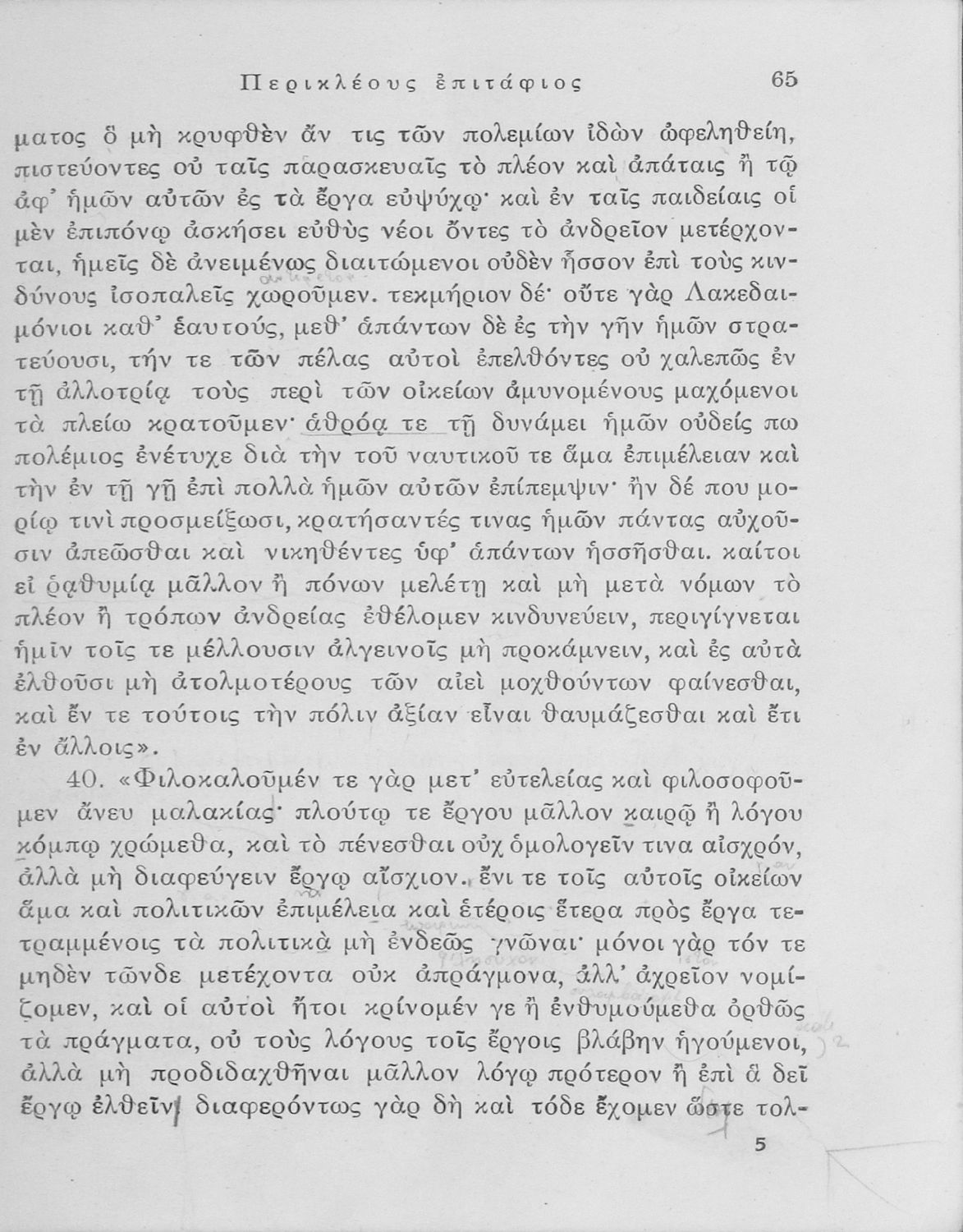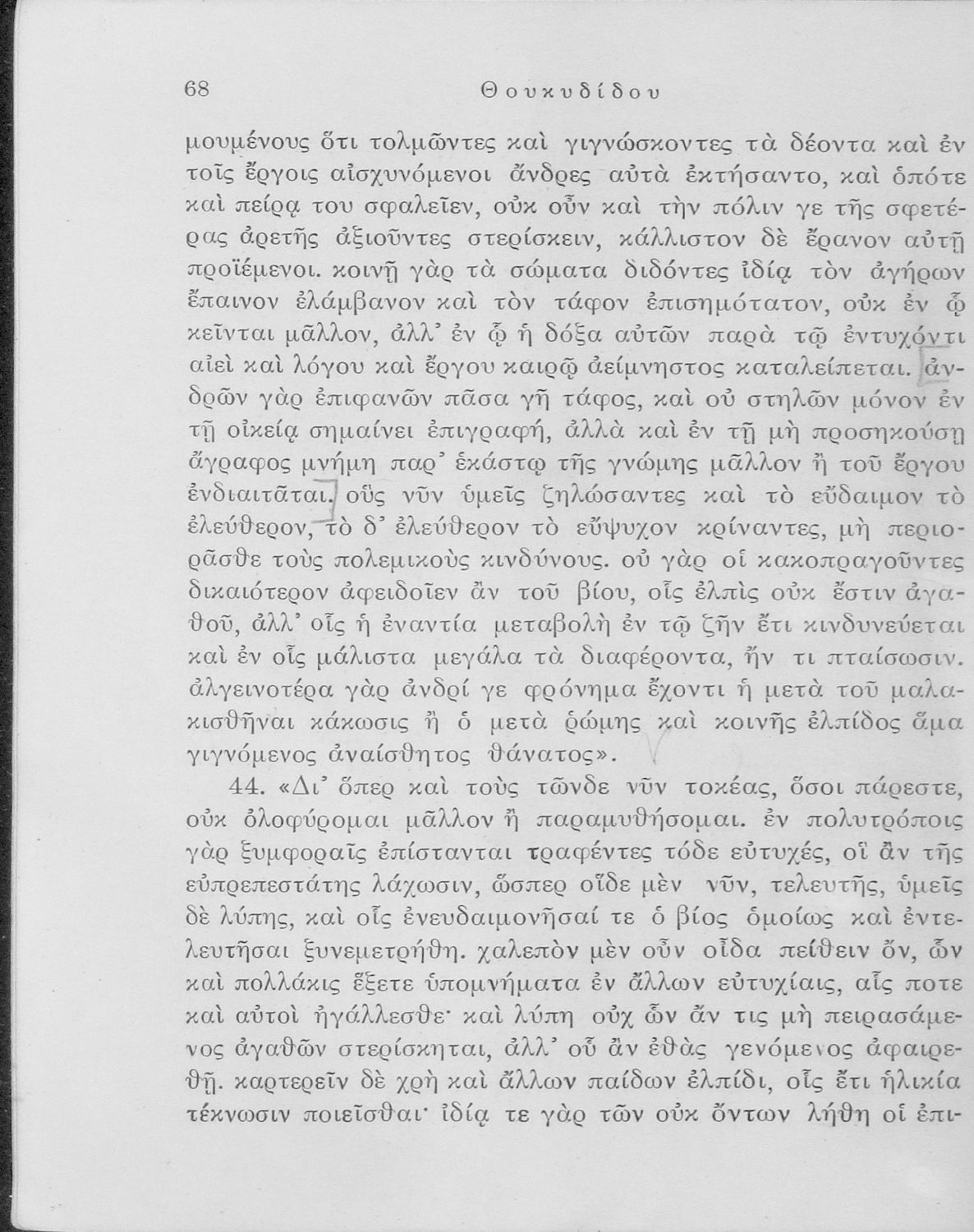 Σχολικό εγχειρίδιο Αρχαίων Ελληνικών για τις Δ΄, Ε΄ και ΣΤ΄ Γυμνασίου παλαιού τύπου που περιλαμβάνει σύντομο βιογραφικό σημείωμα του Θουκυδίδη, περιγραφή του ιστορικού πλαισίου, αποσπάσματα από τα Πλαταϊκά, τα Λεσβιακά και τον Επιτάφιο του Περικλή και ερμηνευτικές σημειώσεις.