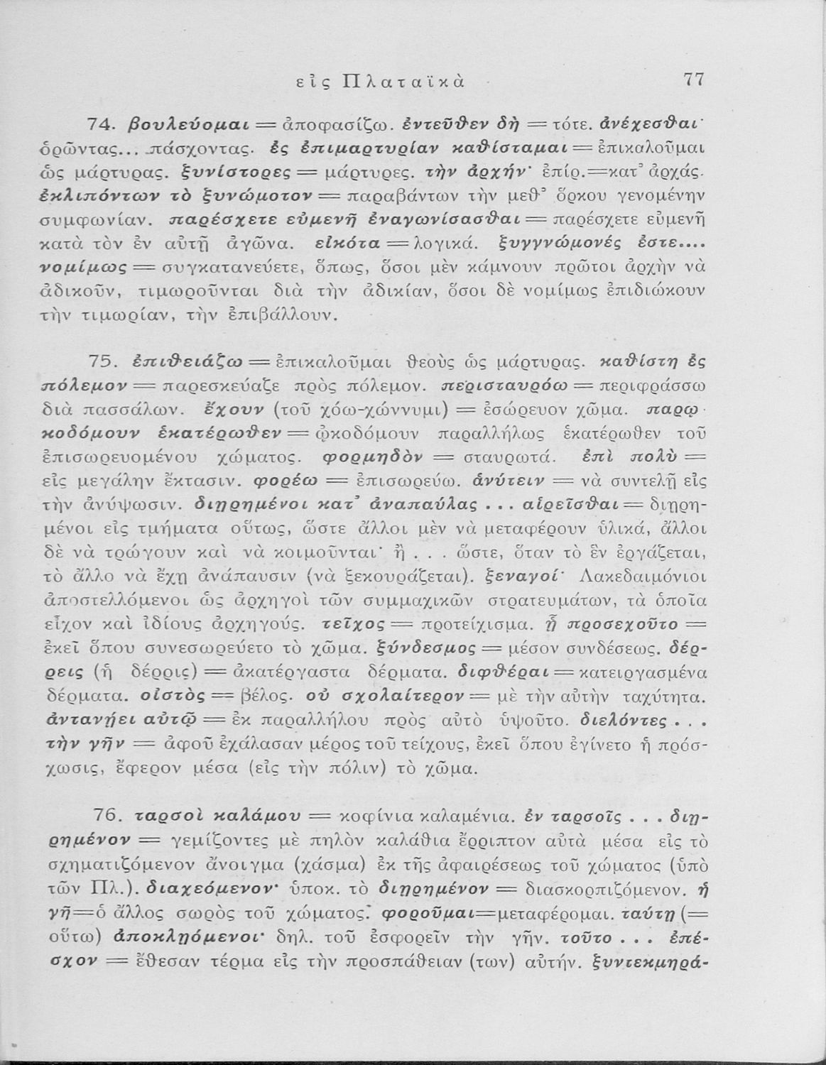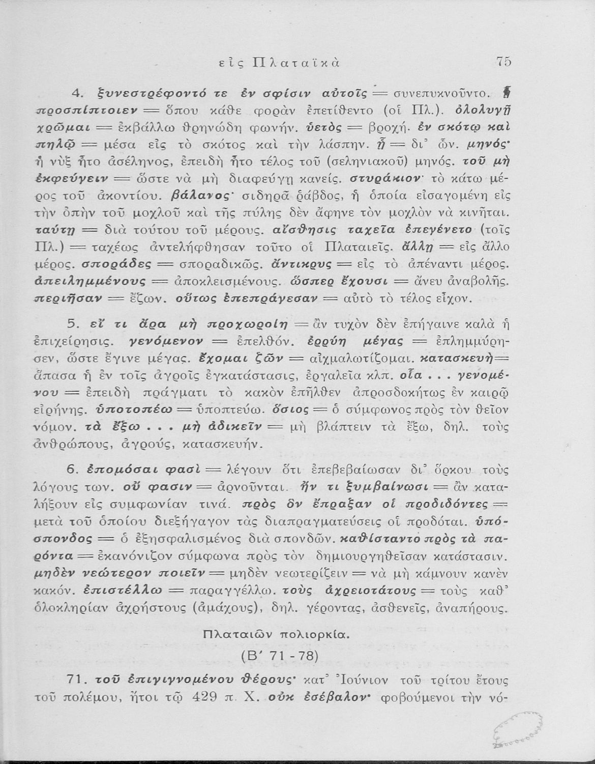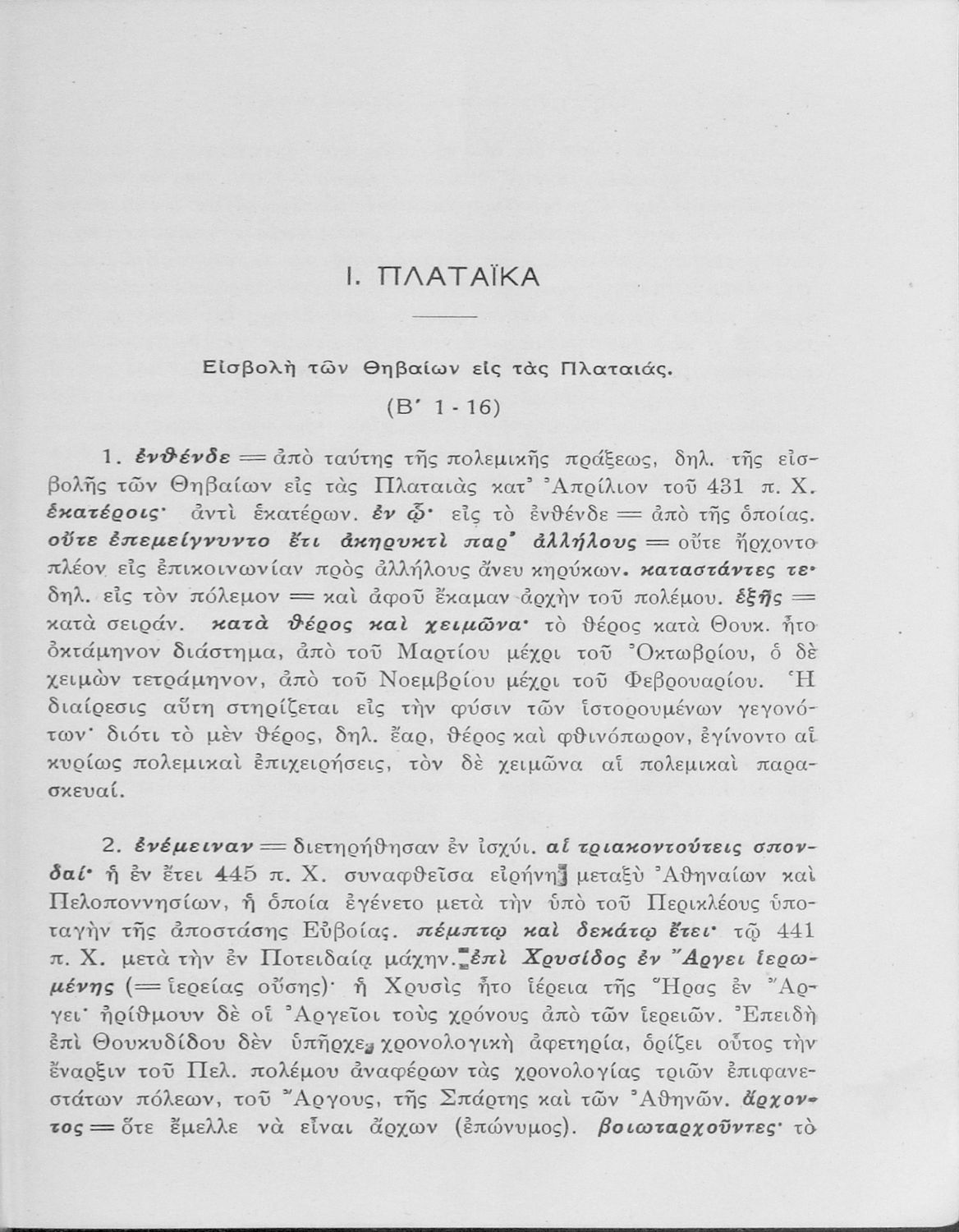 Σχολικό εγχειρίδιο Αρχαίων Ελληνικών για τις Δ΄, Ε΄ και ΣΤ΄ Γυμνασίου παλαιού τύπου που περιλαμβάνει σύντομο βιογραφικό σημείωμα του Θουκυδίδη, περιγραφή του ιστορικού πλαισίου, αποσπάσματα από τα Πλαταϊκά, τα