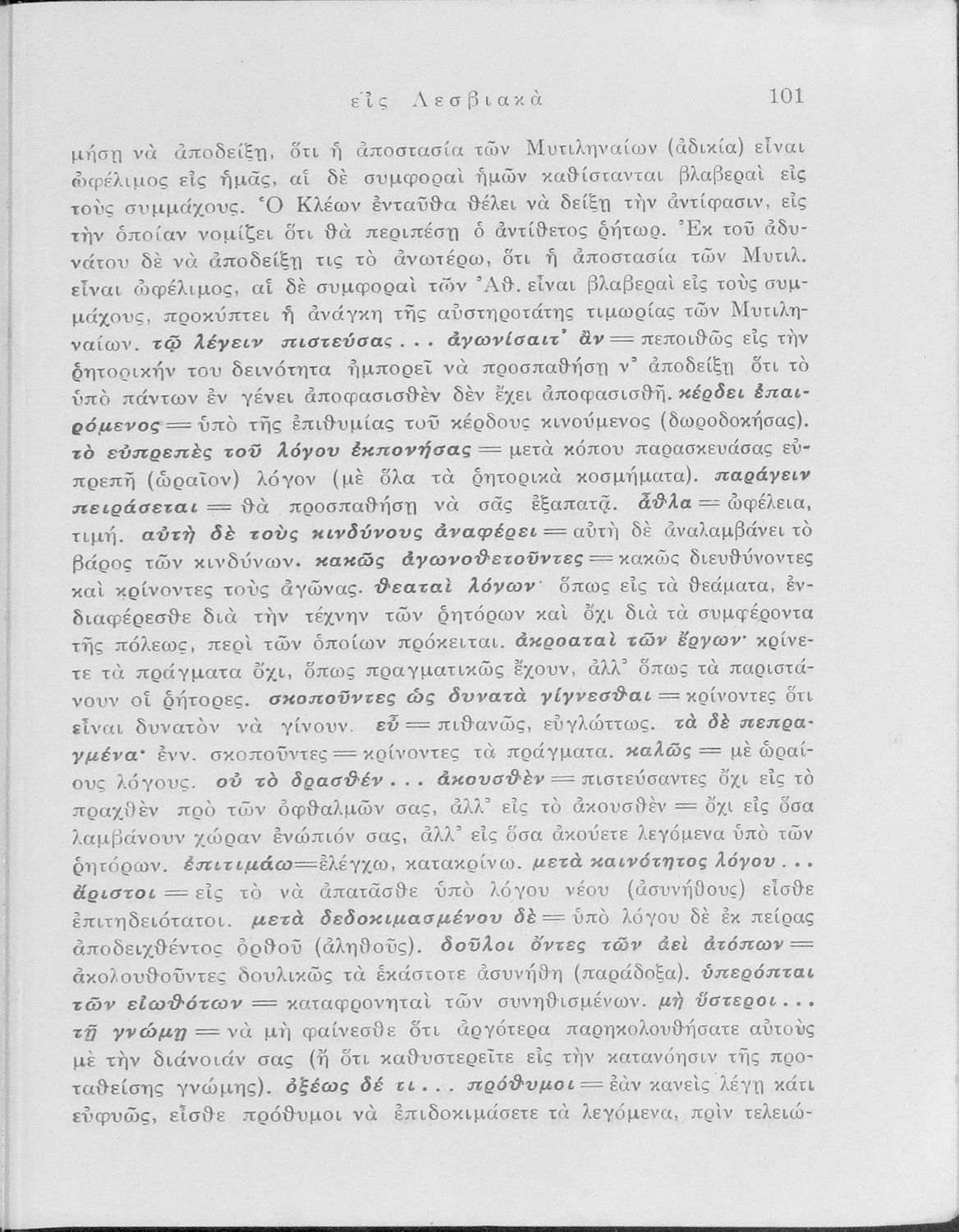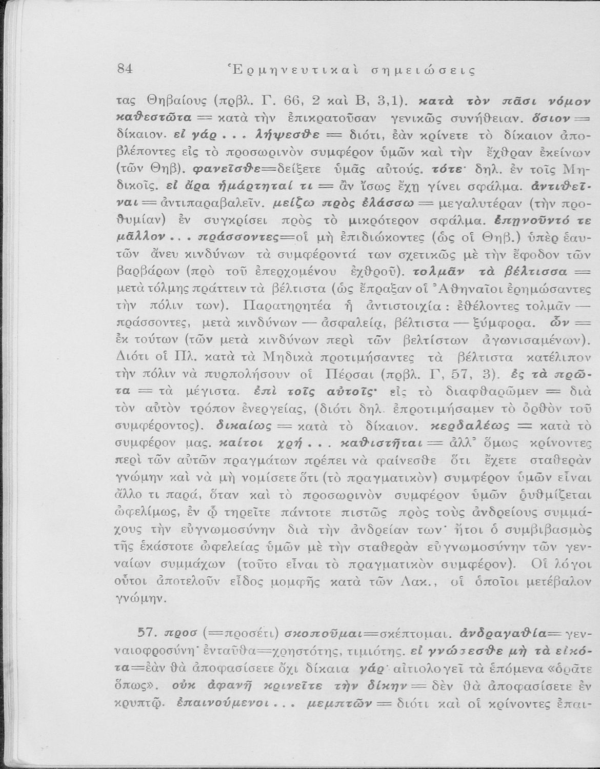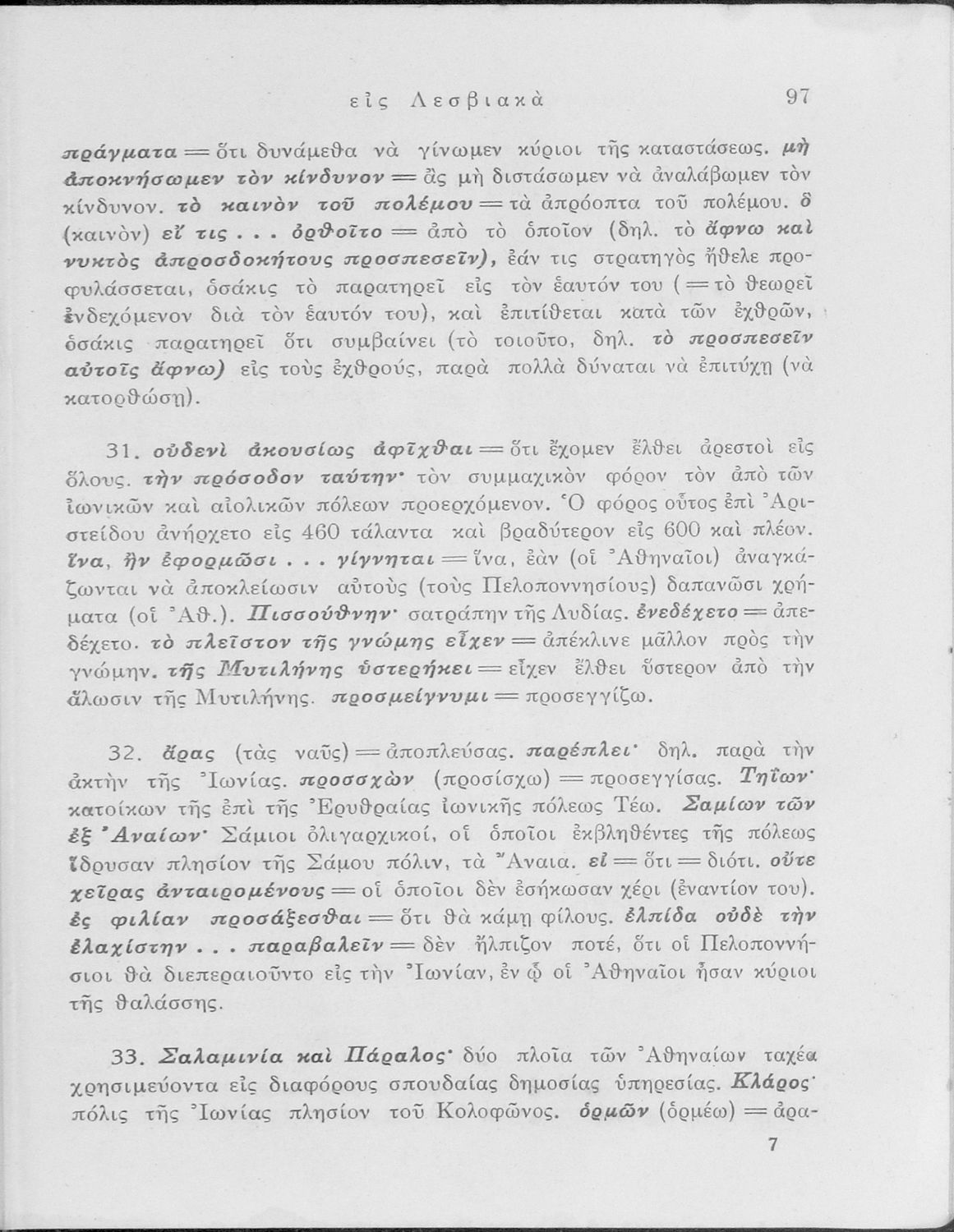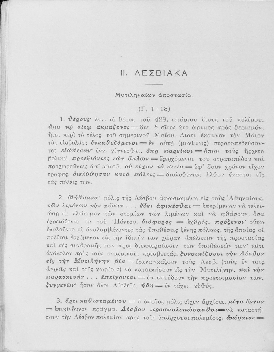 Σχολικό εγχειρίδιο Αρχαίων Ελληνικών για τις Δ΄, Ε΄ και ΣΤ΄ Γυμνασίου παλαιού τύπου που περιλαμβάνει σύντομο βιογραφικό σημείωμα του Θουκυδίδη, περιγραφή του ιστορικού πλαισίου, αποσπάσματα από τα Πλαταϊκά, τα Λεσβιακά και τον Επιτάφιο του Περικλή και ερμηνευτικές σημειώσεις.