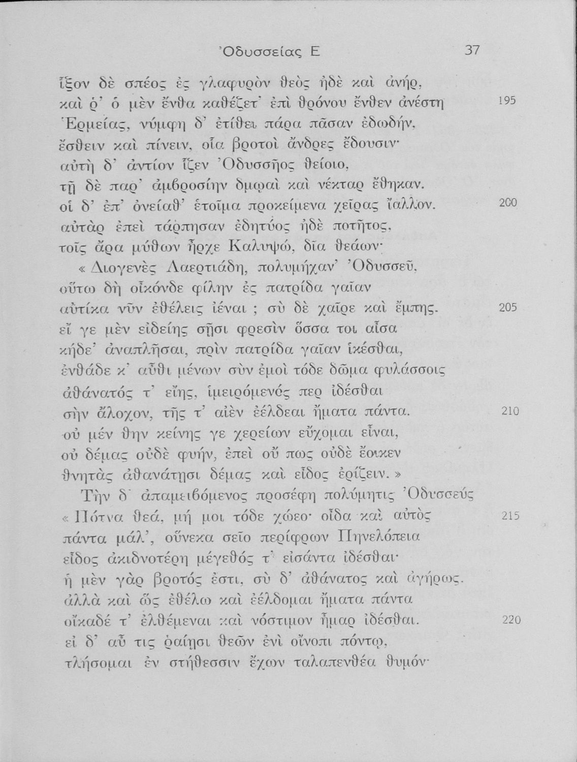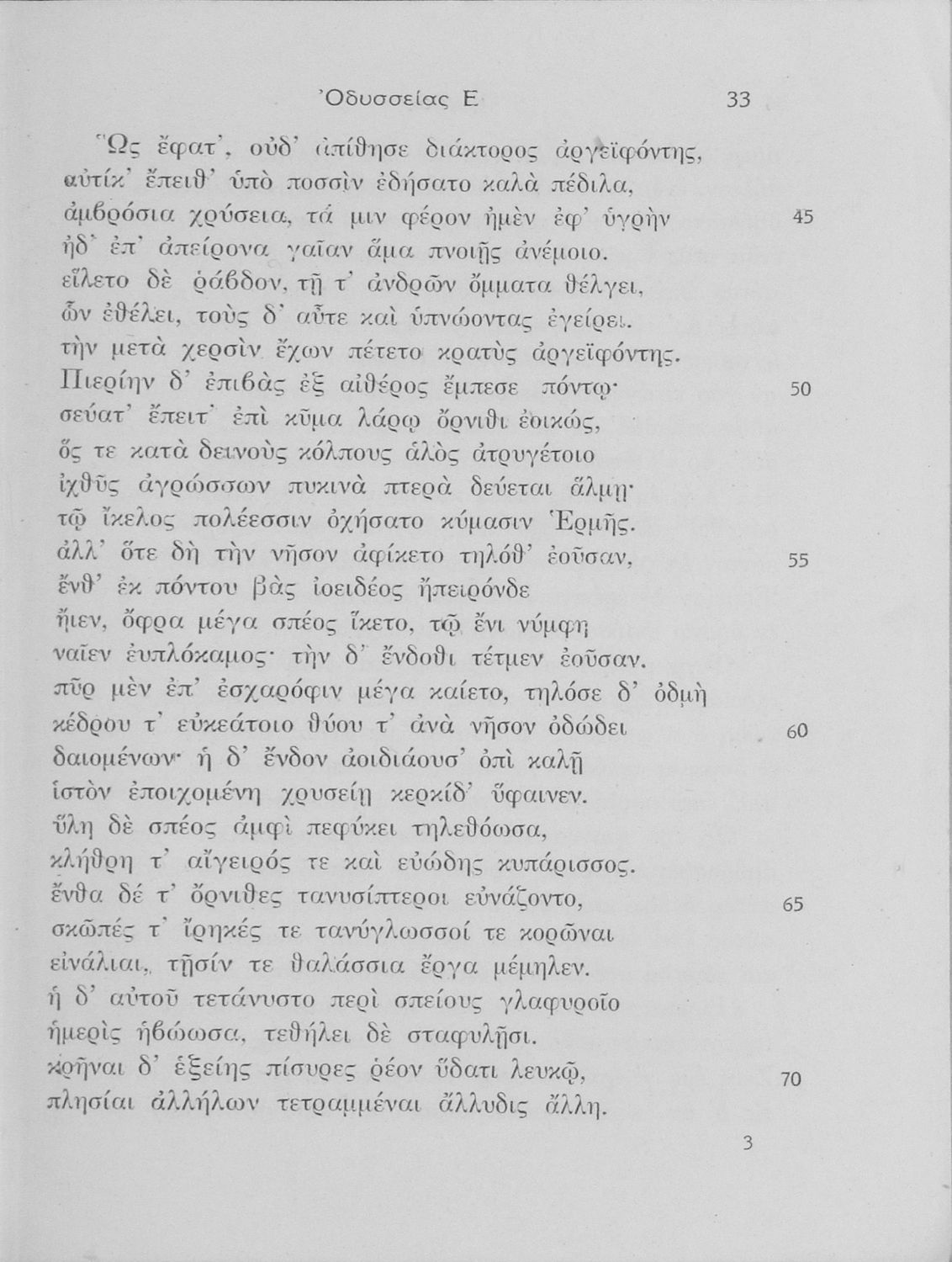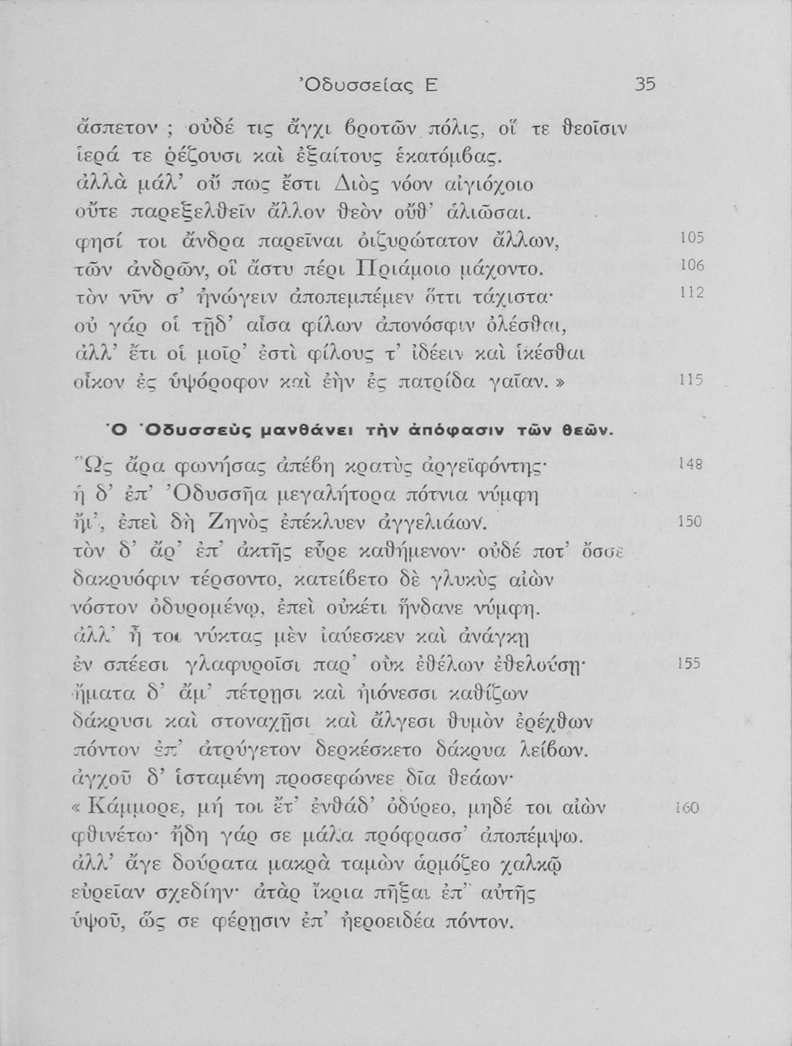 Σχολικό εγχειρίδιο της Ε΄ Γυμνασίου για το μάθημα των Αρχαίων Ελληνικών. Περιέχει αποσπάσματα από τις ραψωδίες της Οδύσσειας, ερμηνευτικά και πραγματολογικά σχόλια και τις γραμματικές παρατηρήσεις.