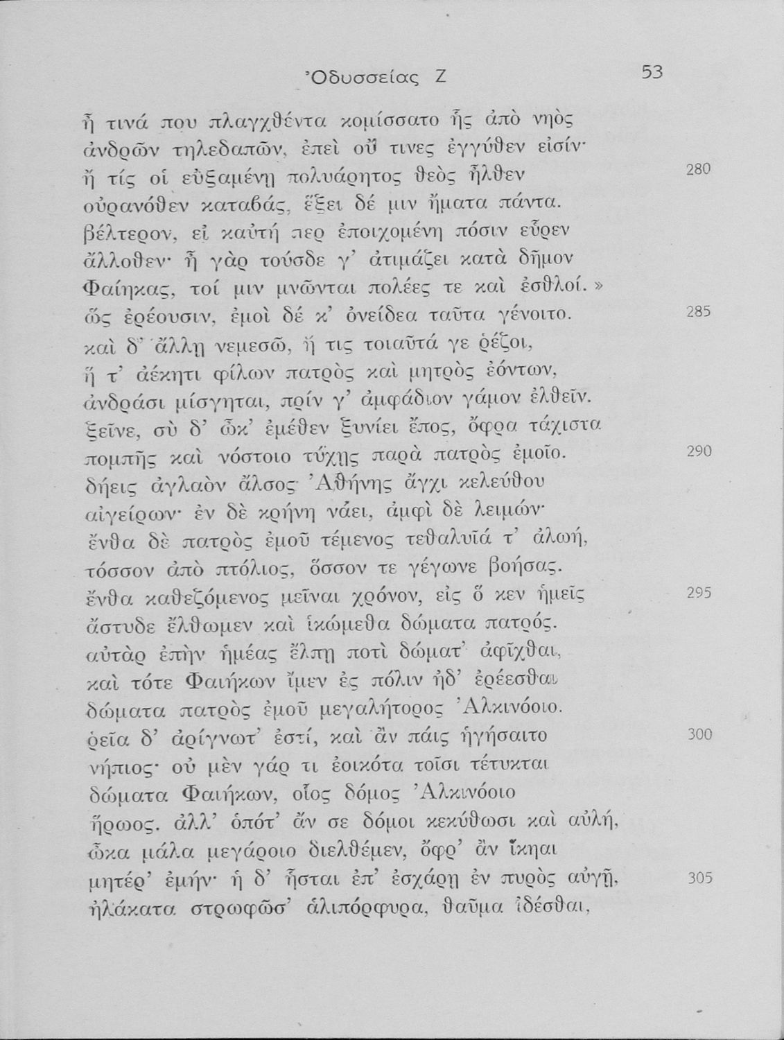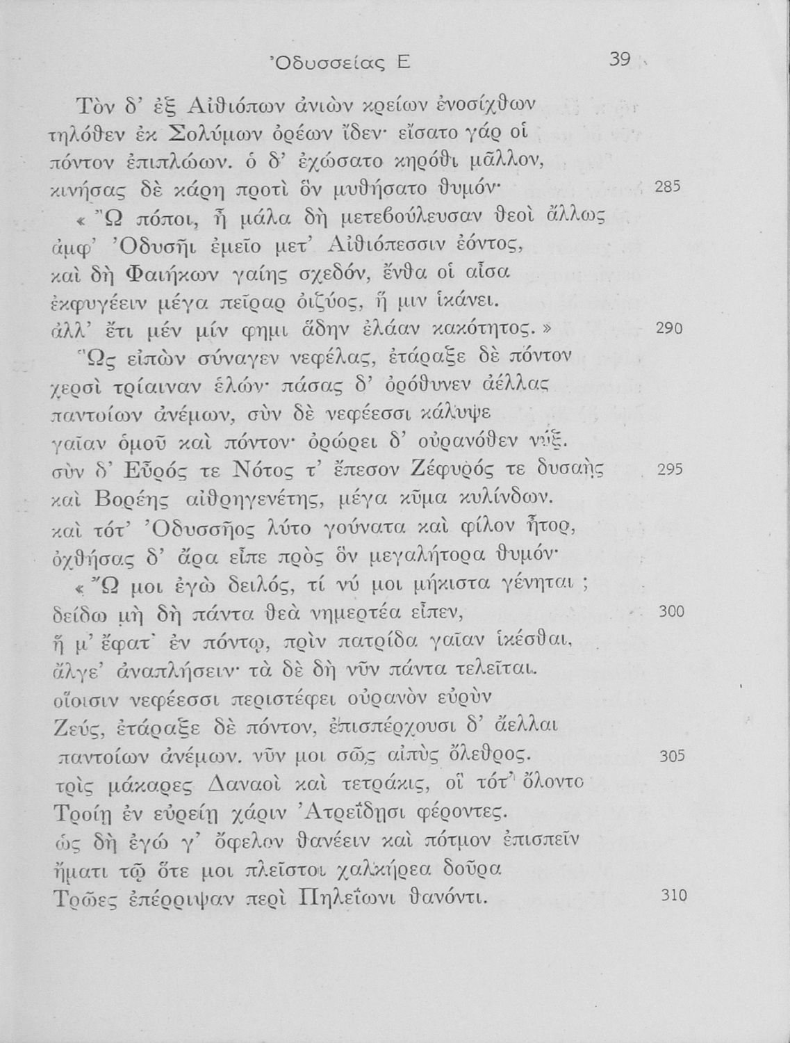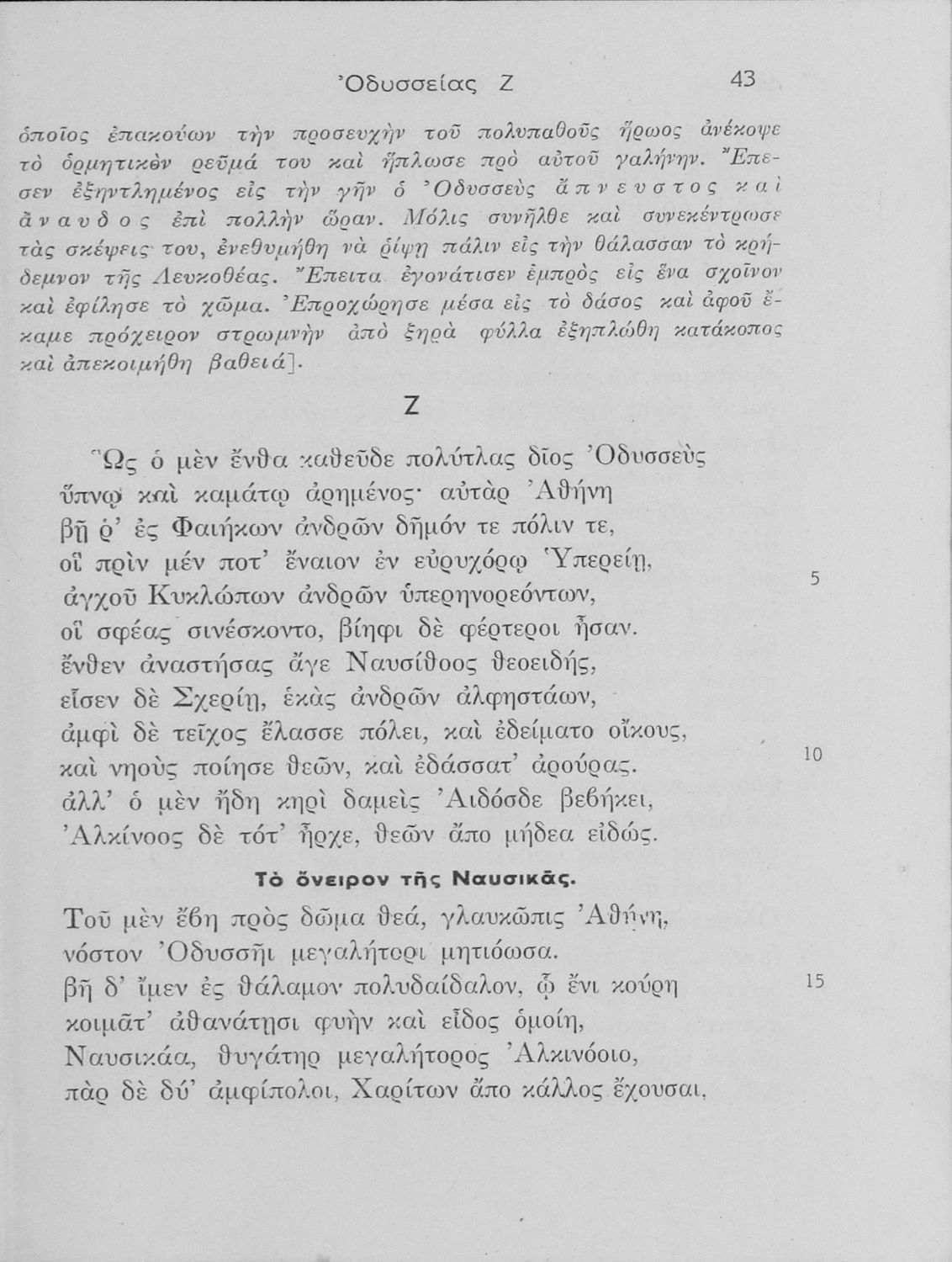 Σχολικό εγχειρίδιο Αρχαίων Ελληνικών Ε΄ Γυμνασίου που περιλαμβάνει εισαγωγικά σχόλια για τις αρχές της ελληνικής ποίησης, βιογραφία και εργογραφία του Όμηρου, αποσπάσματα από ραψωδίες της Οδύσσειας και ερμηνευτικά, πραγματολογικά και σημασιολογικά σχόλια.