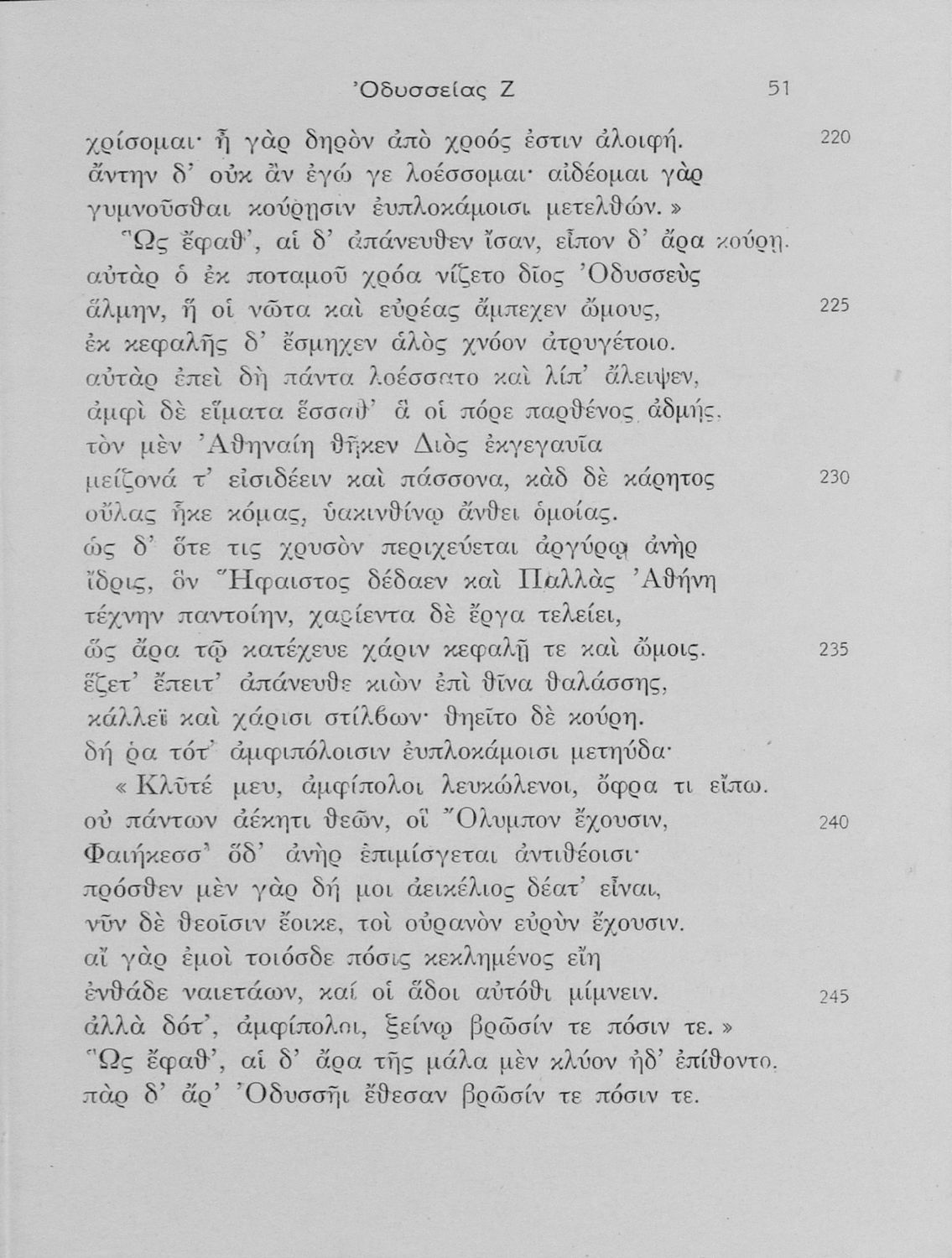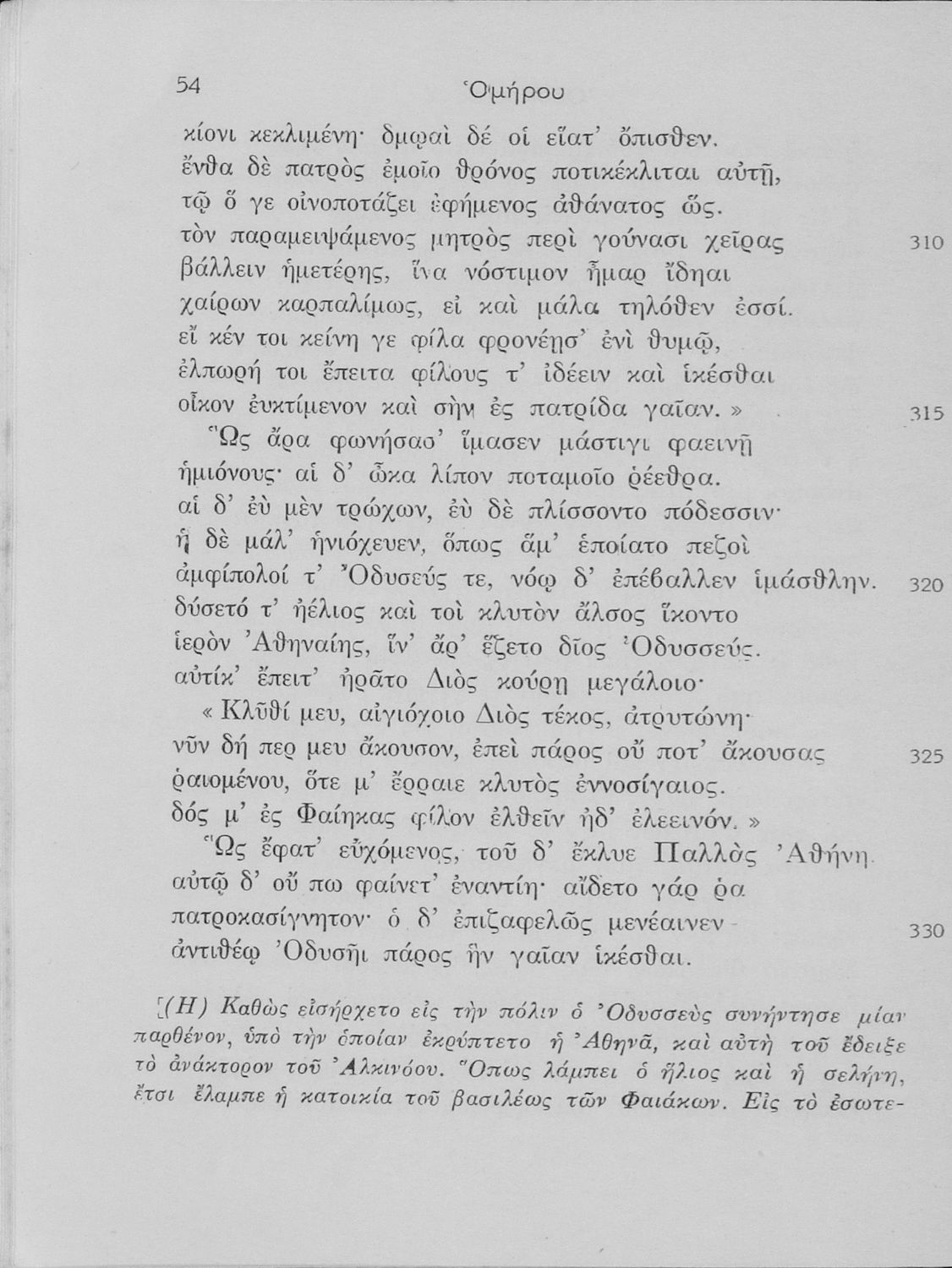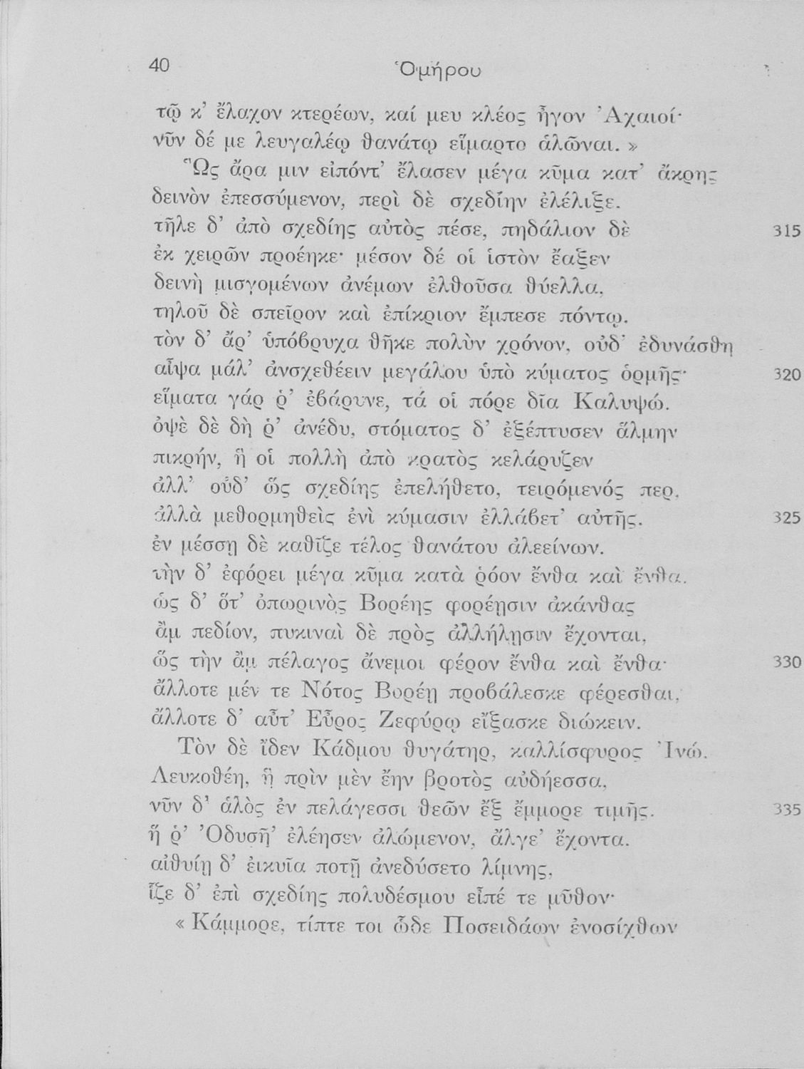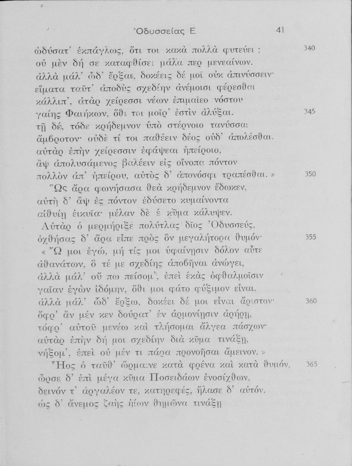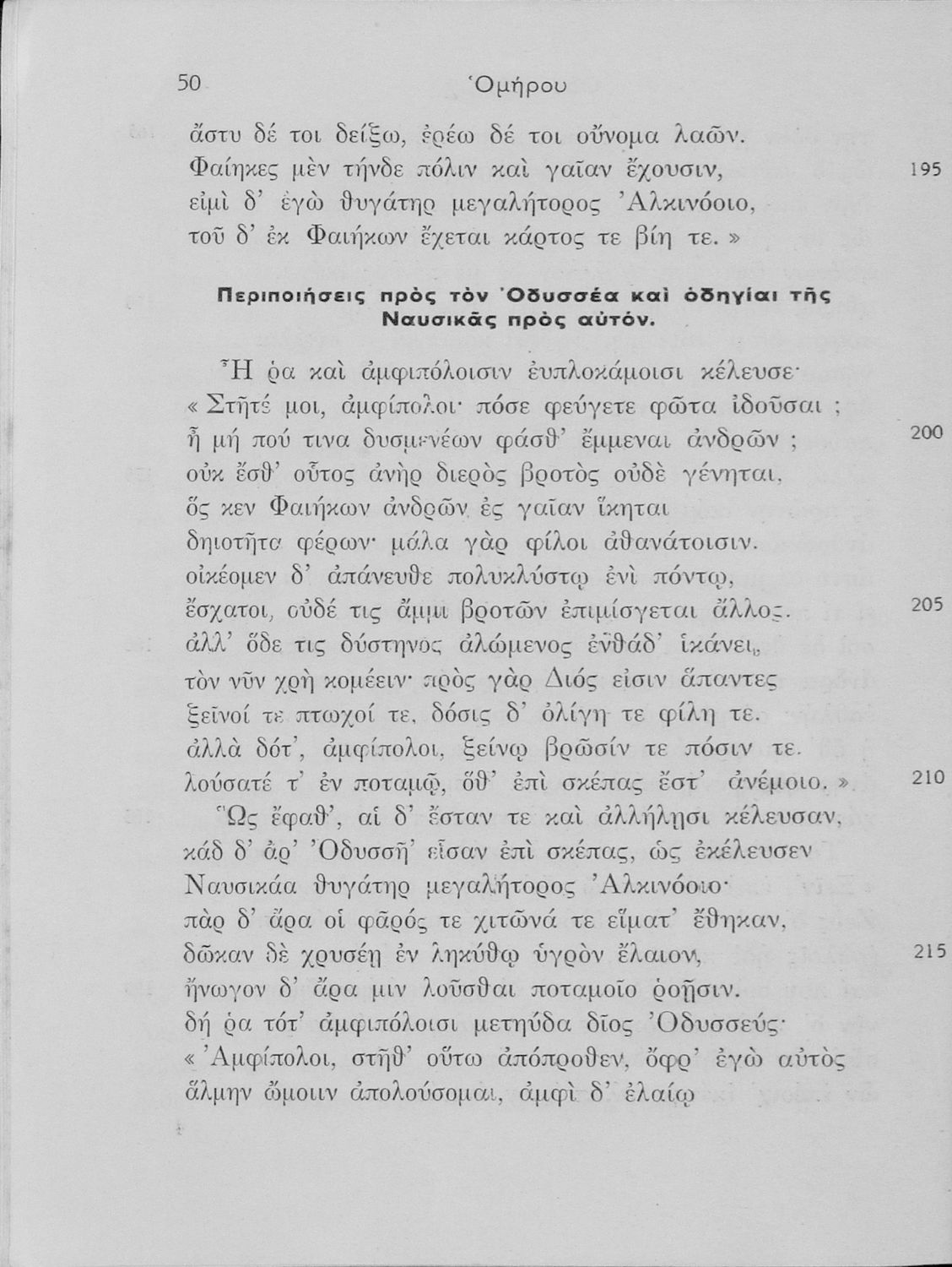 Σχολικό εγχειρίδιο της Ε΄ Γυμνασίου για το μάθημα των Αρχαίων Ελληνικών. Περιέχει αποσπάσματα από τις ραψωδίες της Οδύσσειας, ερμηνευτικά και πραγματολογικά σχόλια και τις γραμματικές παρατηρήσεις.