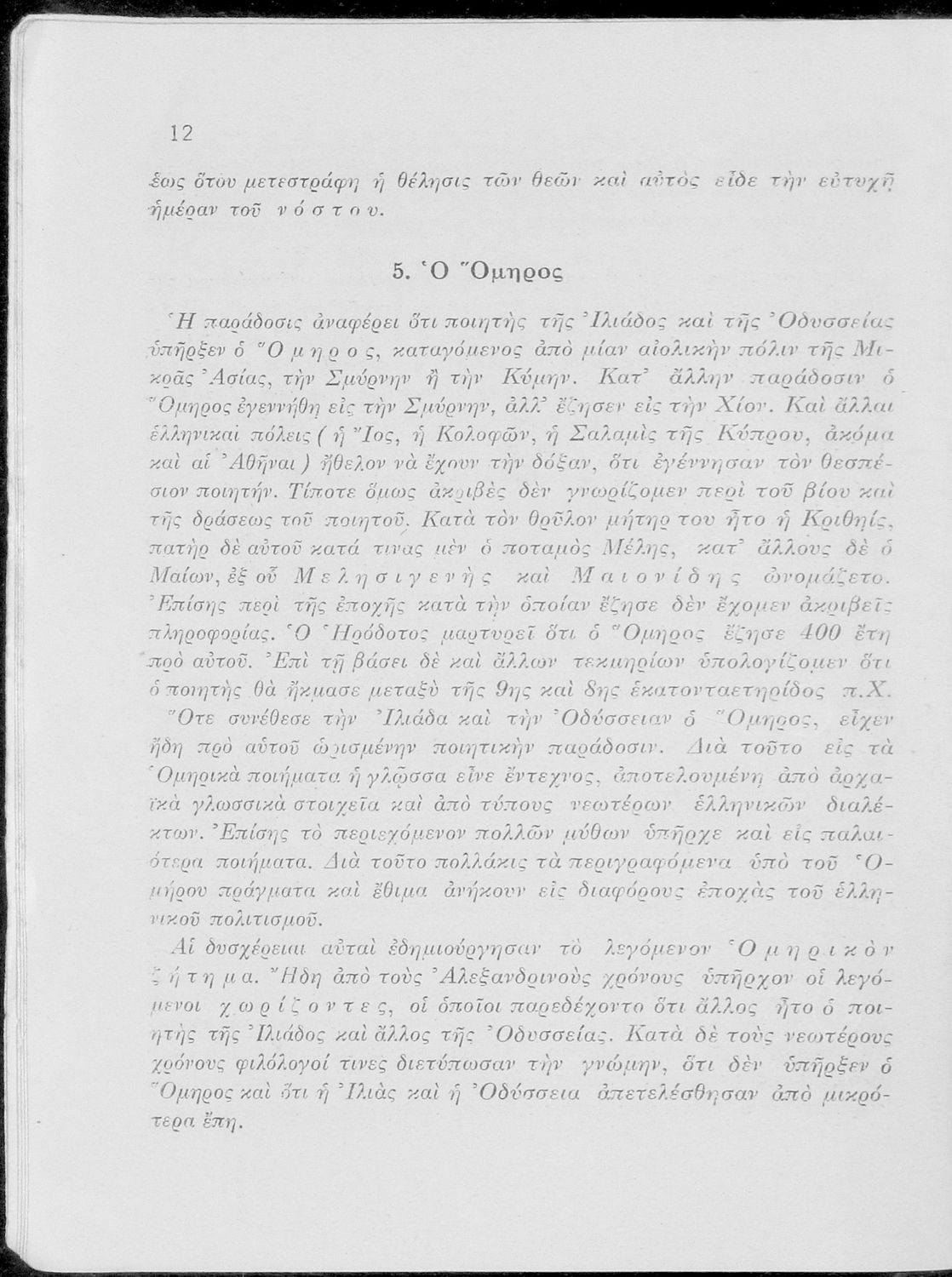Σχολικό εγχειρίδιο Αρχαίων Ελληνικών Ε΄ Γυμνασίου που περιλαμβάνει εισαγωγικά σχόλια για τις αρχές της ελληνικής ποίησης, βιογραφία και εργογραφία του Όμηρου, αποσπάσματα από ραψωδίες της Οδύσσειας και ερμηνευτικά, πραγματολογικά και σημασιολογικά σχόλια.