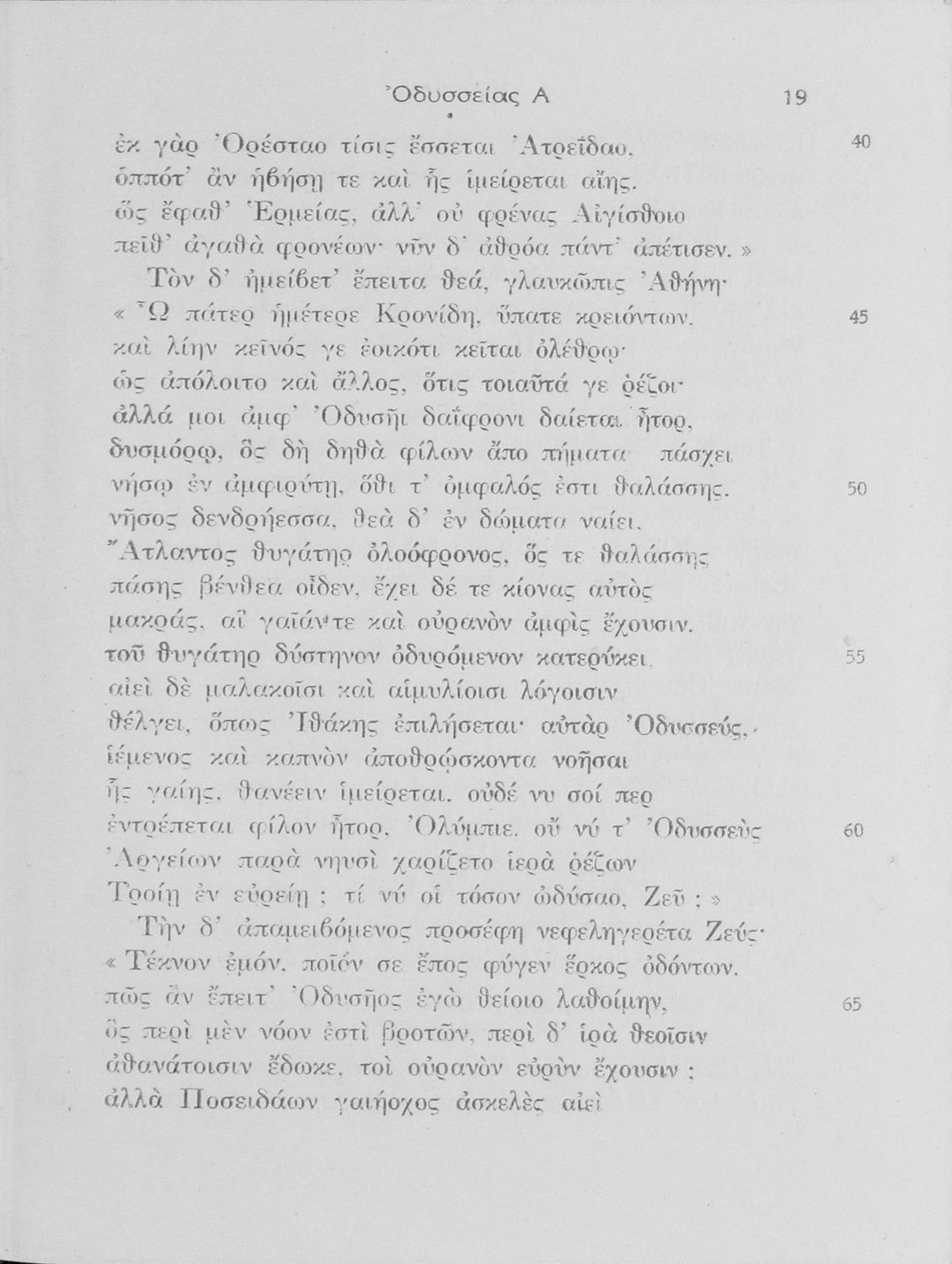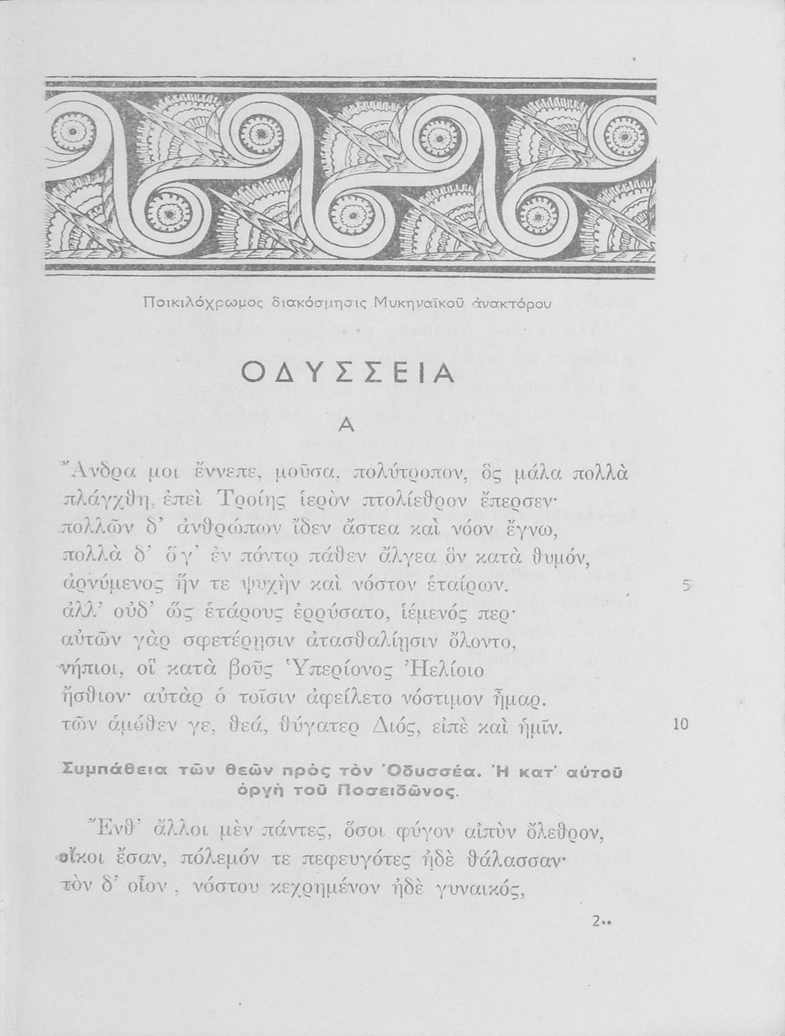 Σχολικό εγχειρίδιο της Ε΄ Γυμνασίου για το μάθημα των Αρχαίων Ελληνικών. Περιέχει αποσπάσματα από τις ραψωδίες της Οδύσσειας, ερμηνευτικά και πραγματολογικά σχόλια και τις γραμματικές παρατηρήσεις.