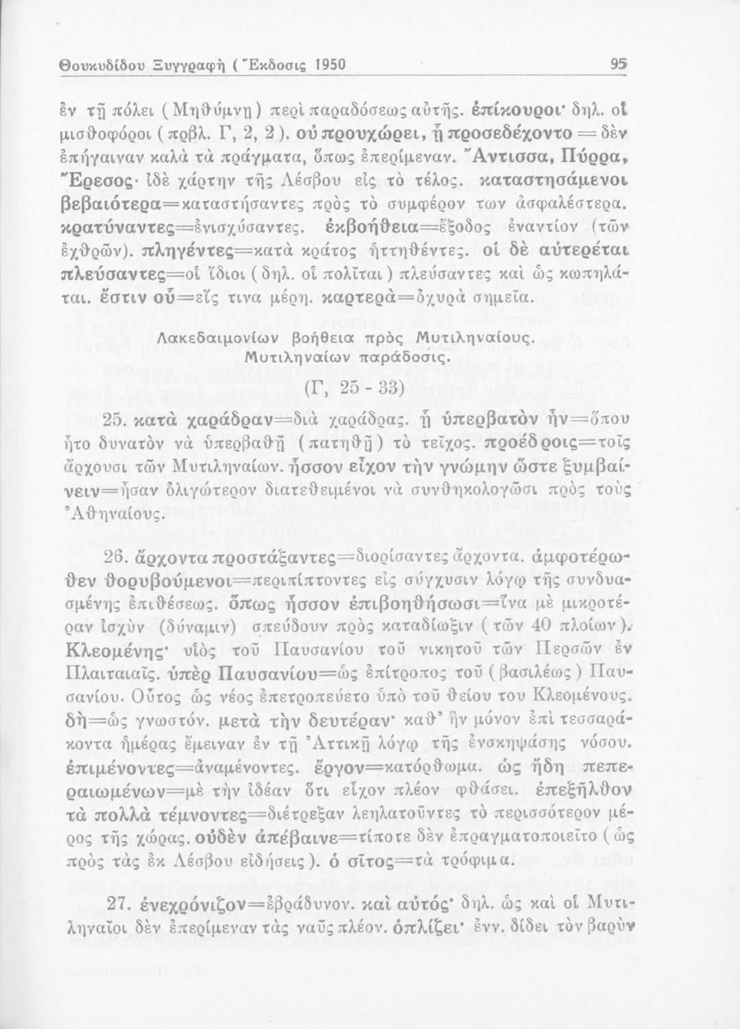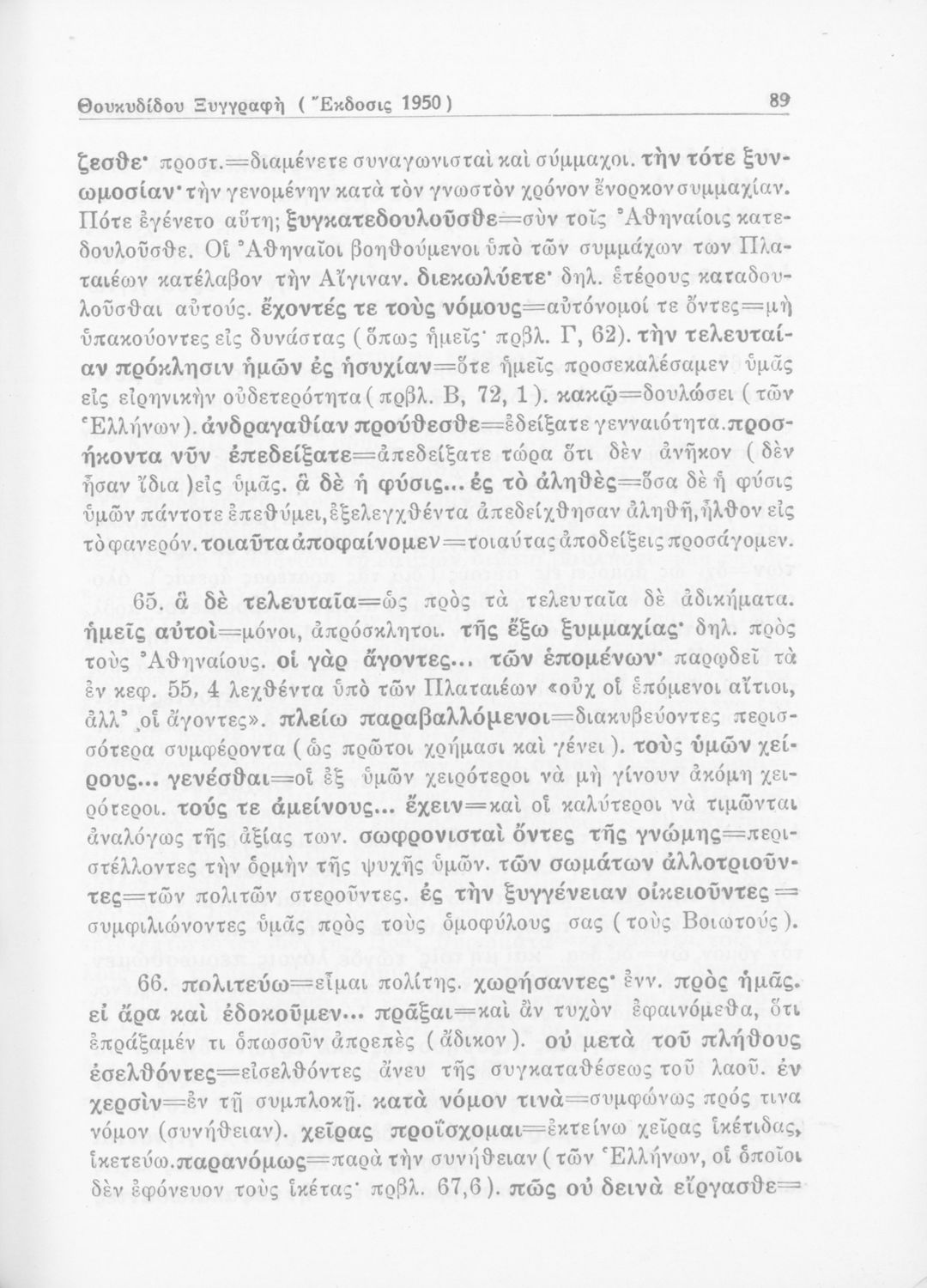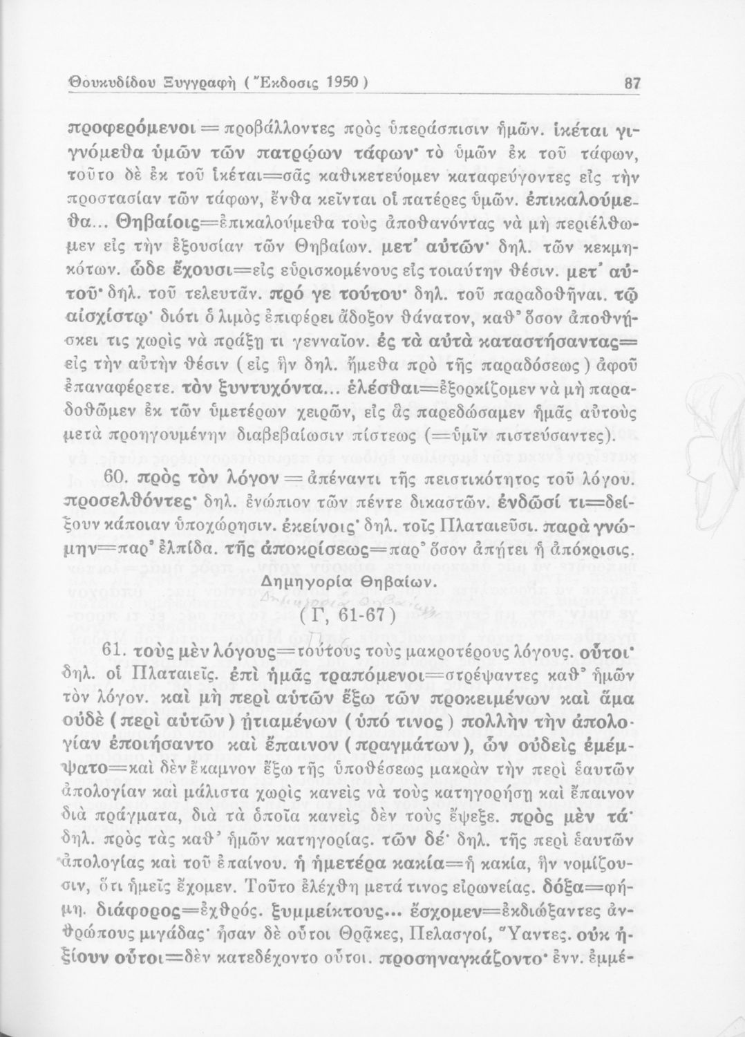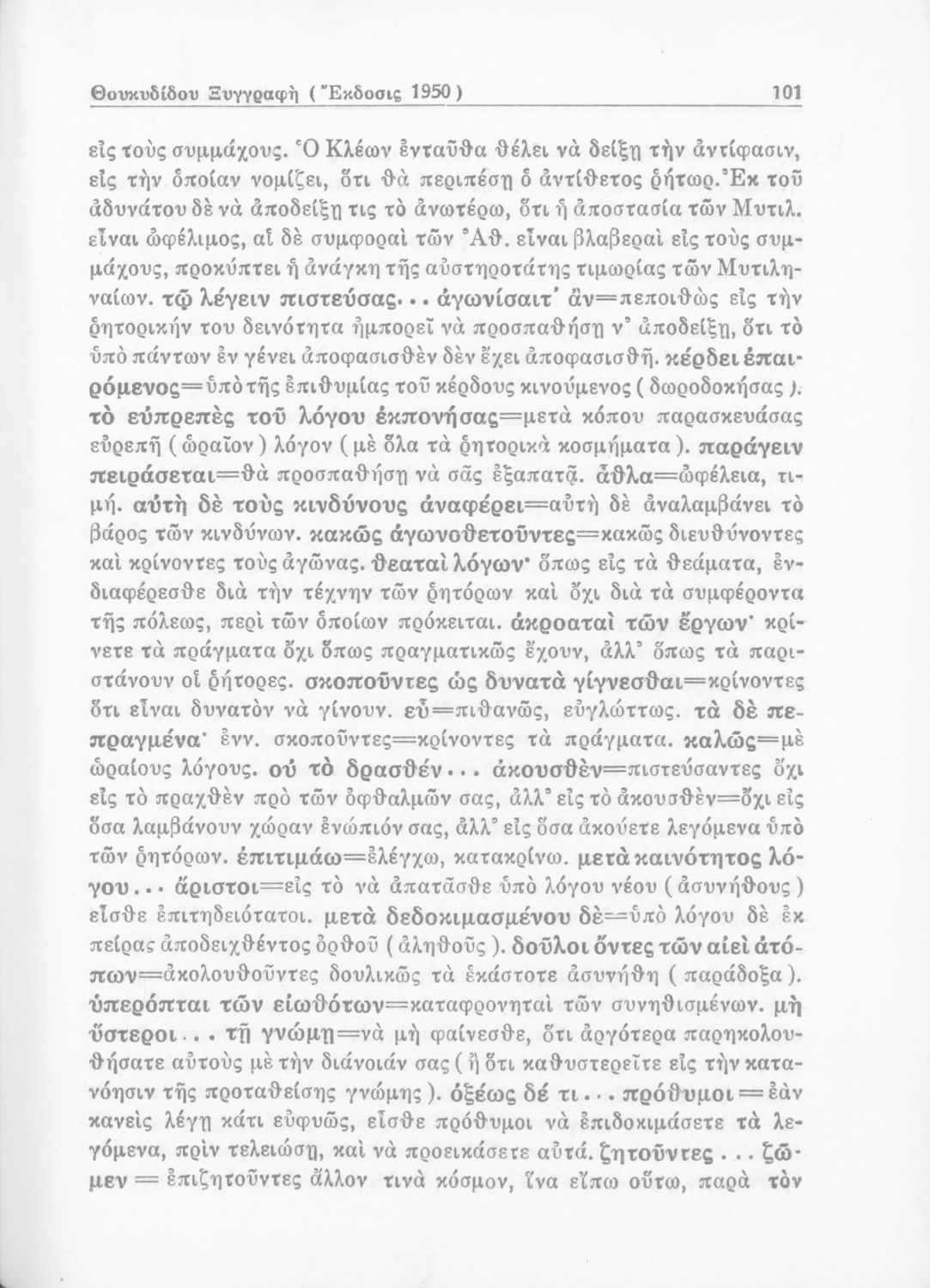 Σχολικό εγχειρίδιο Αρχαίων Ελληνικών Γυμνασίου που περιέχει εισαγωγή στη ζωή και το έργο του Θουκυδίδη, αποσπάσματα από τα Πλαταιϊκά, τα Λεσβιακά και τον Επιτάφιο του Περικλή και ερμηνευτικές σημειώσεις.