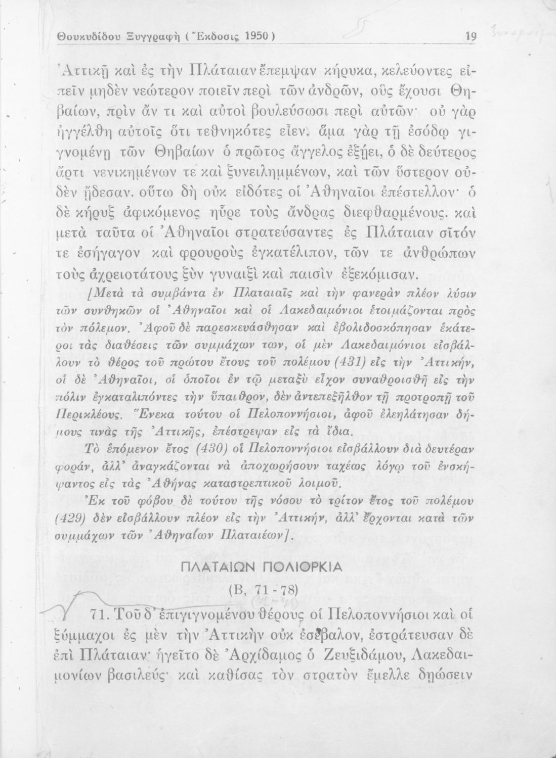 Σχολικό εγχειρίδιο Αρχαίων Ελληνικών Γυμνασίου που περιέχει εισαγωγή στη ζωή και το έργο του Θουκυδίδη, αποσπάσματα από τα Πλαταιϊκά, τα Λεσβιακά και τον Επιτάφιο του Περικλή και ερμηνευτικές σημειώσεις.
