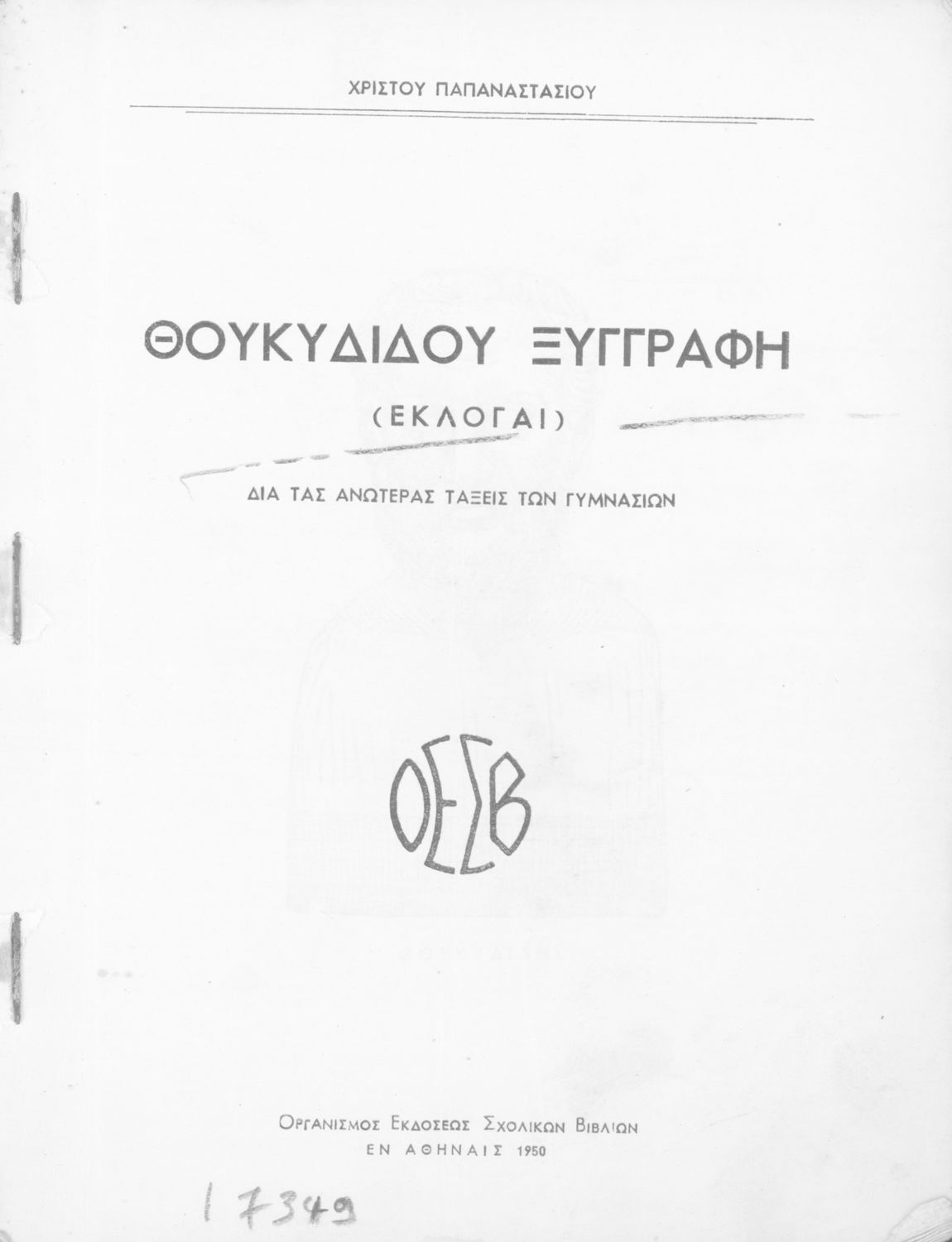 Σχολικό εγχειρίδιο Αρχαίων Ελληνικών για τις τάξεις του Γυμνασίου το οποίο περιέχει αποσπάσματα από το έργο του Θουκυδίδη, εισαγωγή στη ζωή και το έργο του και ερμηνευτικές σημειώσεις.