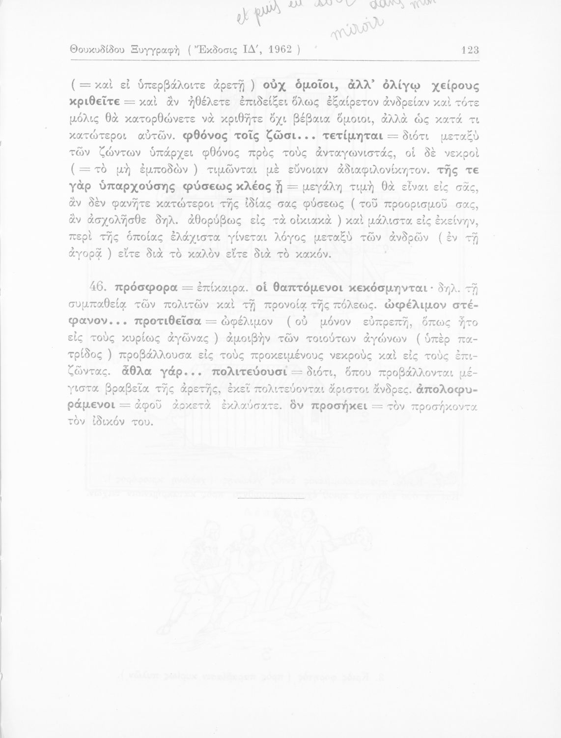 Σχολικό εγχειρίδιο Αρχαίων Ελληνικών Δ΄, Ε΄ και ΣΤ΄ Γυμνασίου που περιέχει αποσπάσματα από το έργο του Θουκυδίδη Ιστορία, ερμηνευτικά και πραγματολογικά σχόλια, και γραμματικές παρατηρήσεις του συγγραφέα.