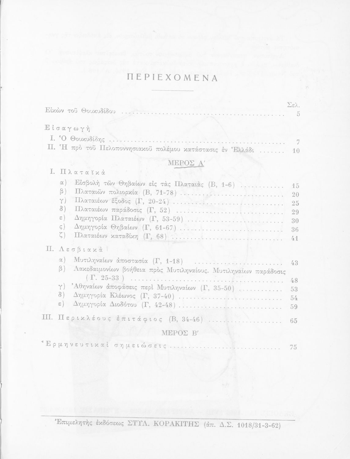 Σχολικό εγχειρίδιο Αρχαίων Ελληνικών για τις Δ΄, Ε΄ και ΣΤ΄ Γυμνασίου παλαιού τύπου που περιλαμβάνει σύντομο βιογραφικό σημείωμα του Θουκυδίδη, περιγραφή του ιστορικού πλαισίου, αποσπάσματα από τα Πλαταϊκά, τα