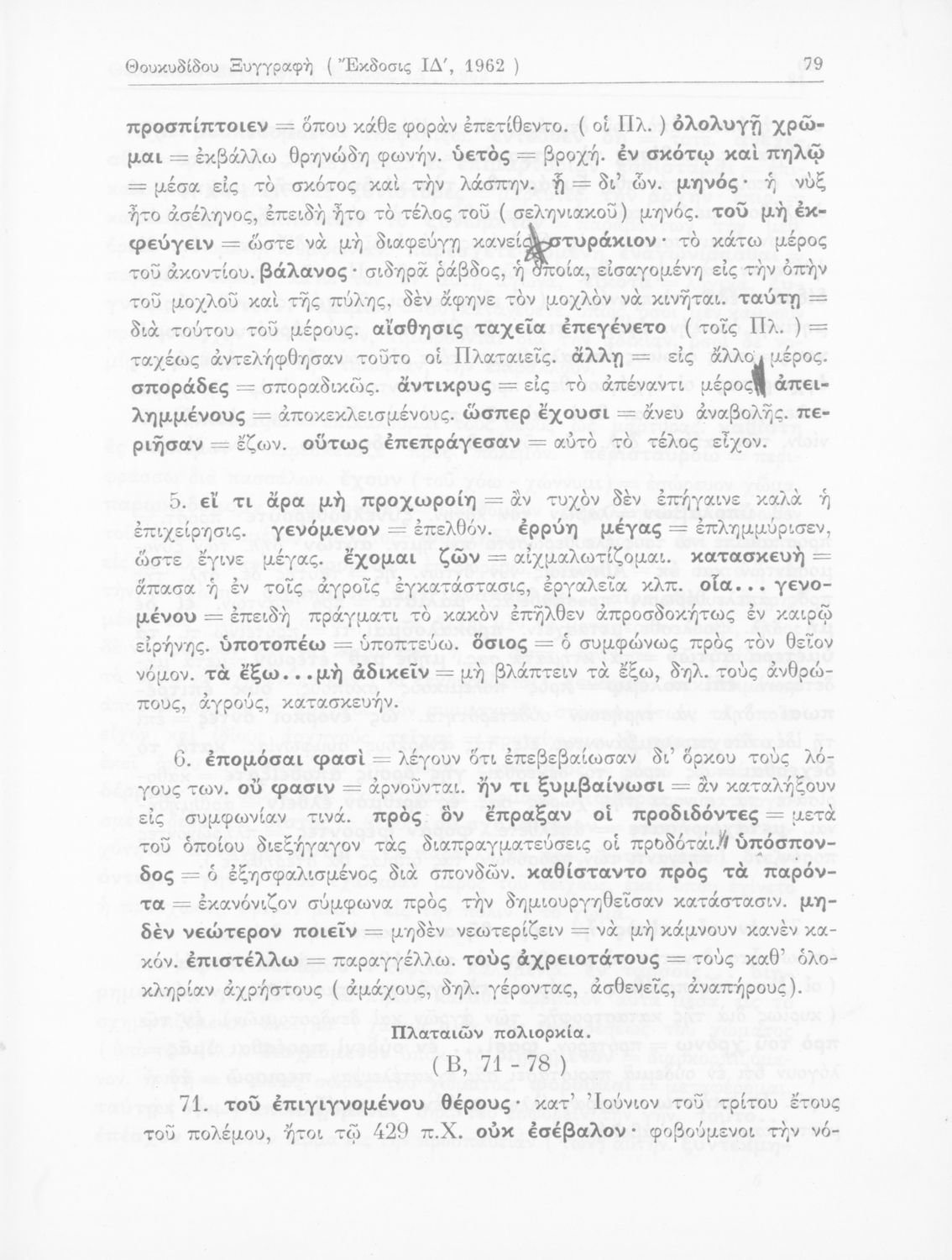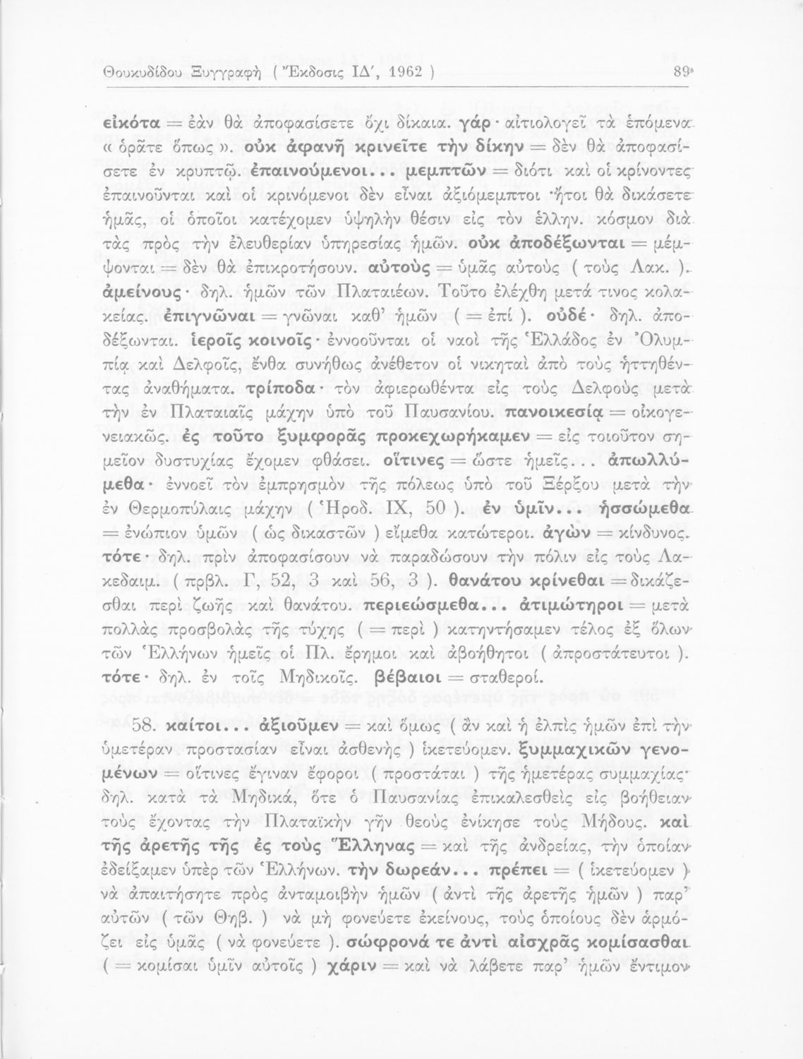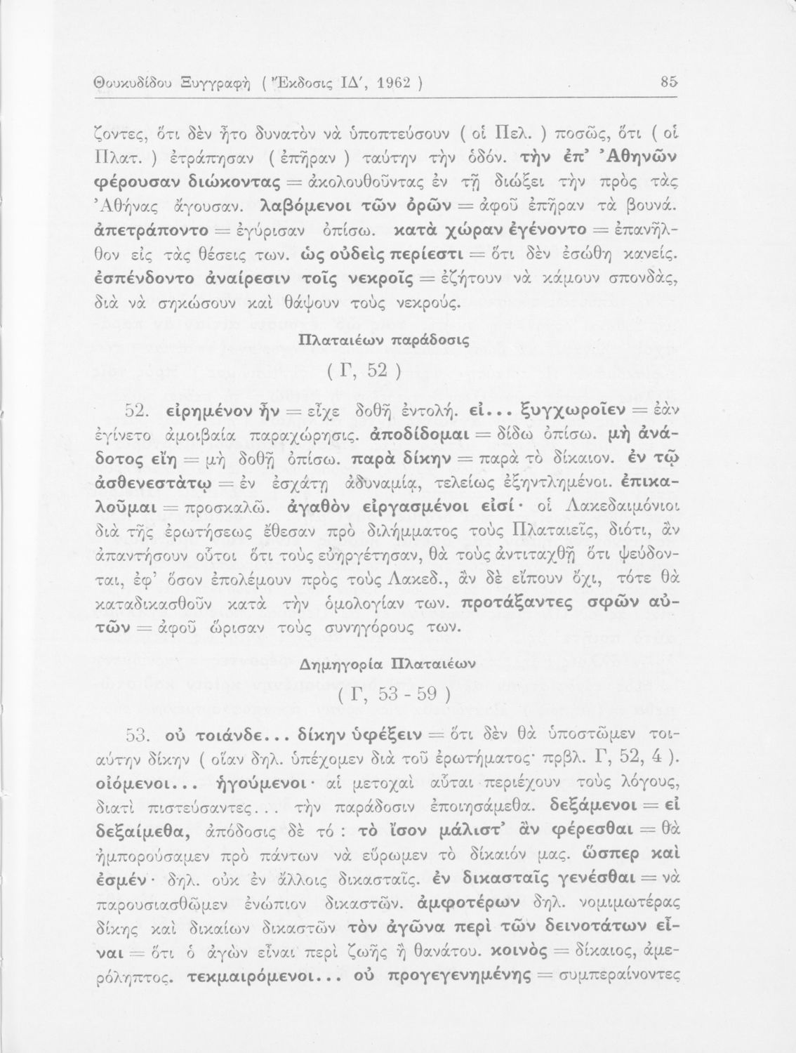 Σχολικό εγχειρίδιο Αρχαίων Ελληνικών για τις Δ΄, Ε΄ και ΣΤ΄ Γυμνασίου παλαιού τύπου που περιλαμβάνει σύντομο βιογραφικό σημείωμα του Θουκυδίδη, περιγραφή του ιστορικού πλαισίου, αποσπάσματα από τα Πλαταϊκά, τα