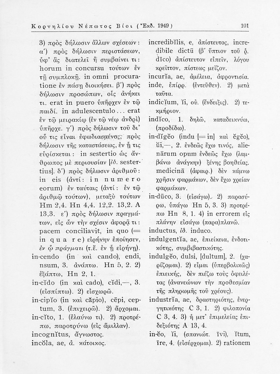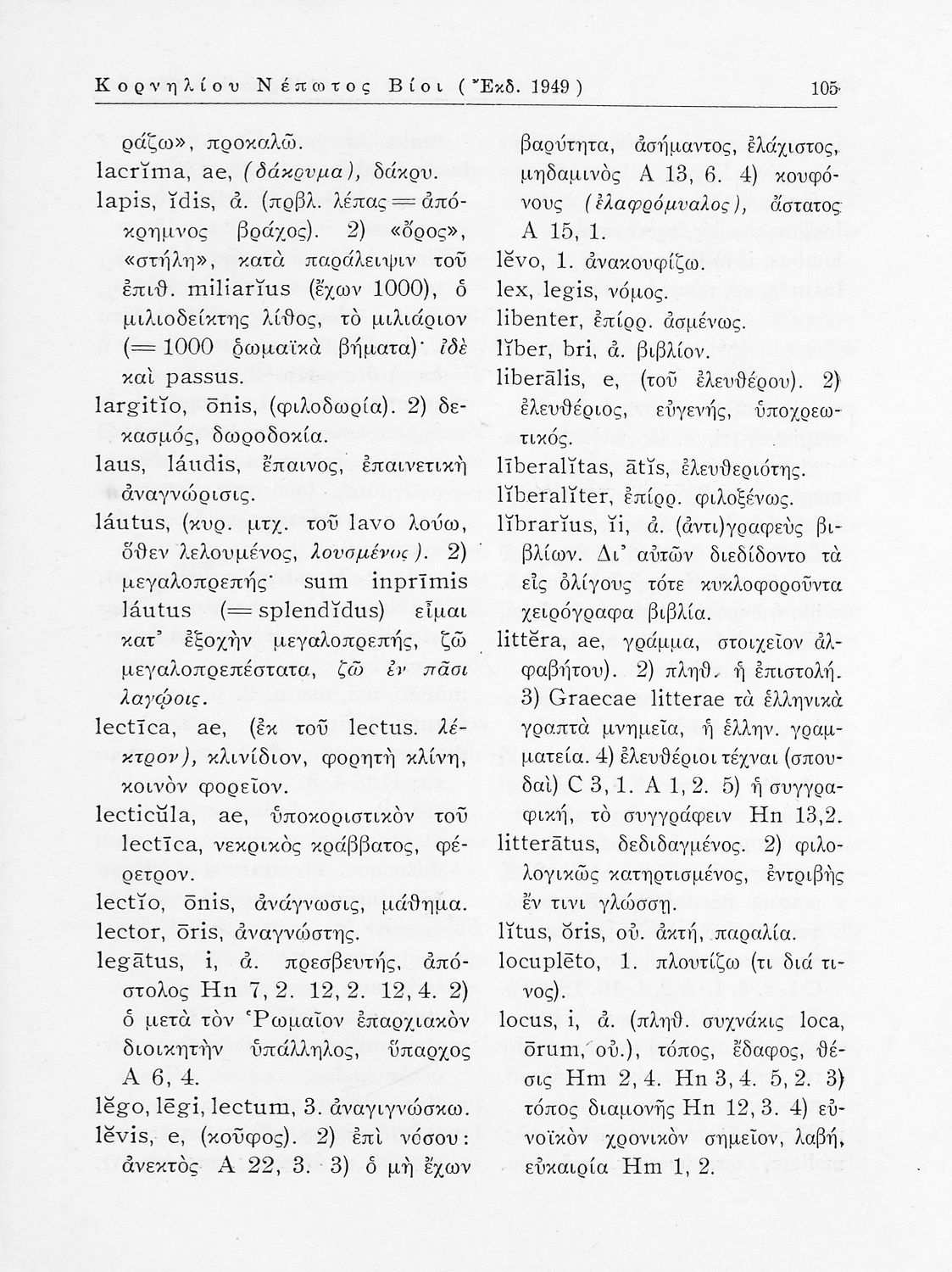 LDR 01336 2200193 4500 035 ## _a01-17355 040 ## _aΙνστιτούτο Εκπαιδευτικής Πολιτικής 041 ## _ael 100 ## _aΚορνήλιος Νέπως (Cornelius Nepos) _aΕρρίκος Α. Σκάσσης (σχόλια) 110 ## _a17355 245 0# _aΚορνηλίου Νέπωτος Βίοι (Εκλογαί) δια την Δ΄ τάξιν των Γυμνασίων παλαιού τύπου 260 ## _aΑθήνα _bΟργανισμός Εκδόσεως Σχολικών Βιβλίων _c1949 300 ## _a134 _c20 520 ## _aΣχολικό εγχειρίδιο Λατινικών Δ΄ Γυμνασίου που περιέχει σύντομο βιογραφικό σημείωμα του Νέπωτα, αποσπάσματα από τα έργα Αμίλκας, Αννίβας, Κάτων και Αττικός, ιστορικό και γεωγραφικό πίνακα και λεξιλόγιο. Ο συγγραφέας ήταν καθηγητής της Λατινικής Φιλολογίας στο Πανεπιστήμιο Αθηνών 521 ## _aΔ' Γυμνασίου παλαιού τύπου 522 ## _aΕλλάδα 546 ## _aΚαθαρεύουσα 563 ## _aΜαλακό Εξώφυλλο 650 #4 _aAtticus _aCato _aHamilcar _aHannibal
